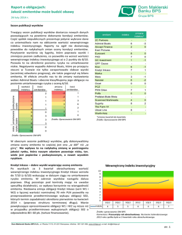 Raport o obligacjach: Jakośd emitentów może budzid obawy y, r. 26 luty 2014 r. Sezon publikacji wyników Trwający sezon publikacji wyników dostarcza nowych danych pozwalających na powtórne dokonanie kondycji emitentów. Częśd spółek niepublicznych prezentuje jedynie wybrane dane co uniemożliwia nam na obliczenie wartości wewnętrznego indeksu inwestycyjnego. Raporty na ogół nie dostarczają powodów do radykalnych zmian oceny kondycji emitentów. Pozytywnie wyróżnia się Sygnity, które poprawia wyniki i zmniejsza poziom zadłużenia, co pozwoliło na wzrost wartości wewnętrznego indeksu inwestycyjnego aż o 2 punkty do 8/10. Pozwala to na określenie poziomu ryzyka na umiarkowanie niskie. Negatywnie wypadło Admiral Boats, które po przejęciu stoczni w Tczewie nie tylko zaraportowało słabsze wyniki (wcześniej odwołano prognozę), ale także pogorszył się bilans emitenta. W efekcie zmusiło nas to do zmiany nastawienia wobec Admiral Boats i obecnie klasyfikujemy jego obligacje na poziomie umiarkowanego ryzyka z oceną 6/10. niskie umiarkowane podwyższone ryzyko ryzyko ryzyko ocena wartość indeksu ilość emitentów ilość emitentów zmiana indeksu 0 2 -3 1 1 1 -2 1 2 1 -1 3 3 1 0 6 4 1 1 2 0 2 1 6 3 3 0 7 3 8 3 9 0 10 0 5 Źródło: Opracowanie DM BPS emitent zmiana indeksu* indeks 2C Partners Admiral Boats Akcept Finance East Pictures Eurocent FKD GC Investment GPF Causa Klon Kredyt Inkaso Marka Mera Nanotel Orzeł PCZ PKN Orlen Polfa Prefabet-Białe Błota Scanmed Multimedis Sygnity The Farm 51 Uboat Line Werth-Holz 6 2 8 7 1 6 7 3 6 0 7 0 4 8 8 - -3 0 0 0 -1 -1 1 -1 -2 0 1 0 0 2 - *zmiana kwartał do kwartału Źródło: Opracowanie DM BPS Źródło: Opracowanie DM BPS W obecnym sezonie publikacji wyników, gdy dokonywaliśmy zmiana oceny emitenta to częściej jest ona „w dół” niż „w górę”. Nie wpływa to na radykalną zmianę w postrzeganiu jakości rynku, która naszym zdaniem pozostaje niska, tzn. wiele jest papierów z podwyższonym, a nawet wysokim ryzykiem. Kredyt Inkaso – dobre wyniki wspierając ocenę emitenta Po wynikach za 3 kwartał obrachunkowy wartośd wewnętrzengo indeksu inwestycyjnego Kredyt Inkaso wzrosła do 7/10 (z 6/10) wskazując w dalszym ciągu na umiarkowane ryzyko emitenta. W zakresie wyników nastąpiła dalsza poprawa. Dług pozostaje pod kontrolą mając na uwadze specyfikę działalności, co wpływa korzystnie na wiarygodnośd emitenta. Niedawna emisja obligacji Kredyt Inkaso (serii W1 i W2) o łącznej wartości nominalnej 70 mln PLN pozwoliła na przeprowadzenie przedterminowego wykupu obligacji S02, których termin zapadalności określono pierwotnie na kwiecieo 2014 r. (poprawa struktury terminowej długu). Marże powiększające oprocentowanie obligacji W1 i W2 są niższe niż w przypadku przedterminowo wykupionych obligacji S02 o odpowiednio 80 i 60 pb. (taosze finansowanie). Wewnętrzny indeks inwestycyjny 10 9 8 7 6 5 4 3 2 1 0 indeks 1Q12 2Q12 3Q12 2012 1Q13 2Q13 3Q13 6 5 5 6 6 6 7 Źródło: opracowanie DM BPS Komentarz: Przesunięty rok obrachunkowy. Na koniec kalendarzowego 2013 roku spółka była w 3 kwartale roku obrachunkowego. Dom Maklerski Banku BPS S.A., ul. Płocka 11/13, 01-231 Warszawa, infolinia: 801 321 456, www.dmbps.pl, e-mail: [email protected] str. 1 Raport o obligacjach: Jakośd emitentów może budzid obawy y, r. 26 luty 2014 r. Best – możliwe pogorszenie oceny emitenta Best, czyli kolejny przedstawiciel branży wierzytelnościowej nie podał jeszcze wyników za 2013 r. Natomiast uchwalono program zakładający emisję obligacji o łącznej wartości nominalnej do 300 mln PLN. Widad, że emitent zamierza badzo dynamicznie rozwijad się, gdyż dotychczasowy poziom aktywów Grupy Best wynosił ok. 250 mln PLN. Niesie to pewne ryzyko, że przy nasilającej się konkurencji emitent może nabyd wierzytelności wymagające poniesienia większych kosztów, które są obarczone większym ryzykiem przy możliwym niższym potencjalnym zysku. Ponadto ze względu na konstrukcję naszego wewnętrzengo indeksu inwestycyjnego, może to wpłynąd w przyszłości na obniżenie oceny emitenta w przypadku przeprowadzenia dużej wielkości emisji (nagły i silny wzrost długu). Do tej pory Best był bardzo pozytywnie przez nas postrzegany ze względu na bardzo niski poziom zadłużenia, co ograniczało ryzyko tego emitenta. Obecnie wartośd wewnętrznego indeksu inwestycyjnego dla Best wynosi 10/10, co wskazuje na niski poziom ryzyka. Obligacje Best mogą zostad wykupione na żądanie obligatariusza m.in. w przypadku przekroczenia progu wskaźnika zadłużenia, który wynosi 2,0x dla serii G i 2,5x dla serii I. Gino Rossi – szansa na ekstra zyski Obligacje Gino Rossi (seria A) są jednym z naszych typów inwestycyjnych w ramach portfela IKE. Wartośd wewnętrznego indeksu inwestycyjnego dla tego emitenta wynosi 5/10, czyli na poziomie wskazującym umiarkowanie wysokie ryzyko. Typ inwestycyjny był poparty naszymi oczekiwaniami z rekomendacji, że spółka będzie w stanie wykupid 2 serie obligacji zapadających w 2015 r przy jednoczesnym zaciągnieciu długu bankowego w wysokości 10 mln PLN. Przy czym nie wykluczamy, że w przyszłości emitent może skorzystad z opcji przedterminowego wykupu obligacji. W takiej sytuacji Gino Rossi musiałoby wypłacid premię obligatariuszom w wysokości 3% wartości nominalnej obligacji. Scenariusz ten wydaje się możliwy, gdy spółka zaraportuje poprawę wyników, co może jej umożliwid pozyskanie taoszego finansowania z banku, które posłużyłoby wykupowi obligacji. Wyniki za 4Q’13 zostaną opublikowane 3 marca. Uchwalony pod koniec ubiegłego roku program motywacyjny zakłada poprawę wyników na poziomie EBITDA, co dodatkowo wspiera nasze oczekiwania w zakresie szansy na realizację wskazanego przez nas scenariusza. Przy czym gdyby nie został on zrealizowany to wówczas zyski ograniczyłyby się do uzyskiwanych odsetek, które będą wysokie ma