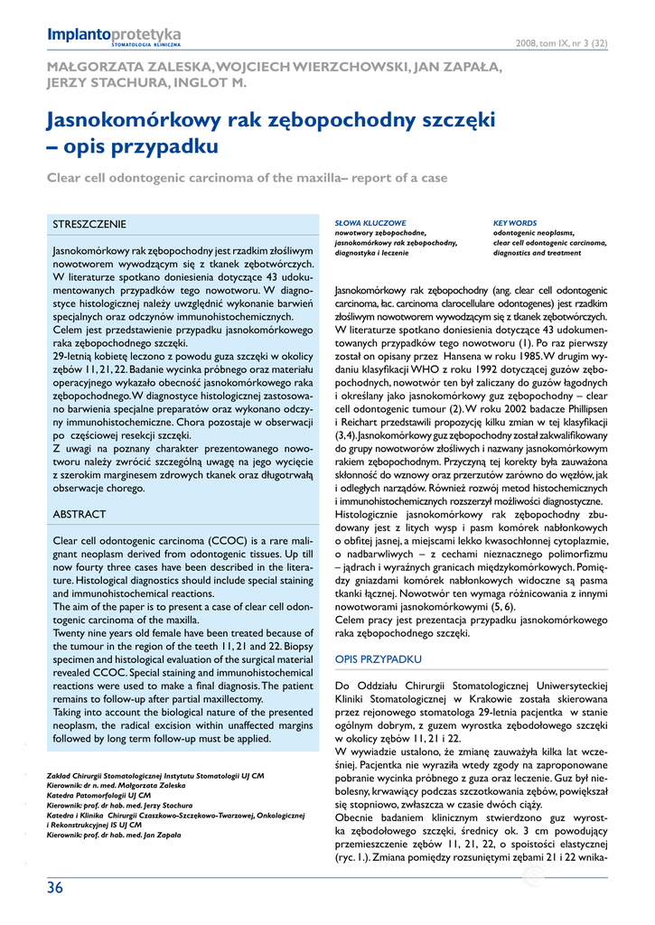 Implantoprotetyka 2008, tom IX, nr 3 (32) S TO M ATO L O G I A K L I N I C Z NA Małgorzata Zaleska, Wojciech Wierzchowski, Jan Zapała, Jerzy Stachura, Inglot M. Jasnokomórkowy rak zębopochodny szczęki – opis przypadku Clear cell odontogenic carcinoma of the maxilla– report of a case Streszczenie Jasnokomórkowy rak zębopochodny jest rzadkim złośliwym nowotworem wywodzącym się z tkanek zębotwórczych. W literaturze spotkano doniesienia dotyczące 43 udokumentowanych przypadków tego nowotworu. W diagnostyce histologicznej należy uwzględnić wykonanie barwień specjalnych oraz odczynów immunohistochemicznych. Celem jest przedstawienie przypadku jasnokomórkowego raka zębopochodnego szczęki. 29-letnią kobietę leczono z powodu guza szczęki w okolicy zębów 11, 21, 22. Badanie wycinka próbnego oraz materiału operacyjnego wykazało obecność jasnokomórkowego raka zębopochodnego. W diagnostyce histologicznej zastosowano barwienia specjalne preparatów oraz wykonano odczyny immunohistochemiczne. Chora pozostaje w obserwacji po częściowej resekcji szczęki. Z uwagi na poznany charakter prezentowanego nowotworu należy zwrócić szczególną uwagę na jego wycięcie z szerokim marginesem zdrowych tkanek oraz długotrwałą obserwacje chorego. Clear cell odontogenic carcinoma (CCOC) is a rare malignant neoplasm derived from odontogenic tissues. Up till now fourty three cases have been described in the literature. Histological diagnostics should include special staining and immunohistochemical reactions. The aim of the paper is to present a case of clear cell odontogenic carcinoma of the maxilla. Twenty nine years old female have been treated because of the tumour in the region of the teeth 11, 21 and 22. Biopsy specimen and histological evaluation of the surgical material revealed CCOC. Special staining and immunohistochemical reactions were used to make a final diagnosis. The patient remains to follow-up after partial maxillectomy. Taking into account the biological nature of the presented neoplasm, the radical excision within unaffected margins followed by long term follow-up must be applied. Zakład Chirurgii Stomatologicznej Instytutu Stomatologii UJ CM Kierownik: dr n. med. Małgorzata Zaleska Katedra Patomorfologii UJ CM Kierownik: prof. dr hab. med. Jerzy Stachura Katedra i Klinika Chirurgii Czaszkowo-Szczękowo-Twarzowej, Onkologicznej i Rekonstrukcyjnej IS UJ CM Kierownik: prof. dr hab. med. Jan Zapała - - - - - Abstract 36 Słowa kluczowe nowotwory zębopochodne, jasnokomórkowy rak zębopochodny, diagnostyka i leczenie Key words odontogenic neoplasms, clear cell odontogenic carcinoma, diagnostics and treatment Jasnokomórkowy rak zębopochodny (ang. clear cell odontogenic carcinoma, łac. carcinoma clarocellulare odontogenes) jest rzadkim złośliwym nowotworem wywodzącym się z tkanek zębotwórczych. W literaturze spotkano doniesienia dotyczące 43 udokumentowanych przypadków tego nowotworu (1). Po raz pierwszy został on opisany przez Hansena w roku 1985.W drugim wydaniu klasyfikacji WHO z roku 1992 dotyczącej guzów zębopochodnych, nowotwór ten był zaliczany do guzów łagodnych i określany jako jasnokomórkowy guz zębopochodny – clear cell odontogenic tumour (2). W roku 2002 badacze Phillipsen i Reichart przedstawili propozycję kilku zmian w tej klasyfikacji (3, 4). Jasnokomórkowy guz zębopochodny został zakwalifikowany do grupy nowotworów złośliwych i nazwany jasnokomórkowym rakiem zębopochodnym. Przyczyną tej korekty była zauważona skłonność do wznowy oraz przerzutów zarówno do węzłów, jak i odległych narządów. Również rozwój metod histochemicznych i immunohistochemicznych rozszerzył możliwości diagnostyczne. Histologicznie jasnokomórkowy rak zębopochodny zbudowany jest z litych wysp i pasm komórek nabłonkowych o obfitej jasnej, a miejscami lekko kwasochłonnej cytoplazmie, o nadbarwliwych – z cechami nieznacznego polimorfizmu – jądrach i wyraźnych granicach międzykomórkowych. Pomiędzy gniazdami komórek nabłonkowych widoczne są pasma tkanki łącznej. Nowotwór ten wymaga różnicowania z innymi nowotworami jasnokomórkowymi (5, 6). Celem pracy jest prezentacja przypadku jasnokomórkowego raka zębopochodnego szczęki. Opis przypadku Do Oddziału Chirurgii Stomatologicznej Uniwersyteckiej Kliniki Stomatologicznej w Krakowie została skierowana przez rejonowego stomatologa 29-letnia pacjentka w stanie ogólnym dobrym, z guzem wyrostka zębodołowego szczęki w okolicy zębów 11, 21 i 22. W wywiadzie ustalono, że zmianę zauważyła kilka lat wcześniej. Pacjentka nie wyraziła wtedy zgody na zaproponowane pobranie wycinka próbnego z guza oraz leczenie. Guz był niebolesny, krwawiący podczas szczotkowania zębów, powiększał się stopniowo, zwłaszcza w czasie dwóch ciąży. Obecnie badaniem klinicznym stwierdzono guz wyrostka zębodołowego szczęki, średnicy ok. 3 cm powodujący przemieszczenie zębów 11, 21, 22, o spoistości elastycznej (ryc. 1.). Zmiana pomiędzy rozsuniętymi zębami 21 i 22 wnika- 2008, tom IX, nr 3 (32) Implantoprotetyka S TO M ATO L O G I A K L I N I C Z NA Ryc. 5. Barwienie Alcjan blue i PAS - na terenie komórek widoczne PAS pozytywne ziarnistości. Ryc. 2. Guz obejmujący wyrostek zębodołowy od strony podniebiennej. Ryc. 6. Odczyn immunohistochemiczny na obecność cytokreatyn silnie dodatni w komórkach raka. Pow. 200 x. Ryc. 3. Pantomogram wykonany przed leczeniem. Ryc. 7. Ubytek poresekcyjny (stan po 10 miesiącach). Ryc. 4. Gniazda komórek raka o obfitej jasnej cytoplazmie poprzedzielane tkanką łączną. HE. pow. 400 x. Ryc. 8. Zaopatrzenie ubytku protezą poresekcyjną (brak zaburzeń czynnościowych i estetycznych). - - - - - Ryc. 1. Guz wyrostka zębodołowego szczęki. w w w. i m p l a n t o p r o t e t y k a . e u 37 Implantoprotetyka 2008, tom IX, nr 3 (32) S TO M ATO L O G I A K L I N I C Z NA ła na podniebienie twarde tej okolicy (ryc. 2.). O