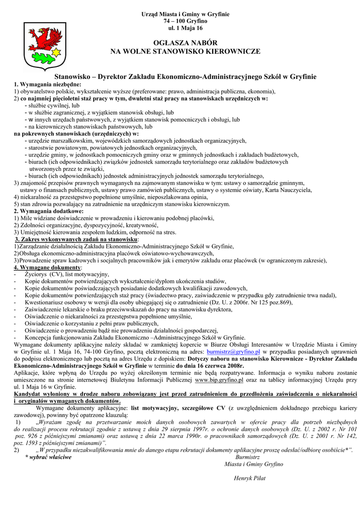 Urząd Miasta i Gminy w Gryfinie 74 – 100 Gryfino ul. 1 Maja 16 OGŁASZA NABÓR NA WOLNE STANOWISKO KIEROWNICZE Stanowisko – Dyrektor Zakładu Ekonomiczno-Administracyjnego Szkół w Gryfinie 1. Wymagania niezbędne: 1) obywatelstwo polskie, wykształcenie wyższe (preferowane: prawo, administracja publiczna, ekonomia), 2) co najmniej pięcioletni staż pracy w tym, dwuletni staż pracy na stanowiskach urzędniczych w: - służbie cywilnej, lub - w służbie zagranicznej, z wyjątkiem stanowisk obsługi, lub - w innych urzędach państwowych, z wyjątkiem stanowisk pomocniczych i obsługi, lub - na kierowniczych stanowiskach państwowych, lub na pokrewnych stanowiskach (urzędniczych) w: - urzędzie marszałkowskim, wojewódzkich samorządowych jednostkach organizacyjnych, - starostwie powiatowym, powiatowych jednostkach organizacyjnych, - urzędzie gminy, w jednostkach pomocniczych gminy oraz w gminnych jednostkach i zakładach budżetowych, - biurach (ich odpowiednikach) związków jednostek samorządu terytorialnego oraz zakładów budżetowych utworzonych przez te związki, - biurach (ich odpowiednikach) jednostek administracyjnych jednostek samorządu terytorialnego, 3) znajomość przepisów prawnych wymaganych na zajmowanym stanowisku w tym: ustawy o samorządzie gminnym, ustawy o finansach publicznych, ustawy prawo zamówień publicznych, ustawy o systemie oświaty, Karta Nauczyciela, 4) niekaralność za przestępstwo popełnione umyślnie, nieposzlakowana opinia, 5) stan zdrowia pozwalający na zatrudnienie na urzędniczym stanowisku kierowniczym. 2. Wymagania dodatkowe: 1) Mile widziane doświadczenie w prowadzeniu i kierowaniu podobnej placówki, 2) Zdolności organizacyjne, dyspozycyjność, kreatywność, 3) Umiejętność kierowania zespołem ludzkim, odporność na stres. 3. Zakres wykonywanych zadań na stanowisku: 1) Zarządzanie działalnością Zakładu Ekonomiczno-Administracyjnego Szkół w Gryfinie, 2) Obsługa ekonomiczno-administracyjna placówek oświatowo-wychowawczych, 3) Prowadzenie spraw kadrowych i socjalnych pracowników jak i emerytów zakładu oraz placówek (w ograniczonym zakresie), 4. Wymagane dokumenty: - Życiorys (CV), list motywacyjny, - Kopie dokumentów potwierdzających wykształcenie/dyplom ukończenia studiów, - Kopie dokumentów poświadczających posiadanie dodatkowych kwalifikacji zawodowych, - Kopie dokumentów potwierdzających staż pracy (świadectwo pracy, zaświadczenie w przypadku gdy zatrudnienie trwa nadal), - Kwestionariusz osobowy w wersji dla osoby ubiegającej się o zatrudnienie (Dz. U. z 2006r. Nr 125 poz.869), - Zaświadczenie lekarskie o braku przeciwwskazań do pracy na stanowisku dyrektora, - Oświadczenie o niekaralności za przestępstwa popełnione umyślnie, - Oświadczenie o korzystaniu z pełni praw publicznych, - Oświadczenie o prowadzeniu bądź nie prowadzeniu działalności gospodarczej, - Koncepcja funkcjonowania Zakładu Ekonomiczno –Administracyjnego Szkół w Gryfinie. Wymagane dokumenty aplikacyjne należy składać w zamkniętej kopercie w Biurze Obsługi Interesantów w Urzędzie Miasta i Gminy w Gryfinie ul. 1 Maja 16, 74-100 Gryfino, pocztą elektroniczną na adres: [email protected] w przypadku posiadanych uprawnień do podpisu elektronicznego lub pocztą na adres Urzędu z dopiskiem: Dotyczy naboru na stanowisko Kierownicze - Dyrektor Zakładu Ekonomiczno-Administracyjnego Szkół w Gryfinie w terminie do dnia 16 czerwca 2008r. Aplikacje, które wpłyną do Urzędu po wyżej określonym terminie nie będą rozpatrywane. Informacja o wyniku naboru zostanie umieszczone na stronie internetowej Biuletynu Informacji Publicznej www.bip.gryfino.pl oraz na tablicy informacyjnej Urzędu przy ul. 1 Maja 16 w Gryfinie. Kandydat wyłoniony w drodze naboru zobowiązany jest przed zatrudnieniem do przedłożenia zaświadczenia o niekaralności i oryginałów wymaganych dokumentów. Wymagane dokumenty aplikacyjne: list motywacyjny, szczegółowe CV (z uwzględnieniem dokładnego przebiegu kariery zawodowej), powinny być opatrzone klauzulą: 1) „Wyrażam zgodę na przetwarzanie moich danych osobowych zawartych w ofercie pracy dla potrzeb niezbędnych do realizacji procesu rekrutacji zgodnie z ustawą z dnia 29 sierpnia 1997r. o ochronie danych osobowych (Dz. U. z 2002 r. Nr 101 poz. 926 z późniejszymi zmianami) oraz ustawą z dnia 22 marca 1990r. o pracownikach samorządowych (Dz. U. z 2001 r. Nr 142, poz. 1593 z późniejszymi zmianami)”. 2) „W przypadku niezakwalifikowania mnie do danego etapu rekrutacji dokumenty aplikacyjne proszę odesłać/odbiorę osobiście*”. * wybrać właściwe Burmistrz Miasta i Gminy Gryfino Henryk Piłat