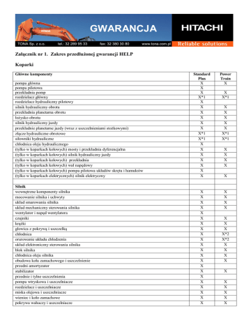 GWARANCJA TONA Sp. z o.o. tel.: 32 289 95 33 fax: 32 380 30 80 www.tona.com.pl Załącznik nr 1. Zakres przedłużonej gwarancji HELP Koparki Główne komponenty pompa główna pompa pilotowa przekładnia pomp rozdzielacz główny rozdzielacz hydrauliczny pilotowy silnik hydrauliczny obrotu przekładnia planetarna obrotu łożysko obrotu silnik hydrauliczny jazdy przekładnie planetarne jazdy (wraz z uszczelnieniami stożkowymi) złącze hydrauliczne obrotowe siłowniki hydrauliczne chłodnica oleju hydraulicznego (tylko w koparkach kołowych) mosty i przekładnia dyferencjalna (tylko w koparkach kołowych) silnik hydrauliczny jazdy (tylko w koparkach kołowych) przekładnia (tylko w koparkach kołowych) wał napędowy (tylko w koparkach kołowych) pompa pilotowa układów skrętu i hamulców (tylko w koparkach elektrycznych) silnik elektryczny Silnik wewnętrzne komponenty silnika mocowanie silnika i uchwyty układ smarowania silnika układ mechaniczny sterowania silnika wentylator i napęd wentylatora czujniki krążki głowica z pokrywą i uszczelką chłodnica orurowanie układu chłodzenia układ elektroniczny sterowania silnika blok silnika chłodnica oleju silnika obudowa koła zamachowego i uszczelnienie przedni amortyzator stabilizator przednie i tylne uszczelnienia pompa wtryskowa i uszczelniacze rozdzielacz i uszczelniacze miska olejowa i uszczelniacze wieniec i koło zamachowe pokrywa wahaczy i uszczelniacze Standard Plus X X X X*1 X X X X X X X*1 X*1 X X X X X X X Power Train X X X X X X X X X X X X X X X X X X X X X X X X X X X X X*1 X X X X X X*1 X*1 X X X X X X X X X*2 X*2 X X X X X X X X X X alternator rozrusznik termostaty turbina i uszczelniacze pompa wody i uszczelniacze układ common rail chłodnica EGR, zawór, rozdzielacz i uszczelniacze kontroler silnia ECM bloki cylindrów wałek i łożyska wałka rozrządu, wał korbowy i łożyska wału korbowody popychacze pompka paliwowa układ Common rail i PCV wtryskiwacze mechanizm rozrządu i obudowę rozrządu układ wydechowy / tłumik głowica filtra olejowego linia paliwowa zbiornik paliwa i osprzęt tłoki pierścienie tłoków łańcuch / pasek rozrządu zawory sprężyny i uchwyty zaworów wałek rozrządu wałek popychaczy pompa olejowa dźwignie zaworowe X X X X X X X X X X X X X X X X X X X X X X X X X X X X X X Hamulce (tylko w koparkach kołowych) zawór hamulca (tylko w koparkach kołowych) hamulec postojowy (tylko w koparkach kołowych) układ hamulcowy X X X Układ sterowania (tylko w koparkach kołowych) zawór priorytetowy (tylko w koparkach kołowych) awaryjny system skrętu (tylko w koparkach kołowych) układ skrętu (tylko w koparkach kołowych) zawory sterujące i siłownik skrętu X X X X Elektryka monitor kontroler komunikacji kontroler główny kontroler GPS czujniki przełączniki silniki wycieraczek wiązka elektryczna (tylko w koparkach elektrycznych) rozdzielnia (tylko w koparkach elektrycznych) złącze obrotowe X X X X X X X X X X Komponenty maszyn hybrydowych silnik obrotu X X X X X X X X X X X X X X X X X X X X X X X X X X X X X dodatkowy silnik elektryczny obrotu kontroler mocy PCU jednostka kondensatorów X X X Klimatyzacja fabryczna kompresor skraplacz osuszacz parownik zawór rozprężający przewód nagrzewnicy uszczelniacze kontroler klimatyzatora X X X X X X X X Konstrukcja rama główna rama dolna gąsienicy – za wyjątkiem gwiazdy napędowej, koła napinającego, dolnych i górnych rolek jezdnych, napinaczy gąsienic, płytek oraz łańcuchów gąsienic, wysięgnik maszyny ramię maszyny kabina koła napędowe gąsienic napinacze gąsienic dolne i górne rolki płytki i ogniwa gąsienic rama sinika X X X X X X*3 X*3 X X X X X X X X X*3 X*3 *1 dotyczy tylko złamań, pęknięć, nie dotyczy wycieków, przecieków, usterek zaworów, złuszczenia powierzchni *2 Power Train: nie zawiera przewodów hydraulicznych *3 dotyczy koparek powyżej 100 ton Ładowarki kołowe Komponenty hydrauliczne i podzespoły jazdy Siłowniki hydrauliczne Rozdzielacz główny Zawór pilotowy Skrzynia biegów Mosty i dyferencjały Obudowa sprzęgła Wał napędowy Sprzęgło hydrokinetyczne pompa HST silnik HST Zawór układu pływającej łyżki Pompa główna I pompa wentylatora Układ sterowania pompa hamulcowa Silnik * wewnętrzne komponenty silnika mocowanie silnika i uchwyty układ smarowania silnika układ mechaniczny sterowania silnika wentylator i napęd wentylatora czujniki krążki X*1 X*1 X X X X X*1 X X X X X X X*1 X*1 X X X X X*1 X X X X X X X X X X X X X X X X X X X X głowicę z pokrywą i uszczelką X chłodnica X orurowanie układu chłodzenia X układ elektroniczny sterowania silnika X blok silnika X chłodnica oleju silnia X obudowa koła zamachowego i uszczelnienie X stabilizator X przedni amortyzator X przednie i tylne uszczelnienia X hydraulic actuator X pompa wtryskowa i uszczelniacze X rozdzielacz i uszczelniacze X miska olejowa i uszczelniacze X wieniec i koło zamachowe X pokrywa wahaczy i uszczelniacze X alternator X rozrusznik termostaty X turbina i uszczelniacze X pompa wody i uszczelniacze X układ Common rail X chłodnica EGR, zawór, rozdzielacz i uszczelniacze X kontroler silnika ECM X bloki cylindrów X dławica X wałek rozrządu X wał korbowy X korbowody X popychacze X mechanizm rozrządu i obudowę rozrządu X pompka paliwowa X układ Common rail i PCV X wtryskiwacze X mechanizm rozrządu i obudowę rozrządu X układ wydechowy / tłumik X głowica filtra olejowego X linia paliwowa X X zbiornik paliwa i osprzęt tłoki X pierścienie tłoków X łańcuch / pasek rozrządu X zawory X sprężyny i uchwyty zaworów X wałek rozrządu X wałek popychaczy X pompa olejowa X dźwignie zaworowe X * ładowarki z silnikami Cummins do modelu ZW220 i mniejsze, są one objęte przedłużoną gwarancją *1 dotyczy tylko złamań, pęknięć, nie dotyczy wycieków, przecieków, usterek zaworów, złuszczenia powierzchni *2 Power Train: nie zawiera przewodów hydraulicznych Hamulce 