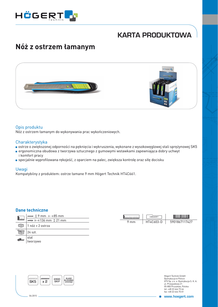KARTA PRODUKTOWA Nóż z ostrzem łamanym Opis produktu Nóż z ostrzem łamanym do wykonywania prac wykończeniowych. Charakterystyka ostrze o zwiększonej odporności na pęknięcia i wykruszenia, wykonane z wysokowęglowej stali sprężynowej SK5 ergonomiczna obudowa z tworzywa sztucznego z gumowymi wstawkami zapewniająca dobry uchwyt i komfort pracy specjalnie wyprofilowana rękojeść, z oparciem na palec, zwiększa kontrolę oraz siłę docisku Uwagi Kompatybilny z produktem: ostrze łamane 9 mm Högert Technik HT4C661. Dane techniczne 9 mm 85 mm 136 mm 21 mm 1 nóż + 2 ostrza 9 mm HT4C603-D 5901867117427 24 szt. stal tworzywo Högert Technik GmbH Dystrybucja w Polsce GTV Sp. z o. o. Dystrybucja S. K. A. ul. Przejazdowa 21 05-800 Pruszków, Polska tel. +48 22 444 73 44 fax +48 22 444 75 01 06.2015 www.hoegert.com