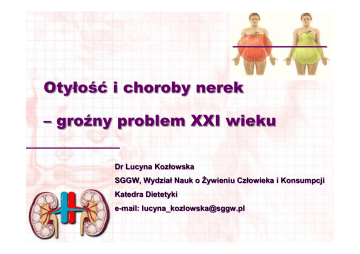 Otyłość i choroby nerek – groźny problem XXI wieku Dr Lucyna Kozłowska SGGW, Wydział Nauk o śywieniu Człowieka i Konsumpcji Katedra Dietetyki e-mail: [email protected] Nadwaga + otyłość 25% 27% Nadwaga + otyłość 29% 32% Czynniki ryzyka rozwoju PChN cukrzyca nadciśnienie tętnicze dyslipidemia nadwaga i otyłość choroby autoimmunologiczne zakaŜenia układowe, zakaŜenia dróg moczowych kamica moczowa przeszkoda w dolnych drogach moczowych nowotwory 30000 27500 25000 19000 20000 15000 13657 10000 5000 7898 3648 0 1990 1996 2001 2005 2010 Leczenie nerkozastępcze w Polsce oraz przewidywania dotyczące dalszego jego rozwoju w następnych latach Rutkowski. Problemy Lekarskie, 2003, 42, 23-27. Badanie PolNef Wysłano zaproszenie - 9700 Ilość osób zgłoszonych - 2471 albuminuria (dipstick test +) 15.6% 38,157 mil miesz. Polski ►osoby dorosłe 81% - 30,907mil (11 – 16%) 3,400 – 4,925 mil osób z PChN Występowanie przewlekłych chorób nerek w róŜnych krajach Kraj Nazwa badania Procentowy dział PChN w populacji Australia AUSDIAB 11% Holandia PREVEND 7% Japonia OKINAWA 5,3% (białkomocz) Norwegia HUNT 4,98% USA NHANES III 11% Polska POLNEF 6,9–16%* * w badaniu POLNEF zwiększona albuminuria występowała u 16% badanych, w tym u 6,9% wynosiła ona >30 mg/dl Przyczyny schyłkowej niewydolności nerek 30 24 Odsetek 25 19,2 20 15 12 9 10 5 4,7 2 0 NC Leczeni dial. w 1994 Leczeni dial. w 2002 NN Rozpoczynający lecz. dial. w 2002 Zmiany w zakresie pierwotnych chorób nerek wśród pacjentów dializowanych w Polsce w 1992 r. w porównaniu z rokiem 2002. Nephrol. Nephrol. Dial. Dial. Transplant., Transplant., 2000, 15, 156 Powiązania między otyłością a chorobą nerek 50,0% 40,0% 30,0% 33,9% 24,9% 24,5% 20,0% 13,8% 10,0% 0,0% USA MęŜczyźni Kraje uprzemysłowione Kobiety Odsetek osób u których choroba nerek wykazuje związek z nadwagą i otyłością (metaanaliza badań, Kidney Int. 2008;73(1):19-33) Nadwaga, a zwłaszcza otyłość, to waŜny, często niezaleŜny czynnik ryzyka choroby nerek Otyłość moŜe prowadzić do uszkodzenia nerek: Bezpośrednio zaburzenia przepływu krwi i hormonalne (zwiększone przesączanie w kłębuszkach nerkowych oraz zwiększone ciśnienie wewnątrzkłębuszkowe powodują albuminurię i progresywne niszczenie struktur nerek) Pośrednio sprzyjając rozwojowi cukrzycy typu 2 i nadciśnienia otyłość wiąŜe się teŜ z częstszym występowaniem raka jasnokomórkowego nerki OTY ŁOŚĆ OTYŁOŚĆ CHOROBY NEREK Schorzenia nerek doprowadzają ące do ich zniszczenia ę skrycie, rozwijają ą się dłługo nie dają ąc żadnych objawów - dlatego wiele osób jeszcze nie wie, że są ą chore Dolegliwości wskazujące na problem z nerkami, takie jak: ciągłe zmęczenie trudności z koncentracją brak apetytu bezsenność obrzęki nóg i twarzy widoczne tuŜ po przebudzeniu suchość skóry częste oddawanie moczu (zwłaszcza w nocy) nawracające zakaŜenia układu moczowego pojawiają się, gdy nerki są juŜ bardzo zniszczone Światowy Dzień Nerek (11 marca 2010) początek akcji Nefrotest Organizator: Sekcja Nefrologiczna Izby Gospodarczej Medycyna Polska (Nefron) Stadia PCHN Rola terapii dietetycznej w prewencji i leczeniu chorób nerek Redukcja masy ciała 0,0% -20,0% -12,0% -40,0% -60,0% -80,0% -80,0% -100,0% Ubytek masy ciała Białkomocz Otyli pacjenci z białkomoczem. Dieta normobiałkowa, niskokaloryczna. Terapia 1 rok. Nephron. 1995;70(1):35-41 Dietoterapia jest waŜnym elementem w hamowaniu progresji PChN Wyniki badania „Modification of Diet in Renal Disease” (MDRD) wskazują, Ŝe diety niskobiałkowe opóźniają progresję PChN Am. J. Kidney Dis., 1996, 27, 652 J. Am. Soc. Soc. Nephrol., Nephrol., 1999, 10, 2426 Trzy meta-analizy badań wskazują, Ŝe diety niskobiałkowe spowalniają progresję PChN i oddalają terapię zastępczą nerek Ann. Intern. Med., 1996, 124, 627 BMJ, 1992, 304, 216 Am. J. Kidney Dis., 1998, 31, 954 U pacjentów z PChN ograniczenie podaŜy białka w diecie powoduje: zmniejszenie akumulacji toksyn mocznicowych redukcję lub opóźnienie wystąpienia symptomów i pełnych objawów mocznicy Kidney Int., Int., 1985, 27, 5858-65 Poprawa jakości Ŝycia chorych z PChN leczonych zachowawczo N. Engl. Engl. J. Med., 1994, 330, 877877-884 Podsumowanie Skutkiem epidemii nadwagi i otyłości jest liniowy wzrost liczby pacjentów z chorobami nerek Zwiększająca się liczba osób z chorobami nerek to bardzo powaŜny problem społeczny i ekonomiczny Konieczne jest podjęcie działań mających na celu wczesne wykrywanie i hamowanie progresji chorób nerek Kluczowym elementem tych działań jest wprowadzenie odpowiednio dobranej terapii dietetycznej Kłębuszek nerkowy