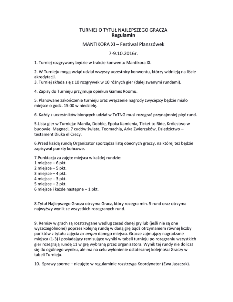 TURNIEJ O TYTUŁ NAJLEPSZEGO GRACZA Regulamin MANTIKORA XI – Festiwal Planszówek 7-9.10.2016r. 1. Turniej rozgrywany będzie w trakcie konwentu Mantikora XI. 2. W Turnieju mogą wziąć udział wszyscy uczestnicy konwentu, którzy widnieją na liście akredytacji. 3. Turniej składa się z 10 rozgrywek w 10 różnych gier (dalej zwanymi rundami). 4. Zapisy do Turnieju przyjmuje opiekun Games Roomu. 5. Planowane zakończenie turnieju oraz wręczenie nagrody zwycięzcy będzie miało miejsce o godz. 15:00 w niedzielę. 6. Każdy z uczestników biorących udział w ToTNG musi rozegrać przynajmniej pięć rund. 5.Lista gier w Turnieju: Manila, Dobble, Epoka Kamienia, Ticket to Ride, Królestwo w budowie, Magnaci, 7 cudów świata, Teomachia, Arka Zwierzaków, Dziedzictwo – testament Diuka el Crecy. 6.Przed każdą rundą Organizator sporządza listę obecnych graczy, na której też będzie zapisywał punkty końcowe. 7.Punktacja za zajęte miejsca w każdej rundzie: 1 miejsce – 6 pkt. 2 miejsce – 5 pkt. 3 miejsce – 4 pkt. 4 miejsce – 3 pkt. 5 miejsce – 2 pkt. 6 miejsce i każde następne – 1 pkt. 8.Tytuł Najlepszego Gracza otrzyma Gracz, który rozegra min. 5 rund oraz otrzyma najwyższy wynik ze wszystkich rozegranych rund. 9. Remisy w grach są rozstrzygane według zasad danej gry lub (jeśli nie są one wyszczególnione) poprzez kolejną rundę w daną grę bądź otrzymaniem równej liczby punktów z tytułu zajęcia ex aequo danego miejsca. Gracze zajmujący nagradzane miejsca (1-3) i posiadający remisujące wyniki w tabeli turnieju po rozegraniu wszystkich gier rozegrają rundę 11 w grę wybraną przez organizatora. Wynik tej rundy nie dolicza się do ogólnego wyniku, ale ma na celu wyłonienie ostatecznej kolejności Graczy w tabeli Turnieju. 10. Sprawy sporne – nieujęte w regulaminie rozstrzyga Koordynator (Ewa Jaszczak).