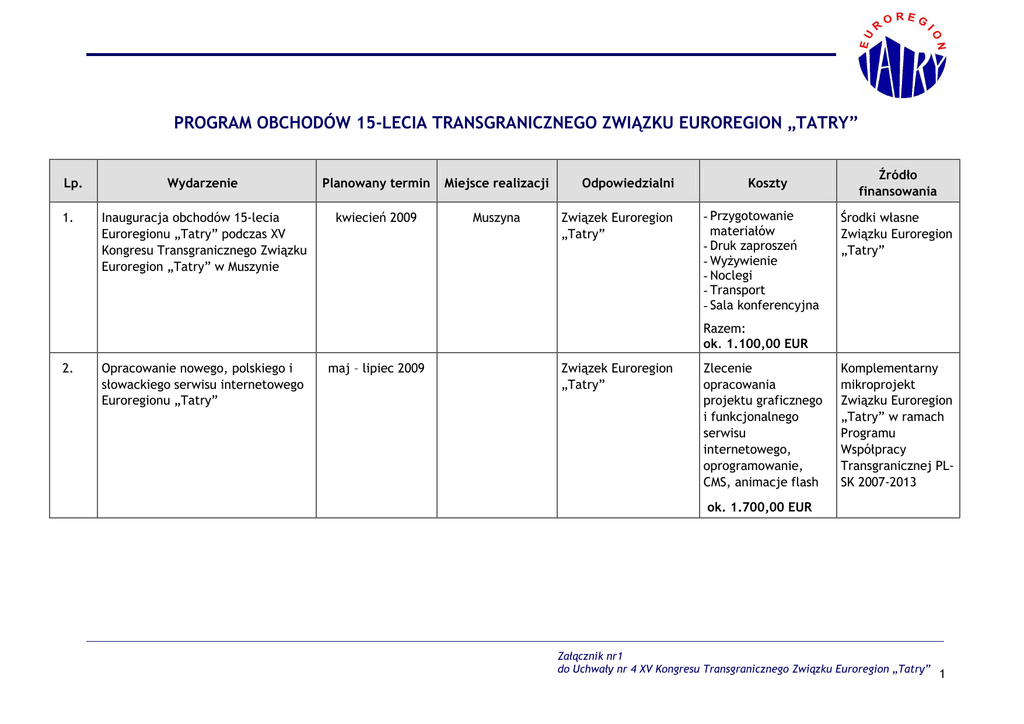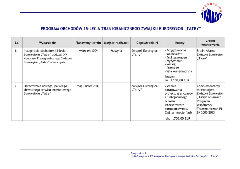 PROGRAM OBCHODÓW 15-LECIA TRANSGRANICZNEGO ZWIĄZKU EUROREGION „TATRY” Lp. 1. Wydarzenie Planowany termin Miejsce realizacji Inauguracja obchodów 15-lecia Euroregionu „Tatry” podczas XV Kongresu Transgranicznego Związku Euroregion „Tatry” w Muszynie kwiecień 2009 Muszyna Odpowiedzialni Związek Euroregion „Tatry” Koszty - Przygotowanie materiałów - Druk zaproszeń - WyŜywienie - Noclegi - Transport - Sala konferencyjna Źródło finansowania Środki własne Związku Euroregion „Tatry” Razem: ok. 1.100,00 EUR 2. Opracowanie nowego, polskiego i słowackiego serwisu internetowego Euroregionu „Tatry” maj – lipiec 2009 Związek Euroregion „Tatry” Zlecenie opracowania projektu graficznego i funkcjonalnego serwisu internetowego, oprogramowanie, CMS, animacje flash Komplementarny mikroprojekt Związku Euroregion „Tatry” w ramach Programu Współpracy Transgranicznej PLSK 2007-2013 ok. 1.700,00 EUR Załącznik nr1 do Uchwały nr 4 XV Kongresu Transgranicznego Związku Euroregion „Tatry” 1 Združenie Region „Tatry” 3. Wystawa prezentująca najwaŜniejsze inicjatywy i przedsięwzięcia Euroregionu „Tatry” – około 150 fotografii i dokumentów wrzesień 2009 Związek Euroregion Ośrodek Współpracy Polsko- „Tatry” Słowackiej w Nowym Targu ok. 1.700,00 EUR Komplementarny mikroprojekt Združenia Region „Tatry” w ramach Programu Współpracy Transgranicznej PLSK 2007-2013 - Profesjonalne przygotowanie fotografii i dokumentów – skanowanie, opracowanie graficzne, powiększenie, wywołanie w odpowiednim formacie - Przygotowanie fotoram - Organizacja wernisaŜu - Promocja wystawy – zaproszenia, afisze, banery Komplementarny mikroprojekt Związku Euroregion „Tatry” w ramach PWT PL-SK 20072013 Razem – ok. 11.000,00 EUR, w tym ZET 5.500,00 EUR Załącznik nr1 do Uchwały nr 4 XV Kongresu Transgranicznego Związku Euroregion „Tatry” 2 październik 2009 Galeria Baronka lub galeria na ul. Alexandra w KieŜmarku Združenie Region „Tatry” i ZRT 5.500,00 EUR Komplementarny mikroprojekt Združenia Region „Tatry” w ramach PWT PL-SK 20072013 - Honoraria dla polskich i słowackich autorów tekstów - Honoraria za tłumaczenie tekstów - Opracowanie wydawnicze, redakcyjne i graficzne, skład, korekta, druk i oprawa Komplementarny mikroprojekt Związku Euroregion „Tatry” w ramach PWT PL-SK 20072013 Inne miasta Euroregionu „Tatry” 4. Wydanie rocznika „Pogranicze Polsko-Słowackie 2008” maj-wrzesień 2009 Spotkania Związek Euroregion promocyjne - Nowy „Tatry” we współpracy Targ i KieŜmark ze Združeniem Region „Tatry” ok. 10.000,00 EUR 5. Festyn góralski „Euroregion bez granic” lipiec 2009 Trstena Združenie Region „Tatry” 15.000,00 EUR Projekt w ramach Programu SPERA Załącznik nr1 do Uchwały nr 4 XV Kongresu Transgranicznego Związku Euroregion „Tatry” 3 6. Wystawa najstarszych wizerunków Tatr utrwalonych na mapach, rycinach i obrazach przez artystów róŜnych kultur polsko-słowackiego pogranicza sierpień 2009 Ośrodek Związek Euroregion Współpracy Polsko- „Tatry” Słowackiej w Nowym Targu - Zakup ram wystawienniczych i gablot wraz z oświetleniem - Transport wystawy - Ubezpieczenie dzieł - AranŜacja wystawy - Promocja wystawy Zaproszenie, afisze, banery - Organizacja wernisaŜu Projekt pt. Spotkanie siedmiu kultur pogranicza polsko-słowackiego „Od Ladislava Mednyánszkeho do Jana Kantego Pawluśkiewicza” w ramach PWT PL-SK 2007-2013 16.799,00 EUR wrzesień 2009 Muzeum w KieŜmarku Muzeum w KieŜmarku - Transport wystawy do KieŜmarku - Ubezpieczenie - Promocja wystawy - Organizacja wernisaŜu 1.610,70 EUR 7. Wydanie folderu promocyjnoinformacyjnego o Euroregionie „Tatry” /w języku polskim, słowackim i angielskim/ oraz zaktualizowanej mapy Euroregionu „Tatry” z informacjami o członkach Euroregionu wrzesień – październik 2009 KieŜmark Združenie Region ok. 11.300,00 EUR „Tatry” we współpracy ze Związkiem Euroregion „Tatry” Komplementarny mikroprojekt Združenia Region „Tatry” w ramach PWT PL-SK 20072013 Załącznik nr1 do Uchwały nr 4 XV Kongresu Transgranicznego Związku Euroregion „Tatry” 4 8. I. dzień Konferencja „15 lat Euroregionu „Tatry” – od stowarzyszenia do europejskiego ugrupowania współpracy terytorialnej” z okazji przekształcenia Transgranicznego Związku Euroregion „Tatry” w Europejskie Ugrupowanie Współpracy Terytorialnej „Euroregion Tatry” II. dzień - Wycieczka krajoznawcza połączona z prezentacją Euroregionu „Tatry” - Uroczysty koncert na dziedzińcu zamku w KieŜmarku. W programie koncertu utwory w wykonaniu polskich i słowackich artystów oraz zespołów, np. Tatrzańskiej Orkiestry Klimatycznej oraz pieśń o Euroregionie „Tatry” autorstwa pana Stanisława Apostoła - szczegółowy program koncertu do omówienia wrzesień 2009 Nowy Targ Związek Euroregion „Tatry” Nagłośnienie Tłumaczenie symultaniczne Noclegi i wyŜywienie Transport podczas wycieczki Komplementarny mikroprojekt Związku Euroregion „Tatry” w ramach PWT PL-SK 20072013 ok. 4.400,00 EUR Dziedziniec zamku w KieŜmarku Združenie Region „Tatry” Organizacja koncertu – scena, nagłośnienie, oświetlenie, honoraria dla zespołów, wynagrodzenie dla personelu technicznego Promocja koncertu – zaproszenia, afisze, banery Noclegi i wyŜywienie Komplementarny mikroprojekt Združenia Region „Tatry” w ramach PWT PL-SK 20072013 ok. 11.000 EUR Koszty: Związek Euroregion „Tatry” – ok. 22.700,00 EUR w ramach mikroprojektu + 16.799,00 EUR w ramach projektu S7KP = 39.499,00 EUR Združenie Region „Tatry” – ok. 21.500,00 EUR w ramach mikroprojektu + 15.000,00 EUR w ramach projektu SPERA = 36.500,00 EUR Do rozwaŜenia: 1. Przyznanie tytułu Honorowego Członka Transgranicznego Związku Euroregion „Tatry” 2. Patronat honorowy nad konferencją – np. Minister Rozwoju Regionalnego RP oraz Minister Budownictw