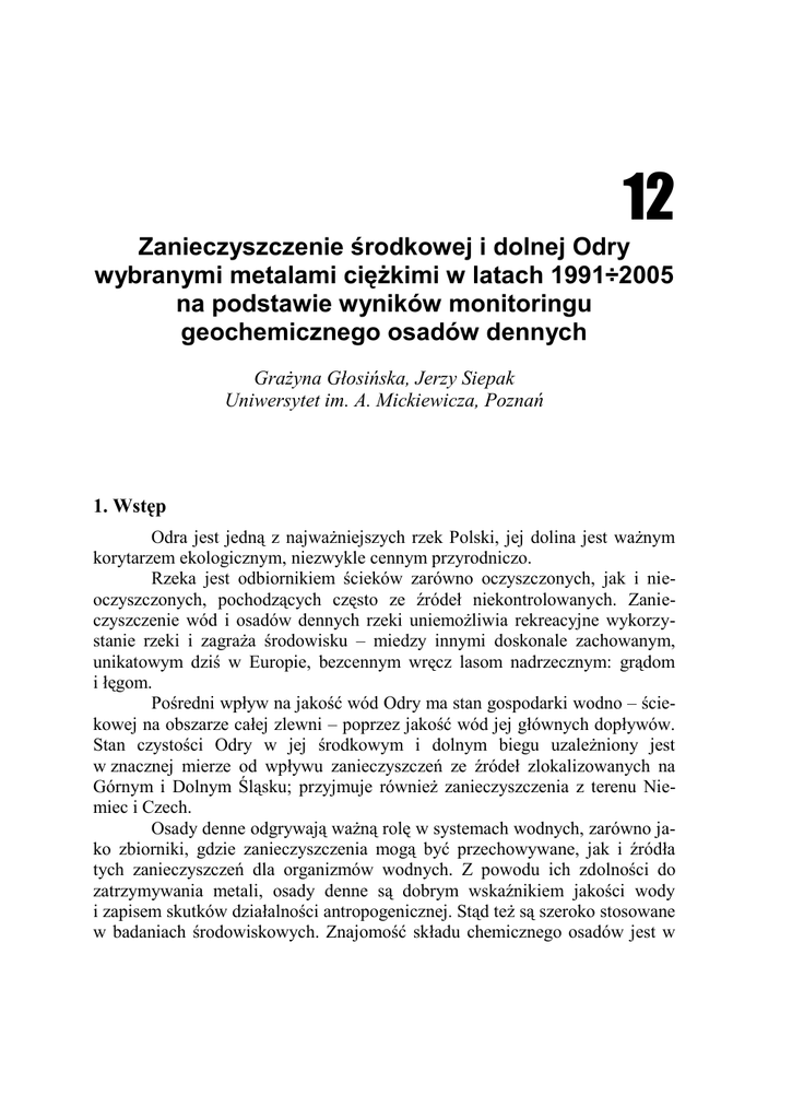 12 Zanieczyszczenie środkowej i dolnej Odry wybranymi metalami ciężkimi w latach 1991÷2005 na podstawie wyników monitoringu geochemicznego osadów dennych Grażyna Głosińska, Jerzy Siepak Uniwersytet im. A. Mickiewicza, Poznań 1. Wstęp Odra jest jedną z najważniejszych rzek Polski, jej dolina jest ważnym korytarzem ekologicznym, niezwykle cennym przyrodniczo. Rzeka jest odbiornikiem ścieków zarówno oczyszczonych, jak i nieoczyszczonych, pochodzących często ze źródeł niekontrolowanych. Zanieczyszczenie wód i osadów dennych rzeki uniemożliwia rekreacyjne wykorzystanie rzeki i zagraża środowisku – miedzy innymi doskonale zachowanym, unikatowym dziś w Europie, bezcennym wręcz lasom nadrzecznym: grądom i łęgom. Pośredni wpływ na jakość wód Odry ma stan gospodarki wodno – ściekowej na obszarze całej zlewni – poprzez jakość wód jej głównych dopływów. Stan czystości Odry w jej środkowym i dolnym biegu uzależniony jest w znacznej mierze od wpływu zanieczyszczeń ze źródeł zlokalizowanych na Górnym i Dolnym Śląsku; przyjmuje również zanieczyszczenia z terenu Niemiec i Czech. Osady denne odgrywają ważną rolę w systemach wodnych, zarówno jako zbiorniki, gdzie zanieczyszczenia mogą być przechowywane, jak i źródła tych zanieczyszczeń dla organizmów wodnych. Z powodu ich zdolności do zatrzymywania metali, osady denne są dobrym wskaźnikiem jakości wody i zapisem skutków działalności antropogenicznej. Stąd też są szeroko stosowane w badaniach środowiskowych. Znajomość składu chemicznego osadów jest w Grażyna Głosińska, Jerzy Siepak wielu przypadkach lepszym wskaźnikiem zanieczyszczenia środowiska, niż znajomość składu chemicznego wody, bardziej zmiennego w czasie. Problem zanieczyszczenia osadów dennych jest coraz bardziej doceniany. Ocena zanieczyszczeń osadów, obok oceny jakości wód, służy ocenie jakości ekosystemów wodnych, tym bardziej, że zanieczyszczenia osadów dennych stanowią zagrożenie dla sąsiadujących z nimi ekosystemów lądowych. Celem pracy było porównanie zanieczyszczenia osadów dennych środkowej i dolnej Odry na odcinku Nowa Sól – Police w latach 1991÷2005 w ujęciu przestrzennym i czasowym. 2. Metodyka prowadzenia badań i oceny zanieczyszczeń osadów dennych Pierwsze badania osadów rzek i jezior pod kątem zawartości metali ciężkich przeprowadzono w 1990 roku. Badania miały charakter wdrożeniowy, stąd za rok bazowy, do którego odniesione zostały wyniki badań metali ciężkich, otrzymane w latach następnych, przyjęto drugi rok badań – rok 1991 [1]. Zatem monitoring geochemiczny osadów wodnych realizowany jest od 1991 roku przez Państwowy Instytut Geologiczny w Warszawie na zlecenie Inspekcji Ochrony Środowiska. Celem monitoringu geochemicznego osadów wodnych jest kontrolowanie zawartości metali ciężkich i wielopierścieniowych węglowodorów aromatycznych oraz innych pierwiastków w osadach aluwialnych i jeziornych, a także śledzenie zmian w koncentracji pierwiastków śladowych w czasie [2]. Próbki osadów dennych pobierane są do badań raz w roku. Liczba kontrolowanych punktów w danym roku jest ustalana w porozumieniu z Inspekcją Ochrony Środowiska. Obserwacje osadów rzek prowadzone są ogółem w 301 punktach obserwacyjnych, w tym corocznie w 80 punktach reperowych, zaś pozostałe 221 w cyklu 3-letnim [1÷3]. Próbki osadów aluwialnych pobierane są w okresie letnim, ze strefy brzegowej koryt rzecznych, z przeciwnej strony nurtu, z miejsc, gdzie następuje depozycja zawiesin (każda próbka stanowi średnią z 4/5 pobrań na odcinku około 50 metrów). Badaniom poddawane są próbki najdrobniejszego osadu (frakcja < 0,2 mm), zawierającego duże ilości frakcji ilastej. Prace laboratoryjne wykonywane są w centralnym Laboratorium Chemicznym Państwowego Instytutu Geologicznego w Warszawie [2, 3]. Punkty obserwacyjne zlokalizowane są przy ujściach rzek dłuższych niż 60 km, przy ujściach rzek, których wody nie odpowiadają normom czystości wód powierzchniowych, poniżej miejsc zrzutu ścieków z większych ośrodków miejskich i przemysłowych oraz w punktach rozmieszczonych wzdłuż dłuższych rzek [3]. 168 Środkowo-Pomorskie Towarzystwo Naukowe Ochrony Środowiska Zanieczyszczenie środkowej i dolnej Odry wybranymi metalami ciężkimi ... Oceny zanieczyszczeń metalami ciężkimi osadów dennych środkowej i dolnej Odry dokonano na podstawie wyników badań osadów przeprowadzonych przez Państwowy Instytut Geologiczny na zlecenie Wojewódzkich Inspektoratów Ochrony Środowiska: w Zielonej Górze [4, 5] i Szczecinie [6, 7] w ramach monitoringu geochemicznego osadów rzecznych w wybranych punktach obserwacyjnych (tabela 1) i przedstawiono: 1. wyniki klasyfikacji geochemicznej osadów dennych według propozycji Państwowego Instytutu Geologicznego [8] w wybranych punktach obserwacyjnych, 2. trendy zmian wielkości wybranych zanieczyszczeń metalicznych w osadach dennych Odry na przestrzeni lat 1991÷2005 w punktach reperowych sieci monitoringu krajowego analizowanego odcinka Odry (Nowa Sól i Krajnik Dolny), 3. zmiany wielkości wybranych zanieczyszczeń metalicznych w osadach dennych w latach 1991, 1996, 1997 i 2005 wzdłuż analizowanego odcinka Odry. Tabela 1. Lokalizacja wybranych punktów obserwacyjnych monitoringu osadów dennych środkowej i dolnej Odry Table 1. Location of selected measurement points of the middle and lower Odra River sediments monitoring system Miejscowość Nowa Sól Świecko Kostrzyn Gozdowice Krajnik Dolny Kołbaskowo Police km rzeki 429,0 580,5 615,0 645,3 690,0 719,0 761,6 Województwo lubuskie zachodniopomorskie W Polsce nie ma uregulowań prawnych w zakresie klasyfikacji osadów wodnych. Monitoring geochemiczny osadów dennych zbiorników wodnych opiera się na klasyfikacji osadów wodnych zaproponowanej przez Państwowy Instytut Geologiczny (PIG) [8] przewidującej cztery klasy jakości osa