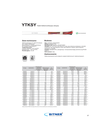 YTKSY Kabel telekomunikacyjny stacyjny RoHS RoHS 2002/95/WE Dane techniczne: Budowa: Telekomunikacyjny (T), kabel (K) stacyjny (S), o żyłach miedzianych jednodrutowych, o izolacji polwinitowej (Y) i powłoce polwinitowej (Y) Temperatura pracy: podczas układania: -10°C do 50°C podczas pracy: - 40°C do 70°C Promień gięcia: 10 x Ø Żyły: miedziane jednodrutowe Izolacja: specjalny PVC Oznaczenie żył: zgodnie z PN-92/T-90321 Ośrodek: od 1 do 21 par: żyły skręcone w pary, pary skręcone warstwowo w ośrodek od 25 do 53 par: żyły skręcone w pary, pary skręcone w pęczki, pęczki skręcone warstwowo w ośrodek Powłoka: specjalny PVC, samogasnący i nierozprzestrzeniający płomienia (wg PN-EN 60332-1) Kolor powłoki: biały Zastosowanie: Kable przeznaczone są do połączeń urządzeń telefonicznych i teletransmisyjnych. zastosowanie wnętrzowe Nr kat. TS0037 TS0038 TS0039 TS0040 TS0041 TS0042 TS0043 TS0044 TS0045 TS0046 TS0047 TS0048 TS0049 TS0050 TS0051 TS0052 TS0002 TS0003 TS0005 TS0007 TS0008 TS0009 TS0011 TS0012 TS0013 TS0015 TS0017 TS0018 TS0019 PN-EN60332-1 [nx2xmm] 1x2x0,4 2x2x0,4 3x2x0,4 5x2x0,4 6x2x0,4 7x2x0,4 10x2x0,4 12x2x0,4 14x2x0,4 21x2x0,4 28x2x0,4 30x2x0,4 35x2x0,4 42x2x0,4 48x2x0,4 53x2x0,4 1 x 2x0,5 2 x 2x0,5 3 x 2x0,5 5 x 2x0,5 6 x 2x0,5 7 x 2x0,5 10 x 2x0,5 12 x 2x0,5 14 x 2x0,5 21 x 2x0,5 28 x 2x0,5 30 x 2x0,5 35 x 2x0,5 Orientacyjna Cu Obliczeniowa średnica zewnętrzna waga kabla [kg/km] [kg/km] [mm] 2,4 3,0 12 4,8 3,8 16 7,2 4,2 23 12,1 4,8 32 14,5 5,4 38 16,9 5,4 43 24,1 6,2 55 28,9 6,6 63 33,8 7,3 71 50,6 8,6 102 67,5 9,6 128 72,3 10,9 137 84,4 11,8 160 101,3 15,0 187 115,8 16,0 205 127,8 16,5 228 3,8 3,0 15 7,5 3,9 20 11,3 4,2 29 18,8 4,8 41 22,6 5,4 51 26,4 5,8 57 37,7 6,4 76 45,2 6,9 87 52,8 7,4 98 79,1 9,1 144 105,5 10,3 188 113,0 11,3 196 131,9 12,2 227 Nr kat. [nx2xmm] 42x2x0,5 48x2x0,5 53x2x0,5 1x2x0,6 2x2x0,6 3x2x0,6 5x2x0,6 6x2x0,6 7x2x0,6 10x2x0,6 12x2x0,6 14x2x0,6 21x2x0,6 1x2x0,8 2x2x0,8 3x2x0,8 5x2x0,8 6x2x0,8 7x2x0,8 10x2x0,8 12x2x0,8 14x2x0,8 21x2x0,8 28x2x0,8 30x2x0,8 35x2x0,8 42x2x0,8 48x2x0,8 53x2x0,8 TS0020 TS0021 TS0022 TS0023 TS0024 TS0025 TS0026 TS0061 TS0062 TS0063 TS0064 TS0065 TS0066 TS0028 TS0029 TS0031 TS0032 TS0033 TS0034 TS0035 TS0053 TS0054 TS0036 TS0055 TS0056 Ts0057 TS0058 TS0059 TS0060 Orientacyjna średnica Obliczeniowa zewnętrzna waga kabla [kg/km] [mm] 266 16,5 295 17,5 324 18,0 20 3,2 30 4,1 47 4,7 69 5,4 83 5,8 94 6,2 131 7,0 152 7,6 174 8,0 248 9,7 25 4,0 38 5,4 59 6,3 87 7,5 104 8,0 118 8,6 164 10,0 191 10,7 218 11,3 310 13,7 408 20,5 434 21,0 495 23,5 602 24,5 674 26,0 740 27,0 Cu [kg/km] 158,3 180,9 199,7 5,4 10,8 16,2 27,2 32,6 38,0 54,3 65,1 76,0 114,0 9,6 19,3 28,9 48,2 57,9 67,5 96,5 115,8 135,0 202,6 270,1 289,4 337,6 405,1 463,0 511,2 Zakłady Kablowe BITNER zastrzegają sobie prawo do zmiany specyfikacji bez wcześniejszego uprzedzenia ® 37