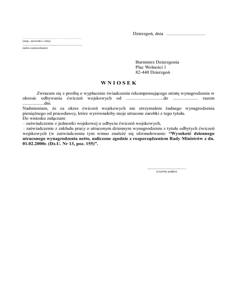 Dzierzgoń, dnia .......................................... ………………………………………................... (stop., nazwisko i imię) ............................................................... (adres zamieszkania) Burmistrz Dzierzgonia Plac Wolności 1 82-440 Dzierzgoń WNIOSEK Zwracam się z prośbą o wypłacenie świadczenia rekompensującego utratę wynagrodzenia w okresie odbywania ćwiczeń wojskowych od ...............................do ..................... razem ..................dni. Nadmieniam, że za okres ćwiczeń wojskowych nie otrzymałem żadnego wynagrodzenia pieniężnego od pracodawcy, które wyrównałoby moje utracone zarobki z tego tytułu. Do wniosku załączam: zaświadczenie z jednostki wojskowej o odbyciu ćwiczeń wojskowych, zaświadczenie z zakładu pracy o utraconym dziennym wynagrodzeniu z tytułu odbytych ćwiczeń wojskowych (w zaświadczeniu tym winno znaleźć się sformułowanie: “Wysokość dziennego utraconego wynagrodzenia netto, naliczone zgodnie z rozporządzeniem Rady Ministrów z dn. 01.02.2000r. (Dz.U. Nr 13, poz. 155)”. ......................................... (czytelny podpis)