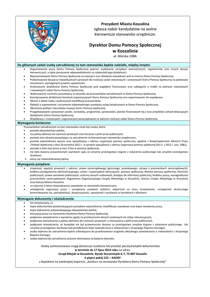 Prezydent Miasta Koszalina ogłasza nabór kandydatów na wolne kierownicze stanowisko urzędnicze: Dyrektor Domu Pomocy Społecznej w Koszalinie ul. Morska 108A Do głównych zadań osoby zatrudnionej na tym stanowisku będzie należało, między innymi: Organizowanie pracy Domu Pomocy Społecznej poprzez wydawanie zarządzeń wewnętrznych, regulaminów oraz innych decyzji kierowniczych, a także ponoszenie odpowiedzialności za całokształt jego działalności. Reprezentowanie Domu Pomocy Społecznej na zewnątrz oraz składanie oświadczeń woli w imieniu Domu Pomocy Społecznej. Podejmowanie decyzji w indywidualnych sprawach dla realizacji zadań statutowych i ustawowych Domu Pomocy Społecznej na podstawie stosownych, wymaganych prawem upoważnień. Analizowanie działalności Domu Pomocy Społecznej pod względem finansowym oraz zabieganie o środki na pokrycie statutowych i ustawowych zadań Domu Pomocy Społecznej. Wykonywanie czynności pracodawcy w stosunku do pracowników zatrudnionych w Domu Pomocy Społecznej. Koordynowanie działalności komórek organizacyjnych Domu Pomocy Społecznej oraz organizowanie ich współpracy. Dbanie o dobór kadry i podnoszenie kwalifikacji pracowników. Dbałość o zapewnienie i utrzymanie odpowiedniego standardu usług świadczonych w Domu Pomocy Społecznej. Określanie polityki i kierunków rozwoju Domu Pomocy Społecznej. Przygotowywanie opracowań (analiz, wniosków, programów, sprawozdań, planów finansowych itp.) oraz projektów uchwał dotyczących działalności Domu Pomocy Społecznej. Współpraca z instytucjami i organizacjami pozarządowymi w zakresie realizacji zadań Domu Pomocy Społecznej. Wymagania konieczne: Pracownikiem zatrudnionym na tym stanowisku może być osoba, która: posiada obywatelstwo polskie, ma pełną zdolność do czynności prawnych oraz korzysta z pełni praw publicznych, posiada stan zdrowia pozwalający na zatrudnienie na kierowniczym stanowisku urzędniczym, posiada wykształcenie wyższe oraz specjalizację z zakresu organizacji pomocy społecznej, zgodnie z Rozporządzeniem Ministra Pracy i Polityki Społecznej z dnia 26 września 2012 r. w sprawie specjalizacji z zakresu organizacji pomocy społecznej (Dz.U. z 2012 r. poz. 1081), posiada 5-letni staż pracy w tym 3 lata w pomocy społecznej, nie była skazana prawomocnym wyrokiem sądu za umyślne przestępstwo ścigane z oskarżenia publicznego lub umyślne przestępstwo skarbowe, cieszy się nieposzlakowaną opinią. Wymagania pożądane: znajomość regulacji prawnych z zakresu: prawa samorządowego (gminnego, powiatowego, ustawy o pracownikach samorządowych); kodeksu postępowania administracyjnego; ustaw i rozporządzeń dotyczących: pomocy społecznej; domów pomocy społecznej; finansów publicznych; prawa zamówień publicznych; ochrony danych osobowych; dostępu do informacji publicznej; Kodeksu pracy; wynagradzania pracowników samorządowych; Regulaminu Organizacyjnego Urzędu Miejskiego w Koszalinie; Statutu Urzędu Miejskiego w Koszalinie oraz Statutu Miasta Koszalina. co najmniej 3 letnie doświadczenie zawodowe na stanowisku kierowniczym, umiejętność organizacji pracy i zarządzania zasobami ludzkimi, odporność na stres, kreatywność, umiejętność skutecznego komunikowania się, samodzielność, dyspozycyjność, uprzejmość i życzliwość w kontaktach z klientami. Wymagane dokumenty i oświadczenia: list motywacyjny, cv kopie dokumentów potwierdzających posiadane wykształcenie, kwalifikacje zawodowe oraz kopie świadectw pracy, kopia dokumentu potwierdzającego obywatelstwo polskie, koncepcja pracy na stanowisku Dyrektora Domu Pomocy Społecznej, podpisane oświadczenie o wyrażeniu zgody na przetwarzanie danych osobowych do celów rekrutacyjnych, podpisane oświadczenie o pełnej zdolności do czynności prawnych i o korzystaniu z pełni praw publicznych, podpisane oświadczenie, że kandydat nie był prawomocnie skazany za przestępstwo umyślne ścigane z oskarżenia publicznego lub umyślne przestępstwo skarbowe (lub przedłożenie kopii zaświadczenia o niekaralności z Krajowego Rejestru Karnego), osoba wybrana do zatrudnienia będzie zobowiązana do przedstawienia oryginału aktualnego zaświadczenia o niekaralności z Krajowego Rejestru Karnego, osoba wybrana do zatrudnienia zostanie skierowana na badania lekarskie. Osoby zainteresowane mogą dostarczyć osobiście lub przesłać pocztą komplet dokumentów w terminie do 17 lipca 2014 roku na adres: Urząd Miejski w Koszalinie, Rynek Staromiejski 6-7, 75-007 Koszalin II piętro pokój 222 – KADRY z dopiskiem na zamkniętej kopercie: „Konkurs na stanowisko Dyrektora Domu Pomocy Społecznej”