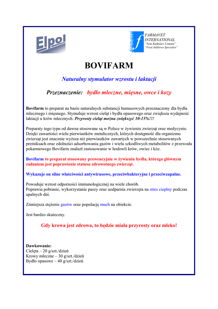 FARMAVET INTERNATIONAL “Yem Katkıları Uzmanı” “Feed Additives Specialist” BOVIFARM Naturalny stymulator wzrostu i laktacji Przeznaczenie: bydło mleczne, mięsne, owce i kozy Bovifarm to preparat na bazie naturalnych substancji humusowych przeznaczony dla bydła mlecznego i mięsnego. Stymuluje wzrost cieląt i bydła opasowego oraz zwiększa wydajność laktacji u krów mlecznych. Przyrosty cieląt można zwiększyć 10-15%!!! Preparaty tego typu od dawna stosowane są w Polsce w żywieniu zwierząt oraz medycynie. Dzięki zawartości wielu pierwiastków metalicznych, których dostępność dla organizmu zwierząt jest znacznie wyższa niż pierwiastków zawartych w powszechnie stosowanych premiksach oraz zdolności adsorbowania gazów i wielu szkodliwych metabolitów z przewodu pokarmowego Bovifarm znalazł zastosowanie w hodowli krów, owiec i kóz. Bovifarm to preparat stosowany prewencyjnie w żywieniu bydła, którego głównym zadaniem jest poprawienie statusu zdrowotnego zwierząt. Wykazuje on silne właściwości antywirusowe, przeciwbakteryjne i przeciwzapalne. Powoduje wzrost odporności immunologicznej na wiele chorób. Poprawia pobranie, wykorzystanie paszy oraz uodparnia zwierzęta na stres cieplny podczas upalnych dni. Zmniejsza stężenie gazów oraz populację much na obiekcie. Jest bardzo skuteczny. Gdy krowa jest zdrowa, to będzie miała przyrosty oraz mleko! Dawkowanie: Cielęta – 20 g/szt./dzień Krowy mleczne – 30 g/szt./dzień Bydło opasowe – 40 g/szt./dzień FARMAGULATOR M® Dodatek mineralny w formie sypkiej i płynnej Czym jest Farmagulator? Farmagulator jest naturalną paszą mineralną, która powoduje wzrost efektywności produkcji jaj, żywca drobiowego i wieprzowego. Otrzymany jest z materii organicznej zawartej w torfie. Substancjmi aktywnymi są kwasy huminowe, fulwowe , pierwiastki mineralne w postaci kompleksów organicznych, fitozwiązki. STYMULATOR WZROSTU ZDROWE ZWIERZĘTA MNIEJ UPADKÓW!!! JAK ZWIĘKSZYĆ PRZYROSTY I POPRAWIĆ FCR? OCHRONA ŚLUZÓWKI JELITA NA CAŁEJ JEGO DŁUGOŚCI OCHRONA PRZECIWKO WIRUSOM, BAKTERIOM I GRZYBOM. EFEKT STYMULUJĄCY WZROST Farmagulator pokrywa śluzówkę jelita warstwą ochronną tzw. biofilmem, który zabezpiecza ją przed atakami patogenów. Dlatego szkodliwe metabolity bakteryjne i wirusowe nie przedostają się do krwi (rys. 1). BACTERIUM BACTERIUM BACTERIUM FARMAGÜLATÖR® BACTERIUM BACTERIUM BACTERIUM BACTERIUM BACTERIUM BACTERIUM BACTERIUM BACTERIUN FARMAGÜLATÖR® Rys. 1: Mechanizm ochrony śluzówki przewodu pokarmowego FARMAGULATOR® Znaczenie wysokości villus i głębokości krypt SÜLEYMAN DEMİREL UNIVERSITY FACULTY of AGRICULTURE Assoc. Prof. Sülhattin YAŞAR Villi height (micrometer) Crypt deep (micrometer) Tunica muscularis thick (micrometer) Average Average 93.28a 43.03a 45.03a 40 122.00b 49.40b 44.65a 40 135.98c 51.47b 45.25a Treatments N Control 40 Farmagülatör® Dry Farmagülatör® Solution (P<0.05) Mikroorganizmy patogenne uszkadzają kosmki jelitowe. Rys. 2 pokazuje, w jaki sposób ochrona kosmków pomaga nam efektywnie wykorzystać genetyczny potencjał wzrostowy zwierząt. BACTERI UM BACTERI UM BACTERI UMİ BACTERI UM FARMAGÜLATÖR® BACTERI UM Rys. 2 Powstawanie biofilmu na śluzówce BACTERI UM Co się dzieje, gdy śluzówka jest uszkodzona? (Rys. 3) Scatrix tissue Rys. 3: Uszkodzenie śluzówki jest nieodwracalne. Powierzchnia absorpcji składników pokarmowych ograniczona. Biofilm chroni również uszkodzoną śluzówkę! EFEKT OCHRONY ŚLUZÓWKI • • Ograniczenie negatywnego wpływu patogenów na śluzówkę jelita cieńkiego. Wirusy i bakterie wydalane są z przewodu pokarmowego wraz z odchodami. W ten sposób możemy chronić śluzówkę na całej długości przewodu pokarmowego przeciwko: - bakteriom, które atakują jelito cieńkie (Clostridium bacteria, E. Coli, Salm. Spp, Cholera, Staphylococcus, etc.) (4. picture) - wirusom (Echo-virus, Adeno-virus, Rota-virus, etc.) - Eimera Spp., która powoduje kokcydiozę - Brachyspira Spp., która powoduje dezynterię w jelicie grubym ULUDAG UNIVERSITY FACULTY of VETERINARY MEDICINE Assoc. Prof.Mustafa EREN Total number of Secum Coliform Bacteria Farmagülatör ® 2.5 kg/tons 4.341 (log10) cfu/g Control 5.903 (log10) cfu/g P < 0.05 Rys. 4 Broiler, liczba bakterii Coli po użyciu preparatu Farmagulator (Uludag University, Bursa-Turkey) FARMAGULATOR – STYMULATOR WZROSTU STYMULACJA SYSTEMU IMMUNOLOGICZNEGO • Biofilm utworzony na powierzchni przewodu pokarmowego stymuluje receptory immunologiczne śluzówki, co powoduje wzrost efektywności procesu fagocytozy. • Podwyższony poziom hemoglobiny, fosforu, albumin I β-globulin we krwi również wzmacnia system immunologiczny. POPRAWA KONWERSJI PASZY Poprzez stabilizację flory jelitowej osiąga się lepsze wykorzystanie składników pokarmowych paszy. WSPOMAGANIE WŁAŚCIWEJ GOSPODARKI ELEKTROLITOWEJ ORGANIZMU Właściwy mechanizm gospodarki elektrolitowej we krwi : • • zapobiega acidozie oraz zapewnia właściwą równowagę kwasowo-zasadową (Rys. 5) obniża poziom substancji toksycznych, ponieważ są one wiązane przez związki kompleksowe oraz wymienniki jonowe, których działanie jest bardziej efektywne niż proces fizycznej adsorbcji. Rys. 5. Biofilm na śluzówce pomaga w przenikaniu kationów Na+ i K+ do krwi. WŁAŚCIWOŚCI PRZECIWZAPALNE Flawonoidy zawarte w materii pochodzenia roślinnego, inhibitują procesy zapalne w organizmie. WŁAŚCIWOŚCI PRZECIWBAKTERYJNE, PRZECIWWIRUSOWE I PRZECIWGRZYBICZNE FARMAGULATOR – DOŚWIADCZENIE HODOWLANE Profesor Mustafa Eren oraz grupa jego współpracowników z Uludag Unv. Veterinary Fac. Dept. Of Animal Nutrition and Nutritional Diseases, Bursa-Türkiye przeprowadzili badania wpływu preparatu Farmagulator na produkcję żywca drobiowego. W badaniach porównali wagę brojlerów, spożycie paszy, FCR, popiół kości piszczelowej oraz poziomy Ca+, Na+ i Clwe krwi. Podzielono ptaki na 3 grupy. Pasza dla pierw