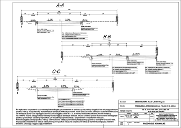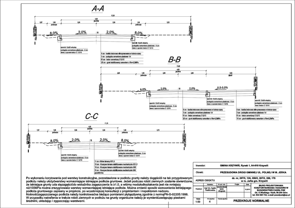 A-A 11,10 5,00 jezdnia 1,00 2,50 2,50 1,00 3,23 % 0 , 2 % 0 , 8 2 , 0 % I STN. GRANI CA pobocze o I STN. GRANI CA PASA DROGOW EGO pobocze 8 , 0 % PASA DROGOW EGO 0,87 opornik 12x25 wtopiny podsypka cementowo-piaskowa - 5 cm opornik 12x25 wtopiny ‡awa z oporem-beton C 12/15 podsypka cementowo-piaskowa - 5 cm ‡awa z oporem-beton C 12/15 8 cm - kostka betonowa wibroprasowana w kolorze szary 3 cm - podsypka cementowo-piaskowa 1:4 B-B 15 cm - beton cementowy C12/15 25 cm - grunt stabilizowany cementem o Rm=2,5MPa 11,02 4,00 jezdnia 1,00 2,00 2,00 3,52 I STN. GRANI CA zjazd % 0 , 2 % 0 , 8 % 0 , 3 5 , 0 2 , 0 % o PASA DROGOW EGO I STN. GRANI CA pobocze PASA DROGOW EGO 2,50 opornik 12x25 wtopiny opornik 12x25 wtopiny podsypka cementowo-piaskowa - 5 cm opornik 12x25 wtopiny podsypka cementowo-piaskowa - 5 cm ‡awa z oporem-beton C 12/15 ‡awa -beton C 12/15 podsypka cementowo-piaskowa - 5 cm ‡awa z oporem-beton C 12/15 C-C 8 cm - kostka betonowa wibroprasowana w kolorze szary 8 cm - kostka betonowa wibroprasowana w kolorze szary 3 cm - podsypka cementowo-piaskowa 1:4 3 cm - podsypka cementowo-piaskowa 1:4 15 cm - beton cementowy C12/15 15 cm - beton cementowy C12/15 25 cm - grunt stabilizowany cementem o Rm=2,5MPa 15 cm - grunt stabilizowany cementem o Rm=2,5MPa 11,10 4,00 jezdnia 2,00 2,00 % 0 , 2 o I STN. GRANI CA PASA DROGOW EGO % 0 , 8 1,00 3,73 pobocze 2 , 0 % 8 , 0 % I STN. GRANI CA 1,00 pobocze PASA DROGOW EGO 1,37 opornik 12x25 wtopiny podsypka cementowo-piaskowa - 5 cm opornik 12x25 wtopiny ‡awa z oporem-beton C 12/15 podsypka cementowo-piaskowa - 5 cm ‡awa z oporem-beton C 12/15 11 cm -Kliniec ‡amany 0/31,5 15 cm -Kruszywo ‡amane stabilizowane mechanicznie 0/31,5 Inwestor: GMINA KRZYWI, Rynek 1, 64-010 Krzywiæ Obiekt: PRZEBUDOWA DROGI GMINNEJ UL. POLNEJ W M. JERKA 10 cm -Kruszywo ‡amane stabilizowane mechanicznie 0/63 15 cm -Kruszywo ‡amane stabilizowane mechanicznie 0/63 geow‡knina Po wykonaniu korytowania pod warstwy konstrukcyjne, pozostawione w pod‡o¿u grunty nale¿y dogŒcii na tak przygotowanym pod‡o¿u nale¿y u‡o¿ywarstwy wzmacniaj„ce istniej„ce pod‡o¿e gruntowe. Je¿eli podczas robt ziemnych zostanie stwierdzone, dz. nr, 287/3, 120, 356/2, 287/2, 288, 176 ADRES OBIEKTU »¿¯…e istniej˜ce grunty uda si˜zag˜¯ci˜do wska¯”nika zag˜szczenia Is ¥1.0, a wtˆ‡rny modu¯odkszta¯cenia jest nie mniejszy ni¿100MPa mo¿na zrezygnowaz warstwy wzmacniaj„cej istniej„ce pod‡o¿e. Mo¿na zmieni sposb wzmocnienia istniej„cego w m. Jerka gm. Krzywiæ Nazwisko Nr upr. bud. mgri n¿ . Agat a 222/DO/08 spec. Pawlikowska drogowa KOSZTORYSOWANIA I NADZORU W 12.2013 BUDOWNICTWIE PAWE£ PUK O. K.Wielkiego 16a/6; 56-200 Gra NonozagŒszczanego pod‡o¿a nale¿y kontrolowana bie¿„co pomiarami p‡yt„sztywn„ zgodnie z norm„PN-S-02205:1998. rednimi, uk‡adaj„c i zgŒszczaj„c warstwami. Data BIURO PROJEKTOWANIA Projektant pod‡o¿a gruntowego zapisany w projekcie, po wczeniejszej konsultacji z projektantem i inspektorem nadzoru. W przypadku natrafienia w trakcie robt ziemnych w pod‡o¿u na grunty organiczne nale¿y je wymienizastŒpuj„c piaskami Podpis tel. 504 085 732; e-mail [email protected] Skala: 1:50 Nr rysunku: 4 Temat rysunku: PRZEKROJE NORMALNE