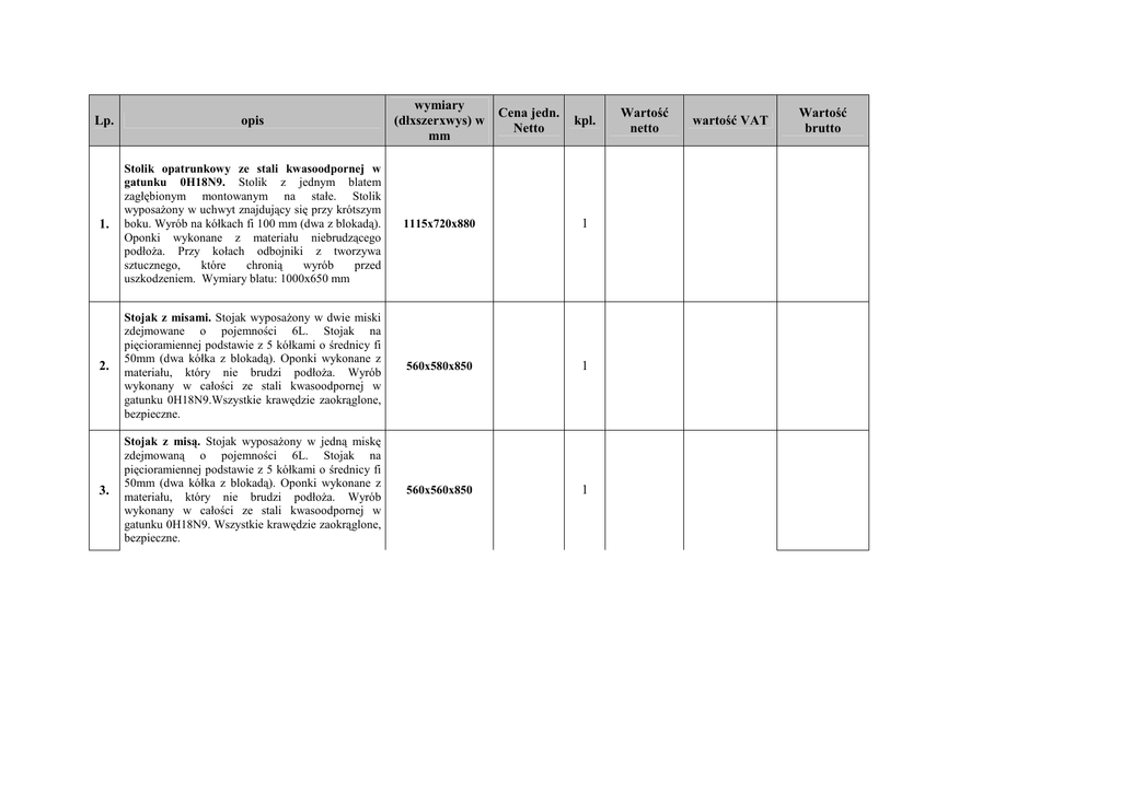 Lp. opis wymiary (dłxszerxwys) w mm 1. Stolik opatrunkowy ze stali kwasoodpornej w gatunku 0H18N9. Stolik z jednym blatem zagłębionym montowanym na stałe. Stolik wyposaŜony w uchwyt znajdujący się przy krótszym boku. Wyrób na kółkach fi 100 mm (dwa z blokadą). Oponki wykonane z materiału niebrudzącego podłoŜa. Przy kołach odbojniki z tworzywa sztucznego, które chronią wyrób przed uszkodzeniem. Wymiary blatu: 1000x650 mm 1115x720x880 1 2. Stojak z misami. Stojak wyposaŜony w dwie miski zdejmowane o pojemności 6L. Stojak na pięcioramiennej podstawie z 5 kółkami o średnicy fi 50mm (dwa kółka z blokadą). Oponki wykonane z materiału, który nie brudzi podłoŜa. Wyrób wykonany w całości ze stali kwasoodpornej w gatunku 0H18N9.Wszystkie krawędzie zaokrąglone, bezpieczne. 560x580x850 1 3. Stojak z misą. Stojak wyposaŜony w jedną miskę zdejmowaną o pojemności 6L. Stojak na pięcioramiennej podstawie z 5 kółkami o średnicy fi 50mm (dwa kółka z blokadą). Oponki wykonane z materiału, który nie brudzi podłoŜa. Wyrób wykonany w całości ze stali kwasoodpornej w gatunku 0H18N9. Wszystkie krawędzie zaokrąglone, bezpieczne. 560x560x850 1 Cena jedn. Netto kpl. Wartość netto wartość VAT Wartość brutto 4. Stolik typu Mayo do instrumentów chirurgicznych Stolik wykonany ze stali kwasoodpornej w gatunku 0H18N9, przewidziany do gromadzenia instrumentów chirurgicznych podczas zabiegów. Górny blat podnoszony przy pomocy noŜnej pompy hydraulicznej, za pomocą jednej dźwigni. Podstawa w kształcie litery T z trzema pojedynczymi kółkami fi 80 mm. Wszystkie kółka wyposaŜone w blokadę. Oponki wykonane z materiału niebrudzacego podłoŜa. Górny blat obracany w poziomie o 360°. Dopuszczalne obciąŜenie 15 kg. Krawędzie zaokrąglone, bezpieczne. 740x490x960 /1370 2 5. Stolik opatrunkowy ze stali kwasoodpornej w gatunku 0H18N9. Stolik z jednym blatem prostym montowanym na stałe. Stolik wyposaŜony w uchwyt znajdujący się przy krótszym boku. Wyrób na kółkach fi 100 mm (dwa z blokadą). Oponki wykonane z materiału niebrudzącego podłoŜa. Przy kołach odbojniki z tworzywa sztucznego, które chronią wyrób przed uszkodzeniem. Wymiary blatu: 600x500 mm 715x520x880 1 6. Taboret do badania pacjentów. Taboret bez oparcia, wyposaŜony w siedzisko metalowe. Siedzisko okrągłe o średnicy 350 mm. Wysokość siedziska podnoszona pneumatycznie (ręcznie za pomocą spręŜyny gazowej). Podstawa pięcioramienna z kółkami o średnicy fi 50 mm (w tym dwa z blokadą). Oponki wykonane z materiału, który nie brudzi podłoŜa. Taboret bez obręczy pod nogi. Dopuszczalne obciąŜenie 135 kg. Konstrukcja i siedzisko wykonane ze stali kwasoodpornej w gatunku 0H18N9. Wszystkie krawędzie zaokrąglone, bezpieczne. 560x560x460 /600 3 7. Wózek do worków foliowych 120l - pojedynczy, bez pokrywy. Wózek z uchwytem do worków foliowych 60l. Podstawa z kółkami fi 50 mm (w tym dwa z blokadą). Oponki wykonane z materiału, który nie brudzi podłoŜa. Wszystkie krawędzie zaokrąglone, bezpieczne. Wózek wykonany ze stali kwasoodpornej gatunek OH18N9. 415x440x1050 1 8. Stolik opatrunkowy ze stali kwasoodpornej w gatunku 0H18N9. Stolik z jednym blatem prostym montowanym na stałe. Stolik wyposaŜony w uchwyt znajdujący się przy krótszym boku. Wyrób na kółkach fi 100 mm (dwa z blokadą). Oponki wykonane z materiału niebrudzącego podłoŜa. Przy kołach odbojniki z tworzywa sztucznego, które chronią wyrób przed uszkodzeniem. Istnieje moŜliwość wykonania stolika z blatem zagłębionym, z dodatkowymi akcesoriami takimi jak np. miska o poj. 3 lub 6 l na odpadki na stelaŜu obrotowym, stojak na kroplówki, szuflada, relingi. Wymiary blatu: 1000x600 mm 1115x670x880 5 9. Wózek do aparatury z trzema półkami i wykonany ze stali kwasoodpornej w gatunku 0H18N9. Wózek wyposaŜony w trzy półki zagłębione montowane na stałe (bez regulacji wysokości). Odległość między poszczególnymi półkami wynosi 400 mm. Wyrób na kółkach (w tym dwa koła z blokadą). Oponki wykonane z materiału, który nie brudzi podłoŜa. Koła wyposaŜone w odbojniki. Wózek wyposaŜony w dwa uchwyty do prowadzenia. Wszystkie krawędzie zaokrąglone, bezpieczne. Wózek wyposaŜony w dwie listwy zasilające z zabezpieczeniem przeciwnapięciowym po 3 gniazda z obu stron ramy wózka. 800x400x1810 1 Szafa medyczna dwuskrzydłowa. Szafa dwudrzwiowa, wykonana w całości ze stali kwasoodpornej w gatunku 0H18N9. Drzwi otwierane skrzydłowo. Drzwi szafy zbudowane z podwójnej ścianki wypełnione plastrem miodu. Drzwi wyposaŜone w gumową uszczelkę oraz uchwyt typu C. Podstawa szafy na nóŜkach wysokości 140 mm 10. regulowanych w zakresie 20 mm (moŜliwość wypoziomowania szafy) nóŜki cofnięte do środka. Wewnątrz szafy znajduje się pięć półek czyli sześć przestrzeni. Półki regulowane, wykonane ze stali kwasoodpornej w gatunku 0H18N9. Wszystkie krawędzie zaokrąglone, bezpieczne. Szafa zamykana na zamek. 1300x600x1800 1 Szafka/ nadstawka dwuskrzydłowa, wisząca. Szafka dwudrzwiowa w całości wykonana ze stali kwasoodpornej w gatunku 0H18N9. Drzwi szafki otwierane skrzydłowo. Drzwi zbudowane z 11. podwójnej ścianki wypełnione plastrem miodu. Drzwi wyposaŜone w gumową uszczelkę oraz uchwyt typu C. Wewnątrz jedna półka czyli dwie przestrzenie. Wszystkie krawędzie zaokrąglone, bezpieczne. 1300x600x500 1 Szafka medyczna dwuskrzydłowa, wisząca. Szafka dwudrzwiowa w całości wykonana ze stali kwasoodpornej w gatunku 0H18N9. Drzwi szafki otwierane skrzydłowo malowane na kolor zielony.* Drzwi zbudowane z podwójnej ścianki wypełnione 12. plastrem miodu. Drzwi wyposaŜone w gumową uszczelkę oraz uchwyt typu C. Wewnątrz jedna półka czyli dwie przestrzenie. Wszystkie krawędzie zaokrąglone, bezpieczne. Szafka wyposaŜona w zamek. 1200x500x800 3 Szafa medyczna dwuskrzydłowa. Szafa dwudrzwiowa, wykonana w całości ze stali kwasoodpornej w gatu