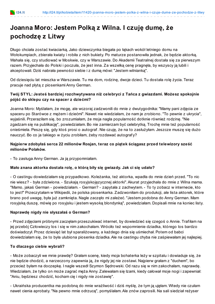l24.lt http://l24.lt/pl/ko bieta/item/11420-jo anna-mo ro -jestem-po lka-z-wilna-i-czuje-dume-ze-po cho dze-z-litwy Joanna Moro: Jestem Polką z Wilna. I czuję dumę, że pochodzę z Litwy Długo chciała zostać kwiaciarką. Jako dziewczynka biegała po łąkach wokół letniego domu na Wołokumpiach, zbierała kwiaty i robiła z nich bukiety. Po maturze postanowiła jednak, że będzie aktorką. Wahała się, czy studiować w Moskwie, czy w Warszawie. Do Akademii Teatralnej dostała się za pierwszym razem. Przyjechała do Polski i poczuła, że jest inna. Z a wszelką cenę pragnęła, by wszyscy ją lubili i akceptowali. Dziś nabrała pewności siebie i z dumą mówi: "Jestem wilnianką". Od dziesięciu lat mieszka w Warszawie. Tu ma dom, rodzinę, dwoje dzieci. Tu dostała rolę życia. Teraz pracuje nad płytą z piosenkami Anny German. Twój ST YL: Jesteś bardziej rozchwytywana niż celebryci z Tańca z gwiazdami. Możesz spokojnie pójść do sklepu czy na spacer z dziećmi? Joanna Moro: Myślałam, że mogę, ale wczoraj zadzwonili do mnie z dwutygodnika: "Mamy pani zdjęcia ze spaceru po Starówce z mężem i dziećmi". Nawet nie wiedziałam, że nam je zrobiono. "To pewnie z ukrycia", wyjaśnili. Przeraziłam się, bo zrozumiałam, że moja nagła popularność dotknie również rodzinę. "Nie zgadzam się na publikację", powiedziałam. Bo nie zamierzam być celebrytką. Trochę mnie też popularność onieśmiela. Peszę się, gdy ktoś prosi o autograf . Nie czuję, że na to zasłużyłam. Jeszcze muszę się dużo nauczyć. Bo co ja takiego w życiu zrobiłam, żeby rozdawać autograf y? Najpierw zdobyłaś serca 22 milionów Rosjan, teraz co piątek ściągasz przed telewizory sześć milionów Polaków. - To zasługa Anny German. Ja ją przypomniałam. Mało znana aktorka dostała rolę, o którą biły się gwiazdy. Jak ci się udało? - O castingu dowiedziałam się przypadkowo. Koleżanka, też aktorka, wpadła do mnie dzień przed. "To nic nie wiesz? - była zdziwiona. - Szukają rosyjskojęzycznej aktorki". Akurat przyjechała do mnie z Wilna mama. "Mamo, jakaś German - powiedziałam. - German? - zapytała z zachwytem. - To ty zobacz w internecie, kto to jest!" Przeczytałam w Wikipedii, że polska piosenkarka. Z adzwoniłam do produkcji, ale lista aktorek, które brano pod uwagę, była już zamknięta. Nagle zaczęło mi zależeć. "Jestem podobna do Anny German. Mam rosyjską duszę, mówię po rosyjsku i jestem wysoką blondynką", powiedziałam. Dopisali mnie na koniec listy. Naprawdę nigdy nie słyszałaś o German? - Przed zdjęciami próbnymi zaczęłam przeszukiwać internet, by dowiedzieć się czegoś o Annie. Traf iłam na jej przebój Człowieczy los i się w nim zakochałam. Wróciło też wspomnienie dziadka, którego los bardzo doświadczył. Przez dziesięć lat był sparaliżowany, a każdego dnia się uśmiechał. Potem od babci dowiedziałam się, że to była ulubiona piosenka dziadka. Ale na castingu chyba nie zaśpiewałam jej najlepiej. To dlaczego ciebie wybrali? - Może zobaczyli we mnie prawdę? Grałam scenę, kiedy moja bohaterka leży w szpitalu i dowiaduje się, że nie będzie chodzić, a narzeczony zapewnia ją, że nigdy jej nie zostawi. Najpierw grałam z "duchem", bo przecież byłam na doczepkę. I nagle wszedł Szymon Sędrowski. Od razu się w nim zakochałam, naprawdę. Wiedziałam, że tylko on może zagrać męża Anny. Z alewałam się łzami, kiedy całował moje nogi i zapewniał: "Aniu, będziesz chodzić, kocham cię i nigdy nie zostawię". - Ukraińska producentka ma podobną do mnie wrażliwość i dziś myślę, że tym ją ujęłam. Wtedy nie czułam nawet cienia aprobaty. "Na pewno mnie odrzucą", pomyślałam. Ale znów zaprosili. Na sali siedział reżyser Waldemar Krzystek. Poznałam go, gdy brałam udział w castingu do Małej Moskwy. Chyba słabo wtedy wypadłam, bo Krzystek zaangażował Rosjankę, Swietłanę Chodczenkową. "O, my się chyba znamy?", zawołał na mój widok. "To aktorka, która przyjechała na rowerze, spóźniła się i nie umiała tekstu", żartował. Bałaś się zagrać German? Trudno chyba zmierzyć się z legendą. - Przed wyjazdem na zdjęcia spotkałam się z jej mężem Z byszkiem Tucholskim. Bałam się, jak na mnie zareaguje. Bo choć od śmierci Anny minęło tyle czasu, dla niego ona wciąż żyje. Pan Z byszek zresztą długo na ten f ilm się nie zgadzał. To znaczy nie wyrażał zgody na wykorzystanie w nim piosenki Człowieczy los, a to kompozycja Anny German i tylko on ma do niej prawo. Spotkaliśmy się w kawiarence na Ż oliborzu. Przywitał mnie przystojny, elegancki mężczyzna. Myślę, że mimo wieku wciąż podoba się kobietom. - Ujął mnie też rozmową - jest niezwykle mądry. Próbował rozmawiać o wszystkim, ale przy nim zdałam sobie sprawę, jak mało wiem, na niewiele tematów jestem gotowa rozmawiać. "Boże, co za prowincjonalna gęś ze mnie", pomyślałam. I wtedy wpadłam w panikę: "Jak ja zagram Annę, mądrą, dostojną? Musiała taka być, skoro żyła z takim człowiekiem". Przeraziłam się: "Nie dam rady". Ale pan Z byszek sprawiał, że ten niepokój powoli zaczął mnie opuszczać. Jeszcze tego samego dnia zaprosił do domu. Twoja bohaterka miała charakterystyczny głos. Trudno było się nauczyć? - Przygotowując się do roli, brałam lekcje śpiewu u nauczycielki, która uczy metodą German. Polega ona na specjalnym otwieraniu gardła. Pierwsza lekcja była szokiem. Ona tłumaczyła, ja nic nie rozumiałam. Bo jak to pojąć: podniebienie do góry, języczek do dołu, głowa do dołu, pupa do środka. Na trzeciej lekcji zbuntowałam się: "Nie wiem, o co chodzi, mówi pani do mnie śmieszne rzeczy. - Jak tak do mnie mówisz, możesz wyjść i nie przychodzić. Mam dużo uczniów i nie mam czasu na niegrzeczne uczennice", oburzyła się. Z beształa mnie, jakbym była nastolatką! Na kolejnej lekcji zaczęłam traf iać w pierwsze dź