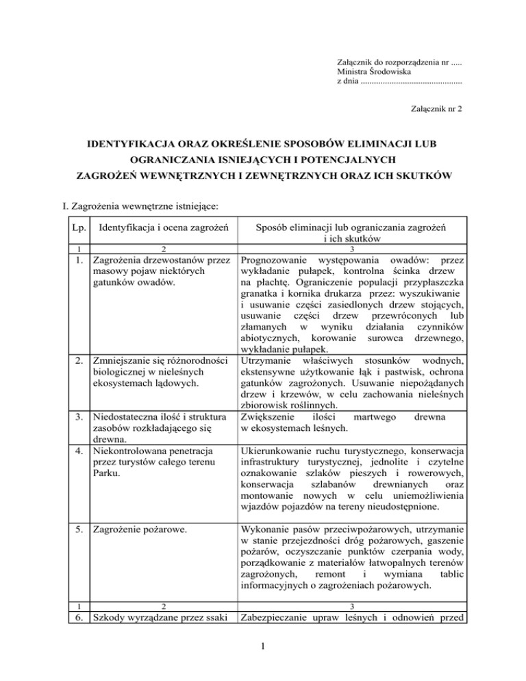 Załącznik do rozporządzenia nr ..... Ministra Środowiska z dnia .............................................. Załącznik nr 2 IDENTYFIKACJA ORAZ OKREŚLENIE SPOSOBÓW ELIMINACJI LUB OGRANICZANIA ISNIEJĄCYCH I POTENCJALNYCH ZAGROŻEŃ WEWNĘTRZNYCH I ZEWNĘTRZNYCH ORAZ ICH SKUTKÓW I. Zagrożenia wewnętrzne istniejące: Lp. Identyfikacja i ocena zagrożeń Sposób eliminacji lub ograniczania zagrożeń i ich skutków 1 2 3 1. Zagrożenia drzewostanów przez Prognozowanie występowania owadów: przez masowy pojaw niektórych wykładanie pułapek, kontrolna ścinka drzew gatunków owadów. na płachtę. Ograniczenie populacji przypłaszczka granatka i kornika drukarza przez: wyszukiwanie i usuwanie części zasiedlonych drzew stojących, usuwanie części drzew przewróconych lub złamanych w wyniku działania czynników abiotycznych, korowanie surowca drzewnego, wykładanie pułapek. 2. Zmniejszanie się różnorodności Utrzymanie właściwych stosunków wodnych, biologicznej w nieleśnych ekstensywne użytkowanie łąk i pastwisk, ochrona ekosystemach lądowych. gatunków zagrożonych. Usuwanie niepożądanych drzew i krzewów, w celu zachowania nieleśnych zbiorowisk roślinnych. 3. Niedostateczna ilość i struktura Zwiększenie ilości martwego drewna zasobów rozkładającego się w ekosystemach leśnych. drewna. 4. Niekontrolowana penetracja Ukierunkowanie ruchu turystycznego, konserwacja przez turystów całego terenu infrastruktury turystycznej, jednolite i czytelne Parku. oznakowanie szlaków pieszych i rowerowych, konserwacja szlabanów drewnianych oraz montowanie nowych w celu uniemożliwienia wjazdów pojazdów na tereny nieudostępnione. 5. Zagrożenie pożarowe. 1 Wykonanie pasów przeciwpożarowych, utrzymanie w stanie przejezdności dróg pożarowych, gaszenie pożarów, oczyszczanie punktów czerpania wody, porządkowanie z materiałów łatwopalnych terenów zagrożonych, remont i wymiana tablic informacyjnych o zagrożeniach pożarowych. 2 6. Szkody wyrządzane przez ssaki 3 Zabezpieczanie upraw leśnych i odnowień przed 1 kopytne w ekosystemach leśnych. 7. 8. 9. 10. zgryzaniem, poprzez wykonanie nowych ogrodzeń oraz naprawianie istniejących, inwentaryzacja liczebności i regulacja populacji. Eutrofizacja jezior. Wspomagające zarybienia jezior Parku, połowy regulacyjne w celu przywrócenia właściwych składów jakościowych i ilościowych populacji ryb. Niezgodność z siedliskiem Regulacja struktury gatunkowej i wiekowej składu gatunkowego, struktury drzewostanów, dolesianie luk i przerzedzeń, przestrzennej i wiekowej porządkowanie powierzchni i przygotowanie gleby drzewostanów. pod odnowienia, pielęgnacja upraw, wykonywanie cięć pielęgnacyjno-hodowlanych, odnowienie lasu poprzez sadzenie, przebudowa drzewostanów. Opanowywanie przez Eliminacja czeremchy amerykańskiej i gatunków ekspansywne gatunki obcego zwierząt obcego pochodzenia (norka amerykańska, pochodzenia siedlisk właściwych jenot). dla rodzimych roślin i zwierząt. Niedostateczny zakres Prowadzenie inwentaryzacji, badań naukowych inwentaryzacji zasobów, i monitoringu. tworów i składników przyrody. II. Zagrożenia wewnętrzne potencjalne: Lp. Identyfikacja i ocena zagrożeń 1 2 1. Obniżenie poziomu wód gruntowych. 2. Zanikanie i przekształcanie siedlisk gatunków zwierząt. 3. Rozprzestrzenianie się obcych gatunków grzybów, roślin i zwierząt. 4. Zanieczyszczenie powierzchni ziemi. 5. Zanieczyszczenie powietrza. 6. Zmniejszanie populacji rodzimych gatunków zwierząt. 1 Sposób eliminacji lub ograniczania zagrożeń i ich skutków 3 Odnawianie i konserwacja infrastruktury technicznej wspomagającej retencję wód, monitorowanie stanu wód. Zachowanie różnorodności, powierzchni i właściwego środowiska życia zwierząt, sterowanie zagęszczeniem, strukturą gatunkową, wiekową i przestrzenną grup zwierząt. Ograniczanie liczebności gatunków pierwotnie niewystępujących, a stanowiących zagrożenie dla istnienia gatunków rodzimych. Zbiórka, segregacja i wywóz odpadów stałych. Ocieplanie budynków, modernizacja systemów ogrzewania wykorzystujące źródła czystej i odnawialnej energii. Przywracanie gatunków zwierząt, które dawniej występowały na terenie Parku, ograniczanie liczebności gatunków stanowiących niebezpieczeństwo dla istnienia gatunków zagrożonych, dokarmianie zwierząt w okresie zalegania wysokiej pokrywy 2 3 śnieżnej i katastrofalnie niskich temperatur, wywieszanie budek. Zachowanie aktualnego użytkowania gruntów. 2 7. Zagrożenia drzewostanów przez masowe pojawienie się pasożytniczych grzybów. 8. Zużycie techniczne zabytków budownictwa i architektury. 9. Zniekształcenie krajobrazu. Usuwanie niektórych drzew porażonych przez rdzę kory sosny. Konserwacja i rewaloryzacja. Prace rekonstrukcyjne, hamowanie sukcesji roślin drzewiastych. III. Zagrożenia zewnętrzne istniejące: Lp. Identyfikacja i ocena zagrożeń 2. Opanowanie Parku przez gatunki obce roślin i zwierząt. Sposób eliminacji lub ograniczania zagrożeń i ich skutków Uregulowanie gospodarki wodno-ściekowej dla obiektów negatywnie oddziaływujących na zlewnię jezior Parku oraz jezior bezpośrednio graniczących z Parkiem. Preferowanie proekologicznych źródeł energii cieplnej. Utrzymanie aktualnego użytkowania na terenie enklaw wewnątrzparkowych oraz terenów leśnych na zachód od Parku w rejonie Małych Swornegaci. Zatrzymanie zainwestowania w Owinku na obecnym etapie. W otulinie preferowanie hodowli rodzimych roślin i zwierząt, hodowla zwierząt i roślin gatunków obcych wykluczająca ich rozprzestrzenianie. 3. Zwiększający się ruch turystyczny. Prowadzenie informacji turystycznej i działalności dydaktycznej. 1. Presja urbanizacji na terenie otuliny Parku, zanieczyszczenia powietrza, gleb, wód. IV. Zagrożenia zewnętrzne potencjalne: Lp. Identyfikacja i ocena zagrożeń Sposób eliminacji lub ograniczania zagrożeń i ich skutków 1