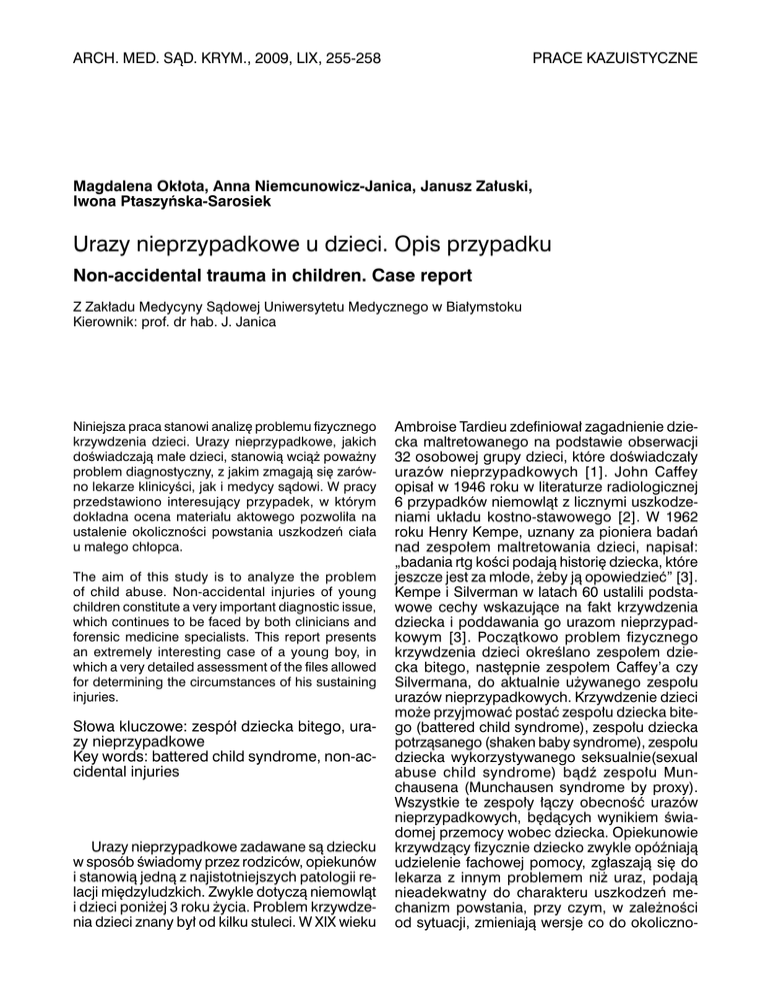 ARCH. MED. SĄD. KRYM., 2009, LIX, 255-258 PRACE KAZUISTYCZNE Magdalena Okłota, Anna Niemcunowicz-Janica, Janusz Załuski, Iwona Ptaszyńska-Sarosiek Urazy nieprzypadkowe u dzieci. Opis przypadku Non-accidental trauma in children. Case report Z Zakładu Medycyny Sądowej Uniwersytetu Medycznego w białymstoku Kierownik: prof. dr hab. J. Janica Niniejsza praca stanowi analizę problemu fizycznego krzywdzenia dzieci. Urazy nieprzypadkowe, jakich doświadczają małe dzieci, stanowią wciąż poważny problem diagnostyczny, z jakim zmagają się zarówno lekarze klinicyści, jak i medycy sądowi. W pracy przedstawiono interesujący przypadek, w którym dokładna ocena materiału aktowego pozwoliła na ustalenie okoliczności powstania uszkodzeń ciała u małego chłopca. The aim of this study is to analyze the problem of child abuse. Non-accidental injuries of young children constitute a very important diagnostic issue, which continues to be faced by both clinicians and forensic medicine specialists. This report presents an extremely interesting case of a young boy, in which a very detailed assessment of the files allowed for determining the circumstances of his sustaining injuries. Słowa kluczowe: zespół dziecka bitego, urazy nieprzypadkowe Key words: battered child syndrome, non-accidental injuries Urazy nieprzypadkowe zadawane są dziecku w sposób świadomy przez rodziców, opiekunów i stanowią jedną z najistotniejszych patologii relacji międzyludzkich. Zwykle dotyczą niemowląt i dzieci poniżej 3 roku życia. Problem krzywdzenia dzieci znany był od kilku stuleci. W XIX wieku Ambroise Tardieu zdefiniował zagadnienie dziecka maltretowanego na podstawie obserwacji 32 osobowej grupy dzieci, które doświadczały urazów nieprzypadkowych [1]. John Caffey opisał w 1946 roku w literaturze radiologicznej 6 przypadków niemowląt z licznymi uszkodzeniami układu kostno-stawowego [2]. W 1962 roku Henry Kempe, uznany za pioniera badań nad zespołem maltretowania dzieci, napisał: „badania rtg kości podają historię dziecka, które jeszcze jest za młode, żeby ją opowiedzieć” [3]. Kempe i Silverman w latach 60 ustalili podstawowe cechy wskazujące na fakt krzywdzenia dziecka i poddawania go urazom nieprzypadkowym [3]. Początkowo problem fizycznego krzywdzenia dzieci określano zespołem dziecka bitego, następnie zespołem Caffey’a czy Silvermana, do aktualnie używanego zespołu urazów nieprzypadkowych. Krzywdzenie dzieci może przyjmować postać zespołu dziecka bitego (battered child syndrome), zespołu dziecka potrząsanego (shaken baby syndrome), zespołu dziecka wykorzystywanego seksualnie(sexual abuse child syndrome) bądź zespołu Munchausena (Munchausen syndrome by proxy). Wszystkie te zespoły łączy obecność urazów nieprzypadkowych, będących wynikiem świadomej przemocy wobec dziecka. Opiekunowie krzywdzący fizycznie dziecko zwykle opóźniają udzielenie fachowej pomocy, zgłaszają się do lekarza z innym problemem niż uraz, podają nieadekwatny do charakteru uszkodzeń mechanizm powstania, przy czym, w zależności od sytuacji, zmieniają wersje co do okoliczno- 256 Magdalena Okłota ści powstania obrażeń, sygnalizują podatność dziecka na uszkodzenia. Urazy nieprzypadkowe stwierdzane u małych dzieci poniżej 3 roku życia dotyczą głównie układu kostnego i ośrodkowego układu nerwowego. USZKODZENIA SZKIELETU W PRZEbIEGU URAZóW NIEPRZYPADKOWYCH Charakterystyczne dla urazów nieprzypadkowych jest występowanie mnogich uszkodzeń struktur kostnych o różnoczasowym charakterze. Mechanizm i okoliczności powstania uszkodzenia, podane przez opiekunów, zwykle są nieadekwatne do charakteru zmian pourazowych. Najbardziej typowe dla urazów nieprzypadkowych są uszkodzenia przynasad kości długich. Dotyczą najintensywniej rosnących kości, tworzących duże stawy, jak kolanowy, skokowy, barkowy, łokciowy. Złamania lokalizują się w najbardziej podatnej na uszkodzenia, szybko rosnącej części kości w miejscu połączenia przynasad z nasadami, poniżej chrząstki wzrostowej, gdzie okostna jest słabo umocowana do powierzchni kości. Złamania o takim charakterze są często klinicznie nieme, goją się bez wytwarzania kostniny i mogą być niezauważone. Złamania przynasad kości długich zwykle są obserwowane u najmłodszych dzieci do około 18 miesiąca życia [4]. Występowanie złamań trzonów kości długich u bardzo małych dzieci, nie chodzących powinno budzić niepokój i wskazywać na możliwość powstania urazu nieprzypadkowego. Złamania trzonów wielu kości długich, w różnym stadium zrostu współistniejące z innymi zmianami pourazowymi, sugerują nieprzypadkowość ich powstania. Następstwem urazów nieprzypadkowych mogą być również złamania żeber zlokalizowane głównie w odcinkach tylnych i bocznych. Powstają one najczęściej podczas silnego uciskania klatki piersiowej małego dziecka, przy silnym chwytaniu dłońmi za klatkę piersiową podczas potrząsania dzieckiem lub przy bezpośrednim urazie działającym na tę okolicę ciała. Dotyczą zwykle małych dzieci do 2 roku życia. Diagnostyka radiologiczna świeżych złamań żeber jest bardzo trudna, często dopiero po upływie 7-10 dni, nawarstwienie okostnej bądź zniekształcenie pozwala na rozpoznanie uszkodzenia [5]. Wielomiejscowe złamania żeber o różnoczasowym charakterze stwierdzone u małego dziecka są zwykle wynikiem urazów nieprzypadkowych. Najpoważniejszy problem kliniczny stanowią dzieci ze złamaniami kości czaszki. Obecność Nr 3 kilku szczelin pęknięć w różnym stadium gojenia u dziecka poniżej 2 roku życia wskazuje na nieprzypadkową etiologię. śRóDCZASZKOWE NASTĘPSTWA URAZóW NIEPRZYPADKOWYCH Nieprzypadkowe urazy czaszkowo-mózgowe u dzieci stanowią bardzo poważny problem kliniczny i orzeczniczy. Stanowią przyczynę często nieodwracalnych, ciężkich następstw neurologicznych. Nierzadko skutkują zgonem 