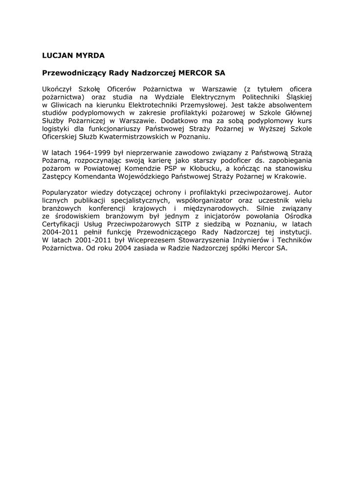 LUCJAN MYRDA Przewodniczący Rady Nadzorczej MERCOR SA Ukończył Szkołę Oficerów PoŜarnictwa w Warszawie (z tytułem oficera poŜarnictwa) oraz studia na Wydziale Elektrycznym Politechniki Śląskiej w Gliwicach na kierunku Elektrotechniki Przemysłowej. Jest takŜe absolwentem studiów podyplomowych w zakresie profilaktyki poŜarowej w Szkole Głównej SłuŜby PoŜarniczej w Warszawie. Dodatkowo ma za sobą podyplomowy kurs logistyki dla funkcjonariuszy Państwowej StraŜy PoŜarnej w WyŜszej Szkole Oficerskiej SłuŜb Kwatermistrzowskich w Poznaniu. W latach PoŜarną, poŜarom Zastępcy 1964-1999 był nieprzerwanie zawodowo związany z Państwową StraŜą rozpoczynając swoją karierę jako starszy podoficer ds. zapobiegania w Powiatowej Komendzie PSP w Kłobucku, a kończąc na stanowisku Komendanta Wojewódzkiego Państwowej StraŜy PoŜarnej w Krakowie. Popularyzator wiedzy dotyczącej ochrony i profilaktyki przeciwpoŜarowej. Autor licznych publikacji specjalistycznych, współorganizator oraz uczestnik wielu branŜowych konferencji krajowych i międzynarodowych. Silnie związany ze środowiskiem branŜowym był jednym z inicjatorów powołania Ośrodka Certyfikacji Usług PrzeciwpoŜarowych SITP z siedzibą w Poznaniu, w latach 2004-2011 pełnił funkcję Przewodniczącego Rady Nadzorczej tej instytucji. W latach 2001-2011 był Wiceprezesem Stowarzyszenia InŜynierów i Techników PoŜarnictwa. Od roku 2004 zasiada w Radzie Nadzorczej spółki Mercor SA.