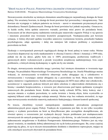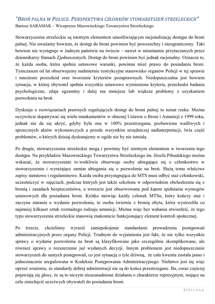 "BROŃ PALNA W POLSCE. PERSPEKTYWA CZŁONKÓW STOWARZYSZEŃ STRZELECKICH" Bartosz SARAMAK – Wiceprezes Mazowieckiego Towarzystwa Strzeleckiego Stowarzyszenia strzeleckie są istotnym elementem umożliwiającym racjonalizację dostępu do broni palnej. Nie uważamy bowiem, że dostęp do broni powinien być powszechny i nieograniczony. Taki bowiem nie występuje w żadnym państwie na świecie – nawet w nieustannie przytaczanych przez dziennikarzy Stanach Zjednoczonych. Dostęp do broni powinien być jednak racjonalny. Oznacza to, że każda osoba, która spełnia ustawowe warunki, powinna mieć prawo do posiadania broni. Tymczasem od lat obserwujemy nadmiernie restrykcyjne stanowisko organów Policji w tej sprawie i mnożenie przeszkód oraz tworzenie kryteriów pozaprawnych. Niedopuszczalna jest bowiem sytuacja, w której obywatel spełnia wszystkie ustawowo wymienione kryteria, przechodzi badania psychologiczne, zdaje egzaminy i dalej ma mniejsze lub większe problemy z uzyskaniem pozwolenia na broń. Dyskusja o rozwiązaniach prawnych regulujących dostęp do broni palnej to temat rzeka. Można oczywiście dopatrywać się wielu mankamentów w obecnej Ustawie o Broni i Amunicji z 1999 roku, jednak nie da się ukryć, gdyby była ona w 100% przestrzegana, pozbawiona wadliwych i sprzecznych aktów wykonawczych a przede wszystkim urzędniczej nadinterpretacji, lwia część problemów, o których dzisiaj dyskutujemy w ogóle nie by nie istniała. Po drugie, stowarzyszenia strzeleckie mogą i powinny być istotnym elementem w tworzeniu tego dostępu. Na przykładzie Mazowieckiego Towarzystwa Strzeleckiego im. Józefa Piłsudskiego można wskazać, że stowarzyszenie to wnikliwie obserwuje osoby ubiegające się o członkostwo w stowarzyszeniu i wyrażające zamiar ubiegania się o pozwolenie na broń. Służą temu właściwe zapisy statutowe i regulaminowe. Każda osoba przystępująca do MTS musi odbyć staż członkowski, uczestniczyć w zajęciach, podczas których jest także szkolona w odpowiednim obchodzeniu się z bronią i zasadach bezpieczeństwa, a wreszcie jest obserwowana pod kątem spełniania wymogów ustawowych dla posiadania broni. Krótko mówiąc każdy członek MTSu, który kończy staż i zaczyna starania o wydanie pozwolenia, to osoba świetnie z bronią obyta, która wystrzeliła co najmniej kilkaset sztuk rozmaitego rodzaju amunicji. Można więc bez wahania stwierdzić, że tego typu stowarzyszenia strzeleckie stanowią znakomicie funkcjonujący element kontroli społecznej. Po trzecie, chcieliśmy wyrazić zaniepokojenie standardami prowadzenia postępowań administracyjnych przez organy Policji. Trudnym do wyjaśnienia jest fakt, że nie tylko wszystkie sprawy o wydanie pozwolenia na broń są klasyfikowane jako szczególnie skomplikowane, ale również sprawy o rozszerzenie już wydanych decyzji. Innym problemem jest niedopuszczanie stowarzyszeń do samych postępowań, co jest sytuacją o tyle dziwną, że cała kwestia została jasno i jednoznacznie uregulowana w Kodeksie Postępowania Administracyjnego. Niełatwo jest się więc oprzeć wrażeniu, że standardy dobrej administracji nie są do końca przestrzegane. Ba, coraz częściej pojawiają się głosy, że są to niczym nieuzasadnione działania o charakterze represyjnym, mające na celu zniechęcić uczciwych obywateli do posiadania broni. 1|S t r o n a Po czwarte, z niepokojem obserwujemy działania Policji dotyczące członków stowarzyszeń, a sprowadzające się do tworzenia pozaustawowych kryteriów dostępu do broni. Dotyczy to w szczególności ograniczania liczby sztuk broni (do 10 w przypadku starania się o pozwolenie do celów kolekcjonerskich), żądania wykazania potrzeby posiadania określonych rodzajów broni w przypadku ubiegania się o pozwolenie do celów sportowych itp. Jest to o tyle niepokojące, gdyż godzi bezpośrednio w konstytucyjną zasadę demokratycznego państwa prawa. Skoro ustawodawca nie przewidział możliwości ograniczenia w decyzji liczby posiadanych jednostek broni, to organ wydający pozwolenie nie powinien takich zabiegów stosować. Przysparza to bowiem tylko dodatkowych i niepotrzebnych kosztów przy procedurze rozszerzenia decyzji. Problemów, o których warto by wspomnieć, jest znacznie więcej i przynajmniej część z nich nasze Towarzystwo stara się w miarę swoich skromnych możliwości naprawiać. Przykładem takiego działania jest zainicjowanie przez MTS postępowania w sprawie sprzeczności z ustawą rozporządzenia MSW dotyczącego wzorów legitymacji posiadacza broni. W rezultacie doprowadziło to do wydania przez Ministra Spraw Wewnętrznych nowego rozporządzenia (ogłoszonego w Dz. U. z 11 kwietnia) uwzględniającego stanowisko MTS. Co to oznacza dla środowiska strzeleckiego? Nowe rozporządzenie spowoduje, że z książeczek posiadacza broni zniknie pozaprawny zakaz nabywania amunicji przez osoby posiadające pozwolenie na broń do celów kolekcjonerskich oraz pamiątkowych. Stowarzyszenia strzeleckie mogą i powinny być jednym z elementów działających na rzecz obronności Polski. Dzisiaj młody człowiek nie ma żadnej możliwości zapoznania się z zasadami prawidłowego obchodzenia się z bronią. Nie daje mu tego szkoła, w której tego typu zajęcia nie są prowadzone. Nie ma obowiązkowej służby wojskowej. Historia naszego kraju oraz jego geopolityczne położenie dowodzi bowiem, że powszechne obycie obywateli z bronią powinno stać się jednym z filarów strategii obrony naszego państwa. Dlatego też stowarzyszenia strzeleckie powinny kontynuować tradycję podobnych związków działających w przeszłości oraz kultywować i umacniać tradycję posiadania przez Polaków broni palnej. Mamy nadzieję, że działalność MTSu wpisuje się w pełni tę tradycję. Jako stowarzyszenie współpracujemy bowiem szeroko ze środowiskiem harcerskim, studentami Bezpieczeństwa Wewnętrznego Uniwersytetu Warszawskiego – prowadzą