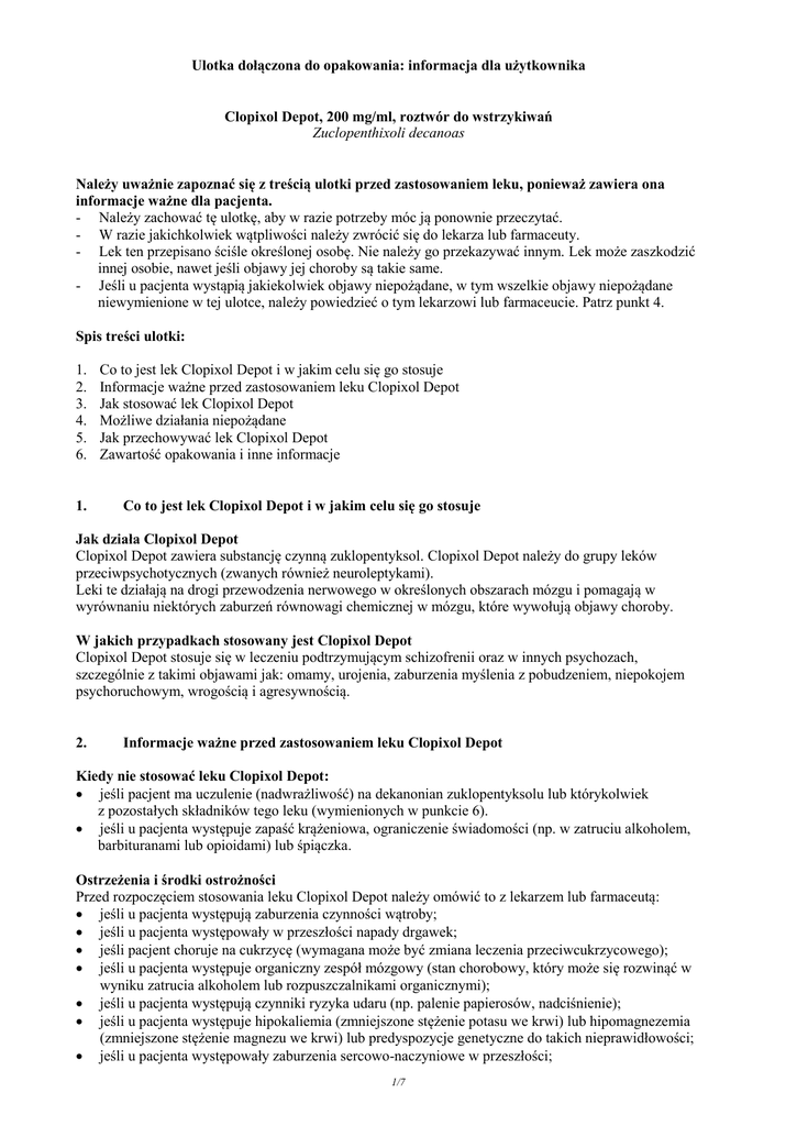 Ulotka dołączona do opakowania: informacja dla użytkownika Clopixol Depot, 200 mg/ml, roztwór do wstrzykiwań Zuclopenthixoli decanoas Należy uważnie zapoznać się z treścią ulotki przed zastosowaniem leku, ponieważ zawiera ona informacje ważne dla pacjenta. - Należy zachować tę ulotkę, aby w razie potrzeby móc ją ponownie przeczytać. - W razie jakichkolwiek wątpliwości należy zwrócić się do lekarza lub farmaceuty. - Lek ten przepisano ściśle określonej osobę. Nie należy go przekazywać innym. Lek może zaszkodzić innej osobie, nawet jeśli objawy jej choroby są takie same. - Jeśli u pacjenta wystąpią jakiekolwiek objawy niepożądane, w tym wszelkie objawy niepożądane niewymienione w tej ulotce, należy powiedzieć o tym lekarzowi lub farmaceucie. Patrz punkt 4. Spis treści ulotki: 1. 2. 3. 4. 5. 6. 1. Co to jest lek Clopixol Depot i w jakim celu się go stosuje Informacje ważne przed zastosowaniem leku Clopixol Depot Jak stosować lek Clopixol Depot Możliwe działania niepożądane Jak przechowywać lek Clopixol Depot Zawartość opakowania i inne informacje Co to jest lek Clopixol Depot i w jakim celu się go stosuje Jak działa Clopixol Depot Clopixol Depot zawiera substancję czynną zuklopentyksol. Clopixol Depot należy do grupy leków przeciwpsychotycznych (zwanych również neuroleptykami). Leki te działają na drogi przewodzenia nerwowego w określonych obszarach mózgu i pomagają w wyrównaniu niektórych zaburzeń równowagi chemicznej w mózgu, które wywołują objawy choroby. W jakich przypadkach stosowany jest Clopixol Depot Clopixol Depot stosuje się w leczeniu podtrzymującym schizofrenii oraz w innych psychozach, szczególnie z takimi objawami jak: omamy, urojenia, zaburzenia myślenia z pobudzeniem, niepokojem psychoruchowym, wrogością i agresywnością. 2. Informacje ważne przed zastosowaniem leku Clopixol Depot Kiedy nie stosować leku Clopixol Depot: jeśli pacjent ma uczulenie (nadwrażliwość) na dekanonian zuklopentyksolu lub którykolwiek z pozostałych składników tego leku (wymienionych w punkcie 6). jeśli u pacjenta występuje zapaść krążeniowa, ograniczenie świadomości (np. w zatruciu alkoholem, barbituranami lub opioidami) lub śpiączka. Ostrzeżenia i środki ostrożności Przed rozpoczęciem stosowania leku Clopixol Depot należy omówić to z lekarzem lub farmaceutą: jeśli u pacjenta występują zaburzenia czynności wątroby; jeśli u pacjenta występowały w przeszłości napady drgawek; jeśli pacjent choruje na cukrzycę (wymagana może być zmiana leczenia przeciwcukrzycowego); jeśli u pacjenta występuje organiczny zespół mózgowy (stan chorobowy, który może się rozwinąć w wyniku zatrucia alkoholem lub rozpuszczalnikami organicznymi); jeśli u pacjenta występują czynniki ryzyka udaru (np. palenie papierosów, nadciśnienie); jeśli u pacjenta występuje hipokaliemia (zmniejszone stężenie potasu we krwi) lub hipomagnezemia (zmniejszone stężenie magnezu we krwi) lub predyspozycje genetyczne do takich nieprawidłowości; jeśli u pacjenta występowały zaburzenia sercowo-naczyniowe w przeszłości; 1/7 jeśli pacjent przyjmuje inne leki przeciwpsychotyczne; jeśli u pacjenta lub u kogoś z jego rodziny występowały zakrzepy żylne, ponieważ stosowanie leków takich jak ten wiąże się z powstawaniem zakrzepów. Dzieci i młodzież Clopixol Depot nie jest zalecany w tej grupie pacjentów. Lek Clopixol Depot a inne leki Należy powiedzieć lekarzowi lub farmaceucie o wszystkich lekach przyjmowanych przez pacjenta obecnie lub ostatnio, a także o lekach, które pacjent planuje stosować. Należy powiedzieć lekarzowi prowadzącemu o stosowaniu wymienionych poniżej leków: trójpierścieniowych leków przeciwdepresyjnych; guanetydyny i podobnych leków (obniżających ciśnienie krwi); barbituranów i podobnych leków (wywołujących senność); leków stosowanych w leczeniu padaczki; lewodopy i podobnych leków (stosowanych do leczenia choroby Parkinsona); metoklopramidu (leku stosowanego w zaburzeniach żołądkowo-jelitowych); piperazyny (leku przeciwpasożytniczego, działającego na owsiki i glisty ludzkie); leków zaburzających równowagę wodno-elektrolitową (za mało potasu lub magnezu we krwi); leków, o których wiadomo, że zwiększają stężenie we krwi zuklopentyksolu, substancji czynnej leku Clopixol Depot. Następujące leki nie powinny być przyjmowane równocześnie z lekiem Clopixol Depot: leki zmieniające akcję serca (chinidyna, amiodaron, sotalol, dofetylid, erytromycyna, terfenadyna, astemizol, gatyfloksacyna, moksyfloksacyna, cyzapryd, lit); inne leki przeciwpsychotyczne (np. tiorydazyna); leki upośledzające czynność szpiku kostnego, np. leki stosowane w leczeniu nowotworów. Stosowanie leku Clopixol Depot z jedzeniem, piciem i alkoholem Clopixol Depot może nasilać uspokajające działanie alkoholu, powodując senność. Nie zaleca się picia napojów zawierających alkohol podczas stosowania leku Clopixol Depot. Ciąża, karmienie piersią i wpływ na płodność Jeśli pacjentka jest w ciąży lub karmi piersią, przypuszcza że może być w ciąży lub gdy planuje mieć dziecko, powinna poradzić się lekarza lub farmaceuty przed zastosowaniem tego leku. Ciąża Jeśli pacjentka jest w ciąży lub przypuszcza że może być w ciąży, powinna poinformować o tym lekarza prowadzącego. Clopixol Depot nie powinien być stosowany u kobiet w ciąży, chyba że jest to zdecydowanie konieczne. U noworodków matek, które stosowały lek Clopixol w trzecim trymestrze ciąży (ostatnie trzy miesiące ciąży) wystąpić mogą następujące objawy: drżenia, sztywność i/lub osłabienie mięśni, senność, pobudzenie, problemy z oddychaniem, trudności w karmieniu. Jeśli u noworodka wystąpią takie objawy należy skontaktować się z lekarzem. Karmienie piersią Jeśli pacjentka karmi piersią, powinna skonsultować się z lekarzem prowadzącym. Clopi