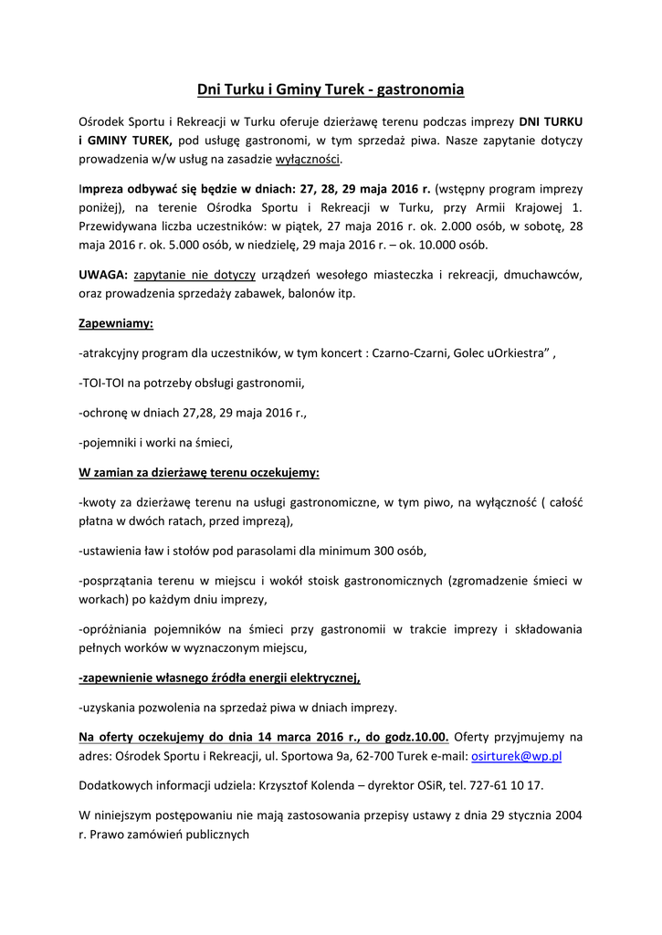 Dni Turku i Gminy Turek - gastronomia Ośrodek Sportu i Rekreacji w Turku oferuje dzierżawę terenu podczas imprezy DNI TURKU i GMINY TUREK, pod usługę gastronomi, w tym sprzedaż piwa. Nasze zapytanie dotyczy prowadzenia w/w usług na zasadzie wyłączności. Impreza odbywać się będzie w dniach: 27, 28, 29 maja 2016 r. (wstępny program imprezy poniżej), na terenie Ośrodka Sportu i Rekreacji w Turku, przy Armii Krajowej 1. Przewidywana liczba uczestników: w piątek, 27 maja 2016 r. ok. 2.000 osób, w sobotę, 28 maja 2016 r. ok. 5.000 osób, w niedzielę, 29 maja 2016 r. – ok. 10.000 osób. UWAGA: zapytanie nie dotyczy urządzeń wesołego miasteczka i rekreacji, dmuchawców, oraz prowadzenia sprzedaży zabawek, balonów itp. Zapewniamy: -atrakcyjny program dla uczestników, w tym koncert : Czarno-Czarni, Golec uOrkiestra” , -TOI-TOI na potrzeby obsługi gastronomii, -ochronę w dniach 27,28, 29 maja 2016 r., -pojemniki i worki na śmieci, W zamian za dzierżawę terenu oczekujemy: -kwoty za dzierżawę terenu na usługi gastronomiczne, w tym piwo, na wyłączność ( całość płatna w dwóch ratach, przed imprezą), -ustawienia ław i stołów pod parasolami dla minimum 300 osób, -posprzątania terenu w miejscu i wokół stoisk gastronomicznych (zgromadzenie śmieci w workach) po każdym dniu imprezy, -opróżniania pojemników na śmieci przy gastronomii w trakcie imprezy i składowania pełnych worków w wyznaczonym miejscu, -zapewnienie własnego źródła energii elektrycznej, -uzyskania pozwolenia na sprzedaż piwa w dniach imprezy. Na oferty oczekujemy do dnia 14 marca 2016 r., do godz.10.00. Oferty przyjmujemy na adres: Ośrodek Sportu i Rekreacji, ul. Sportowa 9a, 62-700 Turek e-mail: [email protected] Dodatkowych informacji udziela: Krzysztof Kolenda – dyrektor OSiR, tel. 727-61 10 17. W niniejszym postępowaniu nie mają zastosowania przepisy ustawy z dnia 29 stycznia 2004 r. Prawo zamówień publicznych Dni Turku i Gminy Turek 27,28,29 maja 2016 27 maja 2016 (piątek), Godzina 17.00 – 23.00 – scena chałtura – występy lokalnych zespołów 28 maja 2016 ( sobota), Godz.14.00 - Gry, konkursy, zabawy, atrakcje dla dzieci i rodzin, koncerty Godz.15.00-17.30-koncert zespołu „ZEUS” Godz.19.00-koncert zespołu „ Poparzeni Kawą Trzy ” Godz.21.00- koncert zespołu „Niecik” Godz.22.30 – 24.00 dyskoteka 29 maja 2016 ( niedziela), Godz.15.00 – 18.00 - gry, konkursy, zabawy, atrakcje dla dzieci i rodzin, koncerty, Godz.18.00 - koncert zespołu „Czarno-Czarni” Godz.20.00 - koncert zespołu „ Golec uOrkiestra”
