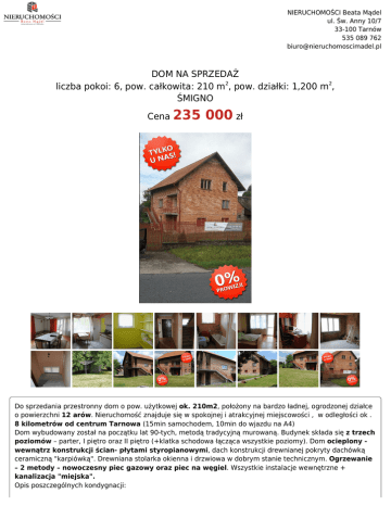 NIERUCHOMOŚCI Beata Mądel ul. Św. Anny 10/7 33-100 Tarnów 535 089 762 [email protected] DOM NA SPRZEDAŻ liczba pokoi: 6, pow. całkowita: 210 m2, pow. działki: 1,200 m2, ŚMIGNO Cena 235 000 zł Do sprzedania przestronny dom o pow. użytkowej ok. 210m2, położony na bardzo ładnej, ogrodzonej działce o powierzchni 12 arów. Nieruchomość znajduje się w spokojnej i atrakcyjnej miejscowości , w odległości ok . 8 kilometrów od centrum Tarnowa (15min samochodem, 10min do wjazdu na A4) Dom wybudowany został na początku lat 90-tych, metodą tradycyjną murowaną. Budynek składa się z trzech poziomów – parter, I piętro oraz II piętro (+klatka schodowa łącząca wszystkie poziomy). Dom ocieplony wewnątrz konstrukcji ścian- płytami styropianowymi, dach konstrukcji drewnianej pokryty dachówką ceramiczną "karpiówką". Drewniana stolarka okienna i drzwiowa w dobrym stanie technicznym. Ogrzewanie – 2 metody – nowoczesny piec gazowy oraz piec na węgiel. Wszystkie instalacje wewnętrzne + kanalizacja "miejska". Opis poszczególnych kondygnacji: NIERUCHOMOŚCI Beata Mądel ul. Św. Anny 10/7 33-100 Tarnów 535 089 762 [email protected] PARTER- stan "deweloperski" – gładzie na ścianach, pomalowane- NIEZALEŻNE WEJŚCIE Z ZEWNĄTRZ -pomieszczenie garażowe- przestronne, na podłodze flizy -kotłownia- flizy, w pomieszczeniu 2 piece – gazowy i na węgiel -łazienka/suszarnia– flizy na podłodze i ścianach, toaleta, wanna, wc, umywalka. - 2 pomieszczenia- podłoga betonowa, gładź i farba na ścianach -korytarz- flizy na podłodze, przestronny i prowadzący do wyjścia na zewnątrz I PIĘTRO – stan "pod klucz" tj. do zamieszkania od razu- parkiety drewniane/flizy na podłogach, ściany malowane białe i kolorowe, gdzieniegdzie ozdobna sztukateria – NIEZALEŻNE WEJŚCIE Z ZEWNĄTRZ + WYJŚCIE NA TARAS + BALKON -kuchnia- flizy na podłodze, w pełni umeblowana, sprzęt AGD oraz szafki, stół i krzesła -spiżarka- flizy + półki -duży salon- parkiet na podłodze, umeblowany w stół i krzesła oraz regały, wyjście na duży taras (z którego można zejść dodatkowymi schodami na podwórko) -sypialnia- parkiet na podłodze, duże łoże, szafa przesuwna i meble, stolik RTV -gabinet- parkiet na podłodze, biurko komputerowe i regały -łazienka- flizy na ścianach i podłodze, wanna, umywalka i wc oraz piec 2-funkcyjny gazowy -duży i przestronny korytarz- parkiet na podłodze, -garderoba- parkiet na podłodze, wieszaki II PIĘTRO – stan "surowy" – wejście przez klatkę schodową z I piętra, balkon, wyjście na dach -4 przestronne, osobne pomieszczenia, z możliwością adaptacji na pokoje lub łazienkę/kuchnię (wyprowadzone instalacje), stan surowy, stolarka okienna drewniana -przestronny korytarz Na działce oprócz domu znajduje się dodatkowo garaż- blaszak, aktualnie pełniący rolę warsztatu. Nieruchomość położona w spokojnej i zielonej okolicy, w pobliżu przystanek MPK (autobus do Tarnowa/Lisiej Góry), niedaleko znajduje się sklep, szkoła i kościół. Symbol 59/MDL/ODS Typ nieruchomości DOM Rodzaj transakcji SPRZEDAŻ Status AKTUALNA Rodzaj rynku WTÓRNY Nieruchomość dostępna od 2015-08-18 Cena 235 000 PLN Stara cena 249 000 PLN Cena za m2 1 119,05 PLN Cena negocjowana TAK Kraj POLSKA Województwo MAŁOPOLSKIE Powiat m. Tarnów Gmina Tarnów Miejscowość ŚMIGNO Kod pocztowy 33-100 Położenie działki TEREN PŁASKI Wygląd działki ZABUDOWANA Położenie POD MIASTEM Budynki w sąsiedztwie OSIEDLE DOMÓW WIELORODZINNYCH NIERUCHOMOŚCI Beata Mądel ul. Św. Anny 10/7 33-100 Tarnów 535 089 762 [email protected] Pow. całkowita 210,00 m2 Pow. działki 1 200,00 m2 Kształt działki KWADRAT Pow. użytkowa 210,00 m2 Forma własności działki WŁASNOŚĆ Typ domu WOLNOSTOJĄCY Przeznaczenie MIESZKALNE Rodzaj budynku DOM Rok budowy 1990 Standard DO REMONTU Konstrukcja budynku MUROWANA Technika budowy TRADYCYJNA Typ kuchni Z OKNEM Liczba łazienek 2 Droga dojazdowa LOKALNA DROGA Rodzaj nawierzchni ASFALTOWA / KOSTKA Liczba pokoi 6 Liczba pięter 3 Źródło c.w. GAZOWY 2-OBIEGOWY Ogrzewanie C.O. GAZOWE, C.O. WĘGLOWE Podpiwniczenie /piwnica PODPIWNICZONY Forma własności ODRĘBNA WŁASNOŚĆ Energia elektryczna JEST Napięcie 400V (siła) JEST Podłączony gaz JEST Podłączony wodociąg JEST Podłączona kanalizacja JEST Rodzaj kanalizacji MIEJSKA Źródło wody WODA MIEJSKA Głośność okolicy UMIARKOWANIE CICHE Kuchnia gazowa JEST Rodzaj okien DREWNIANE Pokrycie dachu DACHÓWKA CERAMICZNA Kształt dachu DWUSPADOWY Poddasze UŻYTKOWE Rodzaj podłogi PARKIET, TERAKOTA Rodzaj ogrodzenia METALOWE, SIATKA Ogrodzenie PEŁNE Czy jest KW JEST Garaż JEST Ogródek JEST Pomieszczenie gospodarcze JEST Balkon JEST Taras JEST Beata Mądel właściciel biura 535089762 [email protected] Więcej ofert na stronie www.madelnieruchomosci.pl