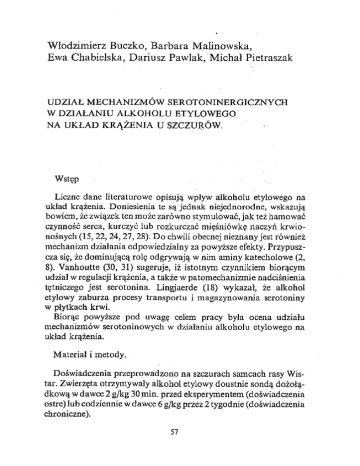 Włodzimierz Buczka, Barbara Malinowska, Ewa Cha bielska, Dariusz Pawlak, Micha! Pietraszak UDZIAŁ MECHANIZMÓW SEROTONINERGICZNYCH W DZIAŁANIU ALKOHOLU ETYLOWEGO NA UKŁAD KRĄŻENIA U SZCZURÓW. Wstęp Liczne dane literaturowe opisują wpływ ałkoholu etylowego na Doniesienia te są jednak niejednorodne, wskazują bowiem, że związek ten może zarówno stymulować, jak też hamować czynność serca, kurczyć lub rozkurczać mięśniówkę naczyń krwionośnych (15,22,24,27,28). Do chwili obecnej nieznany jest również mechanizm działania odpowiedzialny za powyższe efekty. Przypuszcza się, że dominującą rolę odgrywają w nim aminy katecholowe (2, 8). Vanhoutte (30, 31) sugeruje, iż istotnym czynnikiem biorącym udział w regulacji krążenia, a także w patomechanizmie nadciśnienia tętniczego jest serotonina. Lingjaerde (18) wykazał, że alkohol etylowy zaburza procesy transportu i magazynowania serotoniny w płytkach krwi. Biorąc powyższe pod uwagę celem pracy była ocena udziału mechanizmów serotoninowych w działaniu alkoholu etylowego na układ krążenia. układ krążenia. Materiał i metody. Doświadczenia przeprowadzono na szczurach samcach rasy Wistar. Zwierzęta otrzymywały alkohol etylowy doustnie sondą dożołą dkową w dawce 2 g/kg 30min. przed eksperymentem (doświadczenia ostre) lub codziennie w dawce 6 g/kg przez 2 tygodnie (doświadczenia chroniczne). 57 Zastosowano następujące metody: - ocena stężenia alkoholu etylowego we krwi wg Curry i wsp. (7), - ocena ciśnienia krwi oraz częstości akcji serca u szczurów uśpionych, czuwających i odrdzenionych (20), - ocena skurczu izolowanej tętnicy ogonowej wg Nicholasa (23), - agregacja płytek krwi wg Borna i Crossa (5), poziom serotoniny w płytkach krwi (10), wychwyt i uwalnianie znakowanej serotoniny (12, 18). Wyniki poddano analizie statystycznej wg testu t-Studenta. Wyniki Wykazano, iż alkohol etylowy podany dożołądkowo w dawce 2 g/kg przenikal szybko do krwi osiągając maksymalne stężenie 2.05 ~ 0.27 mg/mi (50 mM) w 30 minucie od chwili jego podania. Następnie jego stężenie ulegało powolnemu obniżeniu i w 120 min. wyniosło 0.73 ~ 0.08 mg/kg. (rab 1). Tabela 1 Kinetyka etanolu we krwi podanego dożołądkowo w dawce 2g/kg czas (min) stężenie n=5 etanolu (mg/mi) o 0.06~ 0,01 1.86 ~0.20 2.05 ~0.27 1.83 ~0.J9 1.10 ~0.12 0.96 ~0.12 0.73 ~0.08 15 30 45 60 90 120 Biorącpowyższe pod uwagę w doświadczeniach ostrych działanie alkoholu etylowego na uklad krążenia i udział w nim mechanizmów serotoninowych oceniano w przedziale czasowym 30-60 min. tj. w okresie największego stężenia tego związku we krwi. Już wstępne wyniki badań wykazały, iż działanie etanolu na układ krążenia szczura w dużej mierze zależy od rodzaju eksperymentu i tak 58 u zwierząt nie uśpionych etanol wywoływał obniżenie ciśnienia krwi. Spadek ten w 30 min. od chwili podania etanolu 10.02:. 6.7 mmHg (rab 2). tętniczego wynosił Tabela 2 Wplyw etanolu, 2gjkg p.o., na ciśnienie krwi Bezwzględna wartość omin. 30 min. O 4.4 2:. 7.0 -10.02:.6.7*' RR /':,.RR szczur kontrola etanol /':,.RR szczur kontrola etanol czuwający n=8 124.22:. 4.2 ł1 0.1 2:. 11.3 . uśpiony n=10 105.32:. 18.0 101.3 2:. 11.4 O 2.6 2:. 6.1 -15.0 ~ 4.5** O -0.2 4.6 /':,.RR szczur odrdzeniony n=8 kontrola etanol 52.5 46.6 ~ ~ 5.7 3.4 ~ ~ 1.9 5.1 < Zmiany istotne statystycznie w porównaniu z kontrolą *'p 0.01 Znacznie silniejszy efekt hipotensyjny wykazano w doświadcze niach przeprowadzonych na zwierzętach uśpionych Vetbutałem, gdzie w 30 min. odserwowano obniżenie ciśnienia tętniczego krwi o 15.0 ~ 4.5 mmHg. U szczurów odrdzenionych, a więc pozbawionych regulacji ze strony ośrodkowego· układu nerwowego, obniżenie ciśnienia tętniczego krwi po obciążeniu etanolem było niewielkie i w 30 min. wyniosło 4.6 ~ 5.1 mmHg (rab 2). W grupie szczurów uśpionych zarejestrowano wzrost czynności akcji serca (w 30 min.) o 37.4 ~ 22.2 uderzeń/min. (rab 3). Natomiast całkowicie odmienną odpowiedź uzyskano ze strony mięśnia sercowego zwierząt odrdzenionych. Szczury odrodzenione reagowały zmniejszeniem ilości uderzeń mięśnia sercowego (-10.7 ~ 22.8 uderzeń/min. w 30 min.). 59 Tabela 3 Wplyw etanolu, 2g/kg p.o., na czynność serca (HR) Bezwzględna wartość 6HR HR Omin. (uderzeńjmin) kontrola etanol 390.0.:': 38.7 387.0.:': 33.6 szczury uśpione O O 5.9.:': 18.2 37.4.:': 22.2** szczury kontrola etanol· 331.7.:':16.7 . 320.3 .:': 15.5 30 min. odrdzenione O O n = 10 n=8 -11.7.:': 18.9 -10.7.:': 22.8" " Zmiany istotnestatystycznie w porównaniu z grupą kontrolną ** p (0.01 Zmiany istotne statystycznie pomiędzy grupąszczurów uśpionych i odrdzenionych " "p om Można zatem przypuszczać, że w mechaniźmie działania alkoholu etylowego na układ krążenia szczura istotną rolę odgrywa ośrod kowy układ nerwowy. W dalszych badaniach wykazano, że etanol wywołuje skurcz izolowanej aorty i tętnicy ogonowej szczura. Związek ten w stężeniach 0.03; 0.1; 0.3; 1.0; 3.0 i 10 M/l powodował zależny od dawki wzrost napięcia tych fragmentów naczyń. Należy jednak podkreślić, że wrażliwość aorty na działanie alkoholu była mniejsza niż tętnicy ogonowej oraz to, że stężenia wywołujące skurcz praktycznie nigdy nie występują w ustroju żywym. Dalsze badania wykazały, że wdoświaaczeniach ostrych alkohol etylowy osłabiał kurczące działanie serotoniny zarówno w doświadczeniach in vivo (zwierzęta odrdzenione), jak też w eksperymentach in vitro (izolowane tętnice szczurów). Wyniki badań wykonanych na krwinkach płytkowych wskazują, że alkohol etylowy w dawce 2 g/kg zmniejszał zawartość serotoniny w tych komórkach z 0.9 .:': 0.2 do 0.5 .:': 0.1 ug/109 płytek. Ponadto stwierdzono, iż związek ten modyfikował procesy transportu serotoniny przez błony komórkowe. Hamował 60 bowiem wychwyt znakowanej 5HT o około 19 %. W badaniach in vitro wykazano także, iż etanol w sp
