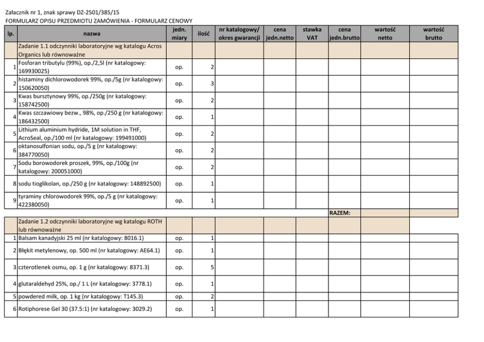 Załacznik nr 1, znak sprawy DZ-2501/385/15 FORMULARZ OPISU PRZEDMIOTU ZAMÓWIENIA - FORMULARZ CENOWY jedn. nr katalogowy/ cena lp. nazwa ilość miary okres gwarancji jedn.netto Zadanie 1.1 odczynniki laboratoryjne wg katalogu Acros Organics lub równoważne Fosforan tributylu (99%), op./2,5l (nr katalogowy: op. 2 1 169930025) histaminy dichlorowodorek 99%, op./5g (nr katalogowy: 2 op. 3 150620050) Kwas bursztynowy 99%, op./250g (nr katalogowy: 3 op. 2 158742500) Kwas szczawiowy bezw., 98%, op./250 g (nr katalogowy: 4 op. 1 186432500) Lithium aluminium hydride, 1M solution in THF, 5 op. 2 AcroSeal, op./100 ml (nr katalogowy: 199491000) oktanosulfonian sodu, op./5 g (nr katalogowy: 6 op. 2 384770050) Sodu borowodorek proszek, 99%, op./100g (nr 7 op. 2 katalogowy: 200051000) 8 sodu tioglikolan, op./250 g (nr katalogowy: 148892500) op. 1 tyraminy chlorowodorek 99%, op./5 g (nr katalogowy: 422380050) op. 1 9 stawka VAT cena jedn.brutto RAZEM: Zadanie 1.2 odczynniki laboratoryjne wg katalogu ROTH lub równoważne 1 Balsam kanadyjski 25 ml (nr katalogowy: 8016.1) op. 1 2 Błękit metylenowy, op. 500 ml (nr katalogowy: AE64.1) op. 1 3 czterotlenek osmu, op. 1 g (nr katalogowy: 8371.3) op. 5 4 glutaraldehyd 25%, op./ 1 L (nr katalogowy: 3778.1) op. 1 5 powdered milk, op. 1 kg (nr katalogowy: T145.3) op. 2 6 Rotiphorese Gel 30 (37.5:1) (nr katalogowy: 3029.2) op. 1 wartość netto wartość brutto Rotisilon A - Smar silikonowy i środek antyadhezyjny, 7 guma-szkło, płynny. od -48 do 150 C; op. 250 ml (nr katalogowy: 0830.1) op. 1 RAZEM: Zadanie 1.3 odczynniki laboratoryjne wg katalogu Prona lub równoważne 1 Agarose Bio Standard, 500g (nr katalogowy: BS500) op. 1 RAZEM: 1 2 3 4 5 Zadanie 1.4 odczynniki laboratoryjne wg katalogu Promega lub równoważne Agarose, LE, Analytical Grade 100 g (nr katalogowy: V3121) Ethidium Bromide Solution, Molecular Grade (nr katalogowy: H5041) Luciferase Assay System, 1000 Assays (nr katalogowy: E1501) Luciferase Cell Culture Lysis 5X reagent, op./30 ml (nr katalogowy: E1531) Steady-Glo Luciferase Assay System, op./ 100 ml (nr katalogowy: E2520) 6 Water, nuclease-free, op. 50 ml (nr katalogowy: P1193 ) op. 2 op. 1 op. 8 op. 3 op. 1 op. 2 RAZEM: 1 2 3 4 5 Zadanie 1.5 odczynniki laboratoryjne wg katalogu BIO RAD lub równoważne 10% Ready Gel Zymogram Gel, 10 well, 50 ul, op./1szt. (nr katalogowy: 1611167) 10-20% Mini-PROTEAN Tris-Tricine Gel, 10 well, 30 ul, op./2 szt. (nr katalogowy: 4563113 ) 30% Acrylamide/Bis Solution, 29:1 (nr katalogowy: 1610156) 4-20% Criterion TGX Precast Midi Protein Gel, 18 well, 30 ul, op./1 szt. (nr katalogowy: 5671094) 4-20% Criterion TGX Precast Midi Protein Gel, Prep+2 well, 700 ul, op./1szt. (nr katalogowy: 5671092 ) op. 14 op. 8 op 5 op. 6 op. 6 4-20% Mini-PROTEAN TGX Precast Protein Gels, 7 cm 6 IPG/prep well, 250 ul, op./10szt. (nr katalogowy: 4561091) op. 2 Any kD Mini-PROTEAN TGX Precast Protein Gels, 10-well, 30 ul, op./10szt. (nr katalogowy: 4569033 ) op. 1 Any kD Mini-PROTEAN TGX Precast Protein Gels, 7 cm 8 IPG/prep well, 250ul, op. 10szt. (nr katalogowy: 4569031 ) op. 1 9 APS- Amonium persulfate (nr katalogowy: 161-0700) op 2 op 1 op. 1 op. 3 op. 2 op. 4 op. 9 op. 2 op. 2 op. 1 op. 2 7 Clarity Western ECl Substrate, 200ml (nr katalogowy: 170-5060) 11 Laemmli Sample Buffer (nr katalogowy: 161-0737) 10 12 13 14 15 16 17 18 19 Mini-PROTEAN TGX Gels, 10 gels/box, 7 cm IPG strip, 420% resolving gels (nr katalogowy: 4561091) Mini-PROTEAN TGX precast gel, 4-15%, 10-well (nr katalogowy: 4561083) Mini-PROTEAN TGX precast gel, 4-20%, 10-well (nr katalogowy: 4561093) pH 3-10 Ready Gel, IEF Gel, 10 well, 50ul (nr katalogowy: 1611165 ) precision plus protein kaleidoscope standards (nr katalogowy: 1610375) Silver stain plus kit (nr katalogowy: 161-0449) silver stain sds-page standards, low range (nr katalogowy: 1610314) TEMED, op. 5 ml (nr katalogowy: 161-0800) RAZEM: Zadanie 1.6 odczynniki laboratoryjne wg katalogu DiaPath lub równoważne 1 Greenfix 5L (nr katalogowy: P0116) 2 GreenFix Plus 5L (nr katalogowy: P0146) op. op. 2 2 RAZEM: Zadanie 1.7 substancje promieniotwórcze wg katalogu Perkin Elmer lub równoważne 1 Insta-Gel Plus, 2x5L (nr katalogowy: 6013399) op. 1 2 Thymidine [Methyl-3H] (nr katalogowy: NET027X001MC) op. 2 RAZEM: Zadanie 1.8 odczynniki laboratoryjne wg katalogu BioMerieux lub równoważne 1 AirLife 0.45% Sodium Chloride (nr katalogowy: V1204) op. 10 2 Evans Blue (nr katalogowy: 75491) op. 5 3 Fiolet krystaliczny, op./500 ml (nr katalogowy: 29524) op. 1 4 Fluoprep, op. 1 x 15 ml (nr katalogowy: 75521) 5 Fuksyna, op./500 ml (nr katalogowy: 29522) 6 NaCl 0,85% Medium (nr katalogowy: 20070) op. op. op. 3 1 3 7 NOZZLE CLEANING SOLUTION 5l (nr katalogowy: 29525) op. 1 8 NUCLISENS LYSIS BUFFER (4x1l.) (nr katalogowy: 280134) op. 1 9 Rapid ID32 STREP (nr katalogowy: 32600) op. 12 RAZEM: Zadanie 1.9 odczynniki laboratoryjne wg katalogu POURQUIER lub równoważne Stężony bufor weronalowy do OWD, 100 ml (nr 1 katalogowy: P00121) op. 40 RAZEM: Zadanie 1.10 odczynniki laboratoryjne wg katalogu Graso lub równoważne 1 EDTA, op./ 100 ml (nr katalogowy: 3052) op. 2 2 Kwas fenyloboronowy, op./ 2 ml (nr katalogowy: 6153) op. 5 RAZEM: Zadanie 1.11 odczynniki laboratoryjne wg katalogu A & A Biotechnology lub równoważne 1 bufor do lizy erytrocytów RBCL (nr katalogowy: 213-250) op. 4 2 Bufor TE 100ml (nr katalogowy: 297-100) op. 4 RAZEM: Zadanie 1.12 odczynniki laboratoryjne wg katalogu BTL lub równoważne 1 Pepsyna 2.000 FIP/G 500g (nr katalogowy: E-0161 ) op. 60 RAZEM: Zadanie 1.13 odczynniki laboratoryjne wg katalogu Chempur lub równoważne etylu octan do chromatografii HPLC , op. 1L (nr katalogowy: CHEM*614050300 ) / Zamawiający zastrzega, że po zawarciu umowy, wykonawca na żądanie zamawiającego będzie zobowiązany przed każdorazową dostawą dostarczyć 1 jedno opakowanie z proponowanej serii, w celu sprawdzenia przydatności odczynnika w stosowanej analizie. Jeżeli odczynnik nie będzie nadawał się do zastos