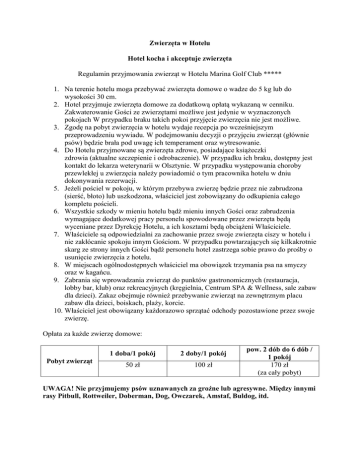 Zwierzęta w Hotelu Hotel kocha i akceptuje zwierzęta Regulamin przyjmowania zwierząt w Hotelu Marina Golf Club ***** 1. Na terenie hotelu moga przebywać zwierzęta domowe o wadze do 5 kg lub do wysokości 30 cm. 2. Hotel przyjmuje zwierzęta domowe za dodatkową opłatą wykazaną w cenniku. Zakwaterowanie Gości ze zwierzętami możliwe jest jedynie w wyznaczonych pokojach W przypadku braku takich pokoi przyjęcie zwierzęcia nie jest możliwe. 3. Zgodę na pobyt zwierzęcia w hotelu wydaje recepcja po wcześniejszym przeprowadzeniu wywiadu. W podejmowaniu decyzji o przyjęciu zwierząt (głównie psów) będzie brała pod uwagę ich temperament oraz wytresowanie. 4. Do Hotelu przyjmowane są zwierzęta zdrowe, posiadające książeczki zdrowia (aktualne szczepienie i odrobaczenie). W przypadku ich braku, dostępny jest kontakt do lekarza weterynarii w Olsztynie. W przypadku występowania choroby przewlekłej u zwierzęcia należy powiadomić o tym pracownika hotelu w dniu dokonywania rezerwacji. 5. Jeżeli pościel w pokoju, w którym przebywa zwierzę będzie przez nie zabrudzona (sierść, błoto) lub uszkodzona, właściciel jest zobowiązany do odkupienia całego kompletu pościeli. 6. Wszystkie szkody w mieniu hotelu bądź mieniu innych Gości oraz zabrudzenia wymagające dodatkowej pracy personelu spowodowane przez zwierzęta będą wyceniane przez Dyrekcję Hotelu, a ich kosztami będą obciążeni Właściciele. 7. Właściciele są odpowiedzialni za zachowanie przez swoje zwierzęta ciszy w hotelu i nie zakłócanie spokoju innym Gościom. W przypadku powtarzających się kilkakrotnie skarg ze strony innych Gości bądź personelu hotel zastrzega sobie prawo do prośby o usunięcie zwierzęcia z hotelu. 8. W miejscach ogólnodostępnych właściciel ma obowiązek trzymania psa na smyczy oraz w kagańcu. 9. Zabrania się wprowadzania zwierząt do punktów gastronomicznych (restauracja, lobby bar, klub) oraz rekreacyjnych (kręgielnia, Centrum SPA & Wellness, sale zabaw dla dzieci). Zakaz obejmuje również przebywanie zwierząt na zewnętrznym placu zabaw dla dzieci, boiskach, plaży, korcie. 10. Właściciel jest obowiązany każdorazowo sprzątać odchody pozostawione przez swoje zwierzę. Opłata za każde zwierzę domowe: Pobyt zwierząt 1 doba/1 pokój 2 doby/1 pokój 50 zł 100 zł pow. 2 dób do 6 dób / 1 pokój 170 zł (za cały pobyt) UWAGA! Nie przyjmujemy psów uznawanych za groźne lub agresywne. Między innymi rasy Pitbull, Rottweiler, Doberman, Dog, Owczarek, Amstaf, Buldog, itd.