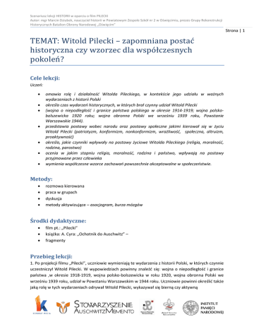 Scenariusz lekcji HISTORII w oparciu o film PILECKI Autor: mgr Marcin Dziubek, nauczyciel historii w Powiatowym Zespole Szkół nr 2 w Oświęcimiu, prezes Grupy Rekonstrukcji Historycznych Batalion Obrony Narodowej „Oświęcim” Strona | 1 TEMAT: Witold Pilecki – zapomniana postac historyczna czy wzorzec dla wspołczesnych pokolen? Cele lekcji: Uczeń: omawia rolę i działalność Witolda Pileckiego, w kontekście jego udziału w ważnych wydarzeniach z historii Polski określa czas wydarzeń historycznych, w których brał czynny udział Witold Pilecki (wojna o niepodległość i granice państwa polskiego w okresie 1914-1919; wojna polskobolszewicka 1920 roku; wojna obronna Polski we wrześniu 1939 roku, Powstanie Warszawskie 1944). przedstawia postawy wobec narodu oraz postawy społeczne jakimi kierował się w życiu Witold Pilecki (patriotyzm, konformizm, nonkonformizm, wrażliwość, społeczna, altruizm, proaktywność) określa, jakie czynniki wpływały na postawy życiowe Witolda Pileckiego (religia, moralność, rodzina, parostwo) ocenia w jakim stopniu religia, moralność, rodzina i państwo, wpływają na postawy przyjmowane przez człowieka wymienia współczesne wzorce zachowań powszechnie akceptowalne w społeczeństwie. Metody: rozmowa kierowana praca w grupach dyskusja metody aktywizujące – asocjogram, burza mózgów Środki dydaktyczne: film pt.: „Pilecki” książka: A. Cyra: „Ochotnik do Auschwitz” – fragmenty Przebieg lekcji: 1. Po projekcji filmu „Pilecki”, uczniowie wymieniają te wydarzenia z historii Polski, w których czynnie uczestniczył Witold Pilecki. W wypowiedziach powinny znaleźć się: wojna o niepodległość i granice państwa ,w okresie 1918-1919, wojna polsko-bolszewicka w roku 1920, wojna obronna Polski we wrześniu 1939 roku, udział w Powstaniu Warszawskim w 1944 roku. Uczniowie powinni określić także jaką rolę w tych wydarzeniach odrywał Witold Pilecki, wykazywał się bierną czy aktywną Scenariusz lekcji HISTORII w oparciu o film PILECKI Autor: mgr Marcin Dziubek, nauczyciel historii w Powiatowym Zespole Szkół nr 2 w Oświęcimiu, prezes Grupy Rekonstrukcji Historycznych Batalion Obrony Narodowej „Oświęcim” Strona | 2 postawą. Powinny pojawić się określenia patriotyzm, konformizm i nonkonformizm z wyjaśnieniem znaczenia tych określeń. 2. Nauczyciel przedstawia uczniom celowość określenia „zapomniany” użytego w temacie lekcji, wracając szczególną uwagę na fakt, że w powojennej historii nie było miejsca zarówno na postać rotmistrza Pileckiego i jemu podobnych jak i wartości którymi kierowali się w życiu. 3. Uczniowie zapoznają się z fragmentem tekstu o ważnej roli domu rodzinnego, w kształtowaniu młodego Witolda Pileckiego (materiał dodatkowy). 4. Przy pomocy asocjogramu (materiał dodatkowe), uczniowie podzieleni na grupy określają postawy, jakie przyjmował Witold Pilecki w stosunku do rodziny, państwa, ludzi i władzy. Wyniki pracy w grupach zapisujemy na tablicy, tworząc asocjogram. 5. Uczniowie w trakcie burzy mózgów, wymieniają czynniki, które miały wpływ na kształtowanie się postaw jakie przyjmował Witold Pilecki. W trakcie tej części powinny paść określenia: rodzina, religia, moralność wrażliwość społeczna, obowiązek wobec państwa. Wyniki burzy mózgów zapisujemy na tablicy. 6. Nauczyciel zwraca się do uczniów z pytaniem o ich ideały i wartości jakimi kierują się w życiu. Uczniowie zapisują swoje pomysły na tablicy obok wcześniejszego zapisu dotyczącego czynników, które wpływały na postawy Witolda Pileckiego. 7. Na zakończenie lekcji, uczniowie określają, czy i na ile mogą utożsamiać się z wartościami jakimi kierował się w swoim życiu Witold Pilecki. Materiał dodatkowy „…Miejsce dalekie od kraju rodzinnego i służba ojca skazywałyby rodzinę Pileckich na zrusyfikowanie, gdyby tak jak w wielu podobnych wypadkach, matka nie odegrała roli budzicielki ducha polskiego. W zapadłym Ołońcu (…) treść patriotyczną tłumaczyła matka dzieciom. Kawaleryjska fantazja, odwaga rycerzy, samozaparcie i poświęcenie porywały i zachęcały małego Witka. Opowiadania matki o Powstaniu Styczniowym, o Murawiewie „Wieszatielu”, o Wilnie, o poniewieraniu i katowaniu przez niego Polaków, o konfiskatach majątków rodziny i zmuszaniu jej do tułaczki, przeorały głęboko duszę małego chłopca, zasiewając w niej ziarna późniejszych czynów” […] Chcąc uchronić dzieci przed rusyfikacją i zapewnić im odpowiednie wykształcenie, rodzice zdecydowali się wychowywać je w Wilnie, które w tym czasie zaczęło przeżywać ponowny rozkwit polskiego życia kulturalnego i naukowego…”. A.Cyra: „Ochotnik do Auschwitz Witold Pilecki 1901-1948”; Oświęcim 2000, s. 23. Materiał dodatkowy Przykładowe socjogramy dotyczące postaw przyjmowanych przez Witolda Pileckiego: Scenariusz lekcji HISTORII w oparciu o film PILECKI Autor: mgr Marcin Dziubek, nauczyciel historii w Powiatowym Zespole Szkół nr 2 w Oświęcimiu, prezes Grupy Rekonstrukcji Historycznych Batalion Obrony Narodowej „Oświęcim” Strona | 3