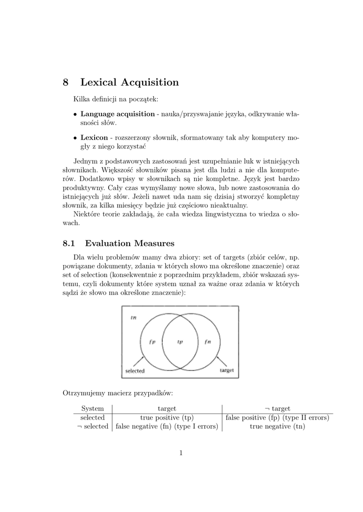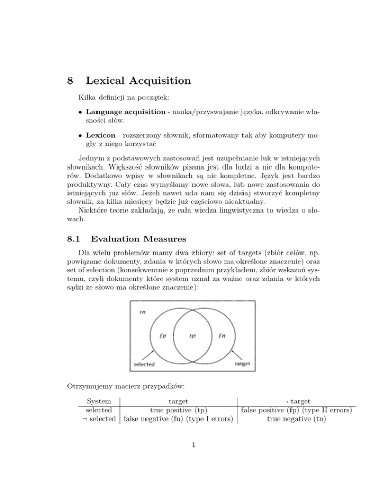 8 Lexical Acquisition Kilka definicji na początek: • Language acquisition - nauka/przyswajanie języka, odkrywanie własności słów. • Lexicon - rozszerzony słownik, sformatowany tak aby komputery mogły z niego korzystać Jednym z podstawowych zastosowań jest uzupełnianie luk w istniejących słownikach. Większość słowników pisana jest dla ludzi a nie dla komputerów. Dodatkowo wpisy w słownikach są nie kompletne. Język jest bardzo produktywny. Cały czas wymyślamy nowe słowa, lub nowe zastosowania do istniejących już słów. Jeżeli nawet uda nam się dzisiaj stworzyć kompletny słownik, za kilka miesięcy będzie już częściowo nieaktualny. Niektóre teorie zakładają, że cała wiedza lingwistyczna to wiedza o słowach. 8.1 Evaluation Measures Dla wielu problemów mamy dwa zbiory: set of targets (zbiór celów, np. powiązane dokumenty, zdania w których słowo ma określone znaczenie) oraz set of selection (konsekwentnie z poprzednim przykładem, zbiór wskazań systemu, czyli dokumenty które system uznał za ważne oraz zdania w których sądzi że słowo ma określone znaczenie): Otrzymujemy macierz przypadków: System target selected true positive (tp) ¬ selected false negative (fn) (type I errors) 1 ¬ target false positive (fp) (type II errors) true negative (tn) Precyzja: P = tp tp + f p Precyzja mierzy proporcję pomiędzy wybranymi a wybranymi poprawnie przypadkami. Recall: R= tp tp + f n Recall mierzy proporcję pomiędzy celem a wybranymi przypadkami Fallout: φ= fp f p + tn Fallout mierzy proporcję pomiędzy przypadkami poza celem, a błędnie wskazanymi Dla łatwiejszej oceny, można połączyć precyzję i recall w jedną miarę: F = α P1 1 + (1 − α) R1 gdzie: • P - precyzja • R - recall • α - pozwala określić co jest ważniejsze, P czy R, dla α = 0.5 traktujemy je jak tak samo istotne wówczas wzór się upraszcza: F = 8.2 2P R R+P Verb Subcategorization Subcategorization frame - zbiór syntaktycznych kategorii w których czasownik może wystąpić. Używamy nazwy ”subcategorization” ponieważ możemy myśleć o czasownikach z określonym zbiorem semantycznych argumentów jako o jednej kategorii. Każda taka kategoria może mieć kilka podkategorii zbudowanych przy użyciu innych składniowych znaczeń. Przykład: 2 Frame Functions NP subject NP NP S subject, object, clause NP NP subject, object Verb walk tell find Example She walked. She told [the man] [where Peter grew up.] She found [the place [where Peter grew up.]] Znając odpowiednie ramki możemy w 2 zdaniu wyrażenie ”where Peter grew up” połączyć z told, a w 3 przykładzie z ”the place”. Niestety mało słowników podaje tego typu informacje. W 1993 Brent zaproponował prosty algorytm na pod-kategoryzacje (zaimplementowany w systemie ”Lerner”). Przypuśćmy, że chcemy zdecydować (bazując na korpusie) czy czasownik v ma ramkę f . Decyzja odbywa się w dwóch krokach: • Wskazówki: Definiujemy wzór słowa i syntaktycznej kategorii, który wskazuje wystąpienie ramki z wysokim prawdopodobieństwem. Dla wskazówki cj określamy prawdopodobieństwo błędu ξj , czyli jak prawdopodobna jest pomyłka, jeżeli przypiszemy ramkę f czasownikowi v bazując na wskazówce cj Wzór którego użył Brent dla ramki NP NP: (OBJ|SU BJ OBJ|CAP )(P U N C|CC) gdzie: – OBJ - zaimki osobowe, np: me, him – SUBJ OBJ - może być zarówno podmiot jak i dopełnienie np: you, it – CAP - słowo pisane dużymi literami – PUNC - znak interpunkcyjny – CC - łącznik np: if, as, before Jest małe prawdopodobieństwo błędnego dopasowania. Przykład: zdanie pasujące do ramki: ... greet Peter, ... (V CAP PUNC) zdanie błędnie pasujące do ramki: I came Thursday, before the storm started. (V CAP PUNC) (Thusday nie jest dopełnienie, to okolicznik) • Testowanie hipotez. Zakładamy że ramka jest niepoprawna dla czasownika (hipoteza H0 ). Mając zdefiniowane wskazówki możemy analizować korpus. Dla każdej kombinacji czasownik-ramka zliczmy ile razy 3 wzór się dopasował do czasownika. Przypuśćmy, że czasownik v i wystąpił n razy w korpusie. Zaobserwowaliśmy m ¬ n wystąpień wskazówki dla ramki f j . Możemy odrzucić H0 , z następującym prawdopodobieństwem błędu: pE = P (v i (f j ) = 0|C(v i , cj ) m) = n X r=m ! n r ξ (1 − ξj )n−r r j gdzie – v i (f j ) = 0 - czasownik v i nie występuje z ramką f j – C(v i , cj ) - liczba wystąpień v i ze wskazówką cj – ξj - błąd wskazówki Wyniki (zwłaszcza precyzja) są wysokie, około 100%, mniejszy jest recall. Wysoka precyzja i niski recall są konsekwencją wykorzystania testowania hipotez. Znajdujemy tylko podkategorię które są dobrze przetestowane. To znaczy, że znajdujemy mało przypadków, które są rzadkie. Manning (1993) zaproponował aby najpierw uruchomić na danych tagger, co zwiększy ilość wskazówek. Przykładowe błędy pojawiają się np. z wyrażeniami przyimkowymi: • bridge between • retire in Książka tłumaczy to tym, że ciężko jest rozróżnić czy są okolicznikami, czy należą do jakiejś kategorii. 8.3 Attachment Ambiguity Jeżeli chcemy określić składniową strukturę zdania (rozkład logiczny?) częstym problemem są niejednoznaczności. Problem będzie bliżej opisany w rozdziale 12. Ogólnie podczas analizy tworzone jest drzewo i są wyrażenia, które mogą być podłączone do więcej niż jednego węzła. Przykład: The children ate the cake with a spoon. Zdanie może oznaczać, że dzieci jadły ciasto łyżką, lub że zjadły ciasto z dołączoną łyżką. Jak rozwiązywać takie niejednoznaczności? W przykładzie z łyżką, wiedząc, że jest to narzędzie służące do jedzenia ciasta możemy wybrać 4 bardziej prawdopodobną wersję. Okazuje się, że polegając na prostej analizie statystycznej można rozwiązać większość tego typu problemów. Przykład: Moscow sent more than 100,000 soldiers into Afghanistan W korpusie z