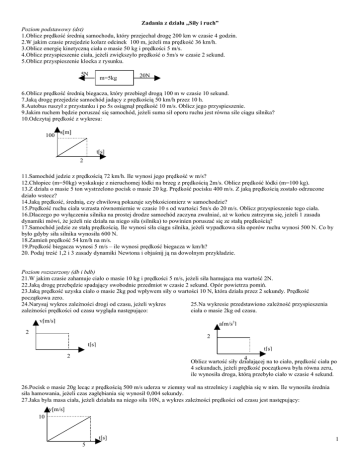 Zadania z działu „Siły i ruch” Poziom podstawowy (dst) 1.Oblicz prędkość średnią samochodu, który przejechał drogę 200 km w czasie 4 godzin. 2.W jakim czasie przejedzie kolarz odcinek 100 m, jeżeli ma prędkość 36 km/h. 3.Oblicz energię kinetyczną ciała o masie 50 kg i prędkości 5 m/s. 4.Oblicz przyspieszenie ciała, jeżeli zwiększyło prędkość o 5m/s w czasie 2 sekund. 5.Oblicz przyspieszenie klocka z rysunku. 5N m=5kg 20N 6.Oblicz prędkość średnią biegacza, który przebiegł drogą 100 m w czasie 10 sekund. 7.Jaką drogę przejedzie samochód jadący z prędkością 50 km/h przez 10 h. 8.Autobus ruszył z przystanku i po 5s osiągnął prędkość 10 m/s. Oblicz jego przyspieszenie. 9.Jakim ruchem będzie poruszać się samochód, jeżeli suma sił oporu ruchu jest równa sile ciągu silnika? 10.Odczytaj prędkość z wykresu: 100 s[m] t[s] 2 11.Samochód jedzie z prędkością 72 km/h. Ile wynosi jego prędkość w m/s? 12.Chłopiec (m=50kg) wyskakuje z nieruchomej łódki na brzeg z prędkością 2m/s. Oblicz prędkość łódki (m=100 kg). 13.Z działa o masie 5 ton wystrzelono pocisk o masie 20 kg. Prędkość pocisku 400 m/s. Z jaką prędkością zostało odrzucone działo wstecz? 14.Jaką prędkość, średnią, czy chwilową pokazuje szybkościomierz w samochodzie? 15.Prędkość ruchu ciała wzrasta równomiernie w czasie 10 s od wartości 5m/s do 20 m/s. Oblicz przyspieszenie tego ciała. 16.Dlaczego po wyłączeniu silnika na prostej drodze samochód zaczyna zwalniać, aż w końcu zatrzyma się, jeżeli 1 zasada dynamiki mówi, że jeżeli nie działa na niego siła (silnika) to powinien poruszać się ze stałą prędkością? 17.Samochód jedzie ze stałą prędkością. Ile wynosi siła ciągu silnika, jeżeli wypadkowa siła oporów ruchu wynosi 500 N. Co by było gdyby siła silnika wynosiła 600 N. 18.Zamień prędkość 54 km/h na m/s. 19.Prędkość biegacza wynosi 5 m/s – ile wynosi prędkość biegacza w km/h? 20. Podaj treść 1,2 i 3 zasady dynamiki Newtona i objaśnij ją na dowolnym przykładzie. Poziom rozszerzony (db i bdb) 21.W jakim czasie zahamuje ciało o masie 10 kg i prędkości 5 m/s, jeżeli siła hamująca ma wartość 2N. 22.Jaką drogę przebędzie spadający swobodnie przedmiot w czasie 2 sekund. Opór powietrza pomiń. 23.Jaką prędkość uzyska ciało o masie 2kg pod wpływem siły o wartości 10 N, która działa przez 2 sekundy. Prędkość początkowa zero. 24.Narysuj wykres zależności drogi od czasu, jeżeli wykres 25.Na wykresie przedstawiono zależność przyspieszenia zależności prędkości od czasu wygląda następująco: ciała o masie 2kg od czasu. v[m/s] a[m/s2] 2 2 t[s] t[s] 2 4 Oblicz wartość siły działającej na to ciało, prędkość ciała po 4 sekundach, jeżeli prędkość początkowa była równa zeru, ile wynosiła droga, którą przebyło ciało w czasie 4 sekund. 26.Pocisk o masie 20g lecąc z prędkością 500 m/s uderza w ziemny wał na strzelnicy i zagłębia się w nim. Ile wynosiła średnia siła hamowania, jeżeli czas zagłębiania się wynosił 0,004 sekundy. 27.Jaka była masa ciała, jeżeli działała na niego siła 10N, a wykres zależności prędkości od czasu jest następujący: v[m/s] 10 t[s] 5 1 28.Oblicz jaką siłą działa pas bezpieczeństwa na człowieka o masie 80 kg, jeżeli samochód mający prędkość 10 m/s uderzył w przeszkodę i zatrzymał się w czasie 0,1 sekundy. 29.Na podstawie wykresu zależności drogi od czasu wyznacz prędkości na kolejnych odcinkach czasu. s[m] 15 32.Na podstawie wykresu zależności prędkości od czasu przedstaw wykres przyspieszenia od czasu. 10 v[m/s] t[s] 5 10 7,5 20 30.Na podstawie wykresu zależności przyspieszenia ciała do czasu przedstaw wykres zal. prędkości od czasu. 5 t[s] 5 10 20 a[m/s2] 33.Który odcinek wykresu zależności drogi od czasu odpowiada ruchowi przyspieszonemu, opóźnionemu, a który jednostajnemu, oblicz przyspieszenie na poszczególnych odcinkach czasu? 2 t[s] 2 v[m/s] 4 31.Na podstawie wykresu zależności prędkości od czasu przedstaw wykres drogi od czasu. 5 v[m/s] t[s] 5 4 10 20 34.Pociąg ruszył z przyspieszeniem 0,5 m/s2. Jaką prędkość będzie miał on po upływie czasu 0,5 minuty? 2 t[s] 2 4 35.Uczeń przeszedł drogę 20 km w czasie 4h. Potem odpoczywał przez 30 minut. Potem jechał rowerem z prędkością 20 km/h trasę 40 km. Zrób wykres zależności drogi i prędkości od czasu. 36*..Piłka wyrzucona pionowo do góry spadła na ziemię po 4s. Na jaką wysokość wzniosła się i z jaką prędkością została wyrzucona? 37.Człowiek o masie 70 kg wskakuje z brzegu z prędkością 10 m/s do nieruchomej łódki o masie 200kg. Z jaką prędkością łódka zacznie się oddalać od brzegu? 38.Na rysunku przedstawiono wykres zależności prędkości od czasu ciała rzuconego pionowo w górę. Na jaką wysokość wzniosło się ciało? Ile wynosi czas t1 i t2? v[m/s] 20 t[s] t1 t2 39*.Na stacji rozrządowej wagon o masie 20 ton, po popchnięciu przez lokomotywę przejechał drogę 180m w czasie 1 min i zatrzymał się. Wyznacz średnią wartość wypadkowej siły oporów hamujących wagon. 2 40*.Samochód o masie 2 ton porusza się z prędkością 54 km/h. Kierowca wyłączył silnik i nacisnął hamulec, wskutek czego samochód zaczął poruszać się ruchem jednostajnie opóźnionym. Po jakim czasie się zatrzyma i jaka będzie droga hamowania, jeżeli siła hamowania wynosi 1,5 kN? 41*.Kula lecąca z prędkością 400 m/s uderza w ziemny nasyp i zagłębia się w nim na głębokość 40 cm. Oblicz czas zagłębiania się kuli. 42*.Gdy klocek jest ciągnięty ruchem jednostajnym za pomocą siłomierza, wtedy siłomierz wskazuje siłę 2,5 N. Oblicz przyspieszenie klocka jeżeli jest ciągnięty po tym samym podłożu siłą 3,5 N. Masa klocka 500g. 43*.Po równi pochyłej AB toczy się kulka ruchem jednostajnie przyspieszonym w czasie 3 s z przyspieszeniem o wartości 4m/s2 