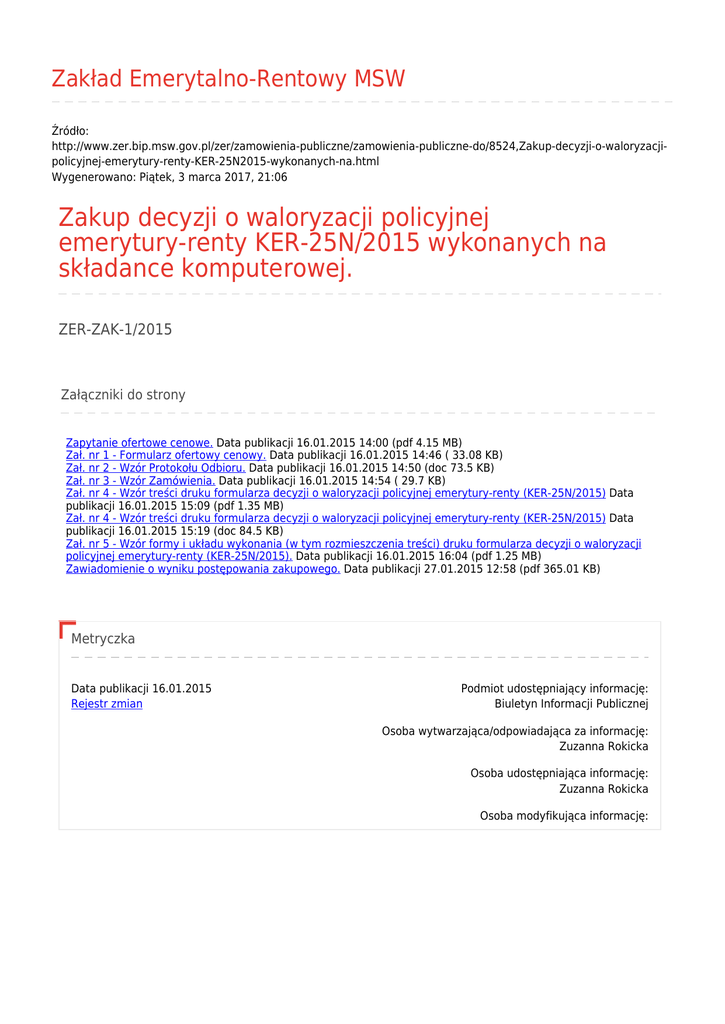 Zakład Emerytalno-Rentowy MSW Źródło: http://www.zer.bip.msw.gov.pl/zer/zamowienia-publiczne/zamowienia-publiczne-do/8524,Zakup-decyzji-o-waloryzacjipolicyjnej-emerytury-renty-KER-25N2015-wykonanych-na.html Wygenerowano: Piątek, 3 marca 2017, 21:06 Zakup decyzji o waloryzacji policyjnej emerytury-renty KER-25N/2015 wykonanych na składance komputerowej. ZER-ZAK-1/2015 Załączniki do strony Zapytanie ofertowe cenowe. Data publikacji 16.01.2015 14:00 (pdf 4.15 MB) Zał. nr 1 - Formularz ofertowy cenowy. Data publikacji 16.01.2015 14:46 ( 33.08 KB) Zał. nr 2 - Wzór Protokołu Odbioru. Data publikacji 16.01.2015 14:50 (doc 73.5 KB) Zał. nr 3 - Wzór Zamówienia. Data publikacji 16.01.2015 14:54 ( 29.7 KB) Zał. nr 4 - Wzór treści druku formularza decyzji o waloryzacji policyjnej emerytury-renty (KER-25N/2015) Data publikacji 16.01.2015 15:09 (pdf 1.35 MB) Zał. nr 4 - Wzór treści druku formularza decyzji o waloryzacji policyjnej emerytury-renty (KER-25N/2015) Data publikacji 16.01.2015 15:19 (doc 84.5 KB) Zał. nr 5 - Wzór formy i układu wykonania (w tym rozmieszczenia treści) druku formularza decyzji o waloryzacji policyjnej emerytury-renty (KER-25N/2015). Data publikacji 16.01.2015 16:04 (pdf 1.25 MB) Zawiadomienie o wyniku postępowania zakupowego. Data publikacji 27.01.2015 12:58 (pdf 365.01 KB) Metryczka Data publikacji 16.01.2015 Rejestr zmian Podmiot udostępniający informację: Biuletyn Informacji Publicznej Osoba wytwarzająca/odpowiadająca za informację: Zuzanna Rokicka Osoba udostępniająca informację: Zuzanna Rokicka Osoba modyfikująca informację: