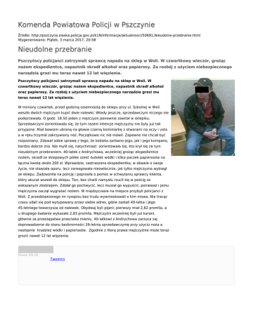Komenda Powiatowa Policji w Pszczynie Źródło: http://pszczyna.slaska.policja.gov.pl/k19/informacje/aktualnosci/50691,Nieudolne-przebranie.html Wygenerowano: Piątek, 3 marca 2017, 20:58 Nieudolne przebranie Pszczyńscy policjanci zatrzymali sprawcę napadu na sklep w Woli. W czwartkowy wieczór, grożąc nożem ekspedientce, napastnik skradł alkohol oraz papierosy. Za rozbój z użyciem niebezpiecznego narzędzia grozi mu teraz nawet 12 lat więzienia. Pszczyńscy policjanci zatrzymali sprawcę napadu na sklep w Woli. W czwartkowy wieczór, grożąc nożem ekspedientce, napastnik skradł alkohol oraz papierosy. Za rozbój z użyciem niebezpiecznego narzędzia grozi mu teraz nawet 12 lat więzienia. W miniony czwartek, przed godziną osiemnastą do sklepu przy ul. Szkolnej w Woli weszło dwóch mężczyzn kupić dwie nalewki. Wtedy jeszcze, sprzedawczyni niczego nie podejrzewała. O godz. 18.50 jeden z mężczyzn ponownie zawitał w sklepiku. Sprzedawczyni zorientowala się, że tym razem intencje mężczyzny nie były już tak przyjazne. Miał bowiem ubraną na głowie czarną kominiarkę z otworami na oczy i usta a w ręku trzymał zakrzywiony nóż. Początkowo nic nie mówił. Zapewne nie chciał być rozpoznany. Zdawał sobie sprawę z tego, że kobieta zarówno jego, jak i jego kompana, bardzo dobrze zna. Nie mylił się, natychmiast zorientowała się, kto krył się za tym nieudolnym przebraniem. 40-latek z Andrychowa, wcześniej grożąc ekspedientce nożem, skradł ze sklepowych półek sześć butelek wódki i kilka paczek papierosów na łączna kwotę około 200 zł. Wprawdzie, zastraszona ekspedientka, w obawie o swoje życie, nie stawiała oporu, lecz zareagowała niezwłocznie, jak tylko mężczyzna wybiegł ze sklepu. Zadzwoniła na policję i poprosiła o pomoc w schwytaniu sprawcy klienta, który akurat wszedł do sklepu. Ten, bez chwili namysłu rzucił się w pościg za wskazanym złodziejem. Zdołał go pochwycić, lecz musiał go wypuścić, ponieważ i jemu mężczyzna zaczął wygrażać nożem. W międzyczasie na miejsce przybyli policjanci z Woli. Z przedstawionego im rysopisu bez trudu wywnioskowali o kim mowa. Nie tracąc czasu udali się pod wytypowany przez siebie adres, gdzie zastali 40-latka i jego 45-letniego towarzysza od nalewek. Obydwaj byli pijani; pierwszy miał 2,62 promila, a u drugiego badanie wykazało 2,83 promila. Mężczyźni wcześniej byli już karani, głównie za przestępstwa przeciwko mieniu. 40-latkowi z Andrychowa zarzuca się doprowadzenie do stanu bezbronności 26-letnią sprzedawczynię przy użyciu noża a nastepnie kradzież wódki i papierosów. Zgodnie z literą prawa mężczyźnie może teraz grozić nawet 12 lat więzienia. Ocena: 0/5 (0) Tweetnij