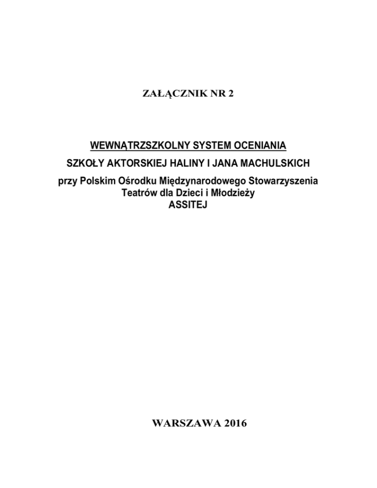 ZAŁĄCZNIK NR 2 WEWNĄTRZSZKOLNY SYSTEM OCENIANIA SZKOŁY AKTORSKIEJ HALINY I JANA MACHULSKICH przy Polskim Ośrodku Międzynarodowego Stowarzyszenia Teatrów dla Dzieci i Młodzieży ASSITEJ WARSZAWA 2016 Dokument sporządzono na podstawie ustawy z dnia 7 września 1991 r. o systemie oświaty (tekst jednolity Dz. U. z 2015 r., poz. 2156) i rozporządzenia Ministra Kultury i Dziedzictwa Narodowego z dnia 24 sierpnia 2015 r. w sprawie szczegółowych warunków i sposobu oceniania, klasyfikowania i promowania słuchaczy w publicznych szkołach artystycznych (Dz. U. 2015.1258), zwanego dalej rozporządzeniem. § 1. 1. Ocenianiu podlegają osiągnięcia edukacyjne słuchacza w zakresie zajęć artystycznych; 2. Ocenianie osiągnięć edukacyjnych słuchacza polega na rozpoznawaniu przez nauczycieli poziomu i postępów w opanowaniu przez słuchacza wiadomości i umiejętności w stosunku do efektów kształcenia, określonych w podstawie programowej kształcenia w zawodzie aktor oraz wymagań wynikających z realizowanych w Szkole programów nauczania; 3. Ocenianie wewnątrzszkolne ma na celu: 1) informowanie słuchacza o poziomie jego osiągnięć edukacyjnych, 2) udzielanie słuchaczowi pomocy w nauce poprzez przekazanie mu informacji o tym, co zrobił dobrze i jak powinien się dalej uczyć, 3) udzielanie wskazówek do samodzielnego planowania własnego rozwoju, 4) motywowanie słuchacza do dalszych postępów w nauce, 5) umożliwianie nauczycielom doskonalenia organizacji i metod pracy dydaktycznej. 4. Ocenianie wewnątrzszkolne obejmuje: 1) formułowanie przez nauczycieli wymagań edukacyjnych, niezbędnych do otrzymania przez słuchacza semestralnych ocen klasyfikacyjnych z obowiązkowych i dodatkowych zajęć edukacyjnych, 2) ustalanie ocen bieżących z obowiązkowych i dodatkowych zajęć edukacyjnych, 3) przeprowadzanie egzaminów klasyfikacyjnych i poprawkowych, 4) ustalanie rocznych ocen klasyfikacyjnych z obowiązkowych i dodatkowych zajęć edukacyjnych. §2. 1. Do zadań i obowiązków nauczycieli w zakresie oceniania należy w szczególności: 1) na początku roku szkolnego informowanie słuchaczy o: a) wymaganiach edukacyjnych niezbędnych do uzyskania semestralnych ocen klasyfikacyjnych z zajęć edukacyjnych, wynikających z realizowanego przez siebie programu nauczania, 2 b) sposobach sprawdzania osiągnięć edukacyjnych słuchaczy, c) warunkach i trybie otrzymania wyższej niż przewidywana rocznej oceny klasyfikacyjnej z zajęć edukacyjnych; 2) dostosowanie wymagań edukacyjnych do indywidualnych potrzeb rozwojowych i edukacyjnych oraz możliwości psychofizycznych słuchacza, posiadającego opinię lekarza o ograniczonych możliwościach wykonywania przez słuchacza określonych ćwiczeń fizycznych; 3) systematyczne i rytmiczne ocenianie słuchaczy; 4) stwarzanie słuchaczowi możliwości uzupełnienia braków; 5) na wniosek słuchaczy uzasadnianie ustalonych ocen oraz udostępnianie do wglądu sprawdzonych i ocenionych prac kontrolnych; 6) informowanie słuchaczy o postępach, trudnościach w nauce oraz szczególnych uzdolnieniach słuchacza; 7) informowanie słuchaczy o przewidywanych ocenach semestralnych na dwa tygodnie przed posiedzeniem klasyfikacyjnym rady pedagogicznej; 8) na dwa tygodnie przed posiedzeniem końcoworocznej Rady Klasyfikacyjnej nauczyciel pisemnie informuje słuchacza o grożących mu ocenach niedostatecznych z zajęć edukacyjnych; § 3. Do zadań i obowiązków słuchacza w zakresie oceniania należy w szczególności: 1) systematyczne przygotowywanie się do zajęć edukacyjnych, 2) systematyczne i aktywne uczestniczenie w zajęciach edukacyjnych, 3) pisanie każdej pracy kontrolnej. § 4. 1. Dyrektor Szkoły zwalnia słuchacza z zajęć edukacyjnych ruchowych, na podstawie opinii o ograniczonych możliwościach wykonywania przez słuchacza tych ćwiczeń, wydanej przez lekarza, na czas określony w tej opinii. 2. Jeżeli okres zwolnienia słuchacza z realizacji obowiązkowych zajęć edukacyjnych uniemożliwia ustalenie semestralnej oceny klasyfikacyjnej, w dokumentacji przebiegu nauczania wpisuje się "zwolniony" albo "zwolniona". 3. Dyrektor Szkoły, na wniosek słuchacza, może zwolnić słuchacza z realizacji obowiązkowych zajęć edukacyjnych, jeżeli słuchacz zrealizował te zajęcia w innej szkole artystycznej w 3 zakresie zgodnym z podstawą programową kształcenia w Szkole. W dokumentacji przebiegu nauczania wpisuje się ocenę klasyfikacyjną uzyskaną przez słuchacza w szkole, w której zakończyła się realizacja danych zajęć edukacyjnych. 4. Zwolnienie słuchacza z realizacji obowiązkowych zajęć edukacyjnych następuje odpowiednio na podstawie świadectwa szkolnego promocyjnego lub innego dokumentu potwierdzającego odpowiednio zrealizowanie danych zajęć edukacyjnych lub treści kształcenia. § 5. 1. Słuchacz w trakcie nauki w Szkole otrzymuje oceny: 1) bieżące; 2) klasyfikacyjne: a) semestralne, b) końcowe. 2. Sprawdzone i ocenione pisemne prace słuchacza są udostępniane słuchaczowi. 3. Oceny są jawne dla słuchacza. 4. Nauczyciel uzasadnia ustaloną ocenę. Procedura uzasadniania ocen wygląda następująco: 1) nauczyciel uzasadnia każdą ocenę wskazując słuchaczowi jego mocne i słabe strony, uzasadnienie jest jawne (podczas zajęć edukacyjnych), 2) jeśli słuchacz złoży pisemny wniosek o uzasadnienie oceny, nauczyciel ma obowiązek ją uzasadnić pisemnie w terminie 7 dni. Słuchacz składa wniosek o uzasadnienie oceny do nauczyciela. Wniosek słuchacza i kopię uzasadnienia nauczyciel przechowuje w swojej dokumentacji przez okres 1 roku. 5. Na wniosek słuchacza dokumentacja dotycząca egzaminu klasyfikacyjnego, egzaminu poprawkowego, zastrzeżeń, oraz inna dokumentacja dotycząca oceniania słuchacza jest udostępniana do wglądu słuchaczowi na jego wniosek. 6. Dokumentację udostępnia się w ten sposób, że umożliwia się wykonanie fotokopii lub wydania kserokopii. § 6. Ocenianie bi