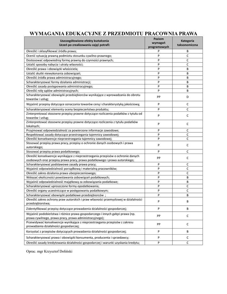 WYMAGANIA EDUKACYJNE Z PRZEDMIOTU PRACOWNIA PRAWA Uszczegółowione efekty kształcenia Uczeń po zrealizowaniu zajęć potrafi: Określić i sklasyfikować źródła prawa; Ocenić sytuację prawną podmiotu stosunku cywilno-prawnego; Dostosować odpowiednią formę prawną do czynności prawnych; Ustalić sposoby nabycia i utraty własności; Określić prawa i obowiązki właściciela; Ustalić skutki niewykonania zobowiązań; Określić źródła prawa administracyjnego; Scharakteryzować formy działania administracji; Określić zasady postępowania administracyjnego; Określić rolę sądów administracyjnych; Scharakteryzować obowiązki przedsiębiorców wynikające z wprowadzania do obrotu towarów i usług; Poziom wymagań programowych P P P P P P P P P P Kategoria taksonomiczna B C C C B B B B B B PP D Wyjaśnić przepisy dotyczące oznaczania towarów ceną i charakterystyką jakościową; P C Scharakteryzować elementy oceny bezpieczeństwa produktu; Zinterpretować stosowne przepisy prawne dotyczące rozliczenia podatków z tytułu od towarów i usług; Zinterpretować stosowne przepisy prawne dotyczące rozliczenia z tytułu podatków lokalnych; Przyjmować odpowiedzialność za powierzone informacje zawodowe; Respektować zasady dotyczące przestrzegania tajemnicy zawodowej; Określić konsekwencje nieprzestrzegania tajemnicy zawodowej; Stosować przepisy prawa pracy, przepisy o ochronie danych osobowych i prawa autorskiego; Stosować przepisy prawa podatkowego; Określić konsekwencje wynikające z nieprzestrzegania przepisów o ochronie danych osobowych oraz przepisy prawa pracy, prawa podatkowego i prawa autorskiego; Scharakteryzować podstawowe zasady prawa pracy; Wyjaśnić odpowiedzialność porządkową i materialną pracowników; Określić zakres działania prawa ubezpieczeniowego; Wskazać okoliczności powstawania zobowiązań podatkowych; Wyjaśnić odpowiedzialność majątkową za zobowiązania podatkowe; Scharakteryzować uproszczone formy opodatkowania; Określić organy uczestniczące w postępowaniu podatkowym; Scharakteryzować obowiązki podatkowe przedsiębiorców ; Określić zakres ochrony praw autorskich i praw własności przemysłowej w działalności przedsiębiorstwa; P C P C P C P P P C C C P C P C PP C P P P P P P P P C C C B B C C B P B Zidentyfikować przepisy dotyczące prowadzenia działalności gospodarczej; P B PP C PP C Korzystać z przepisów dotyczących prowadzenia działalności gospodarczej; P B Scharakteryzować prawa i obowiązki konsumenta, producenta i sprzedawcy; P C Określić zasady kredytowania działalności gospodarczej i warunki uzyskania kredytu; P C Wyjaśnić podobieństwa i różnice prawa gospodarczego i innych gałęzi prawa (np. prawa cywilnego, prawa pracy, prawa administracyjnego); Przewidywać konsekwencje wynikające z nieprzestrzegania przepisów z zakresu prowadzenia działalności gospodarczej; Oprac. mgr Krzysztof Doliński
