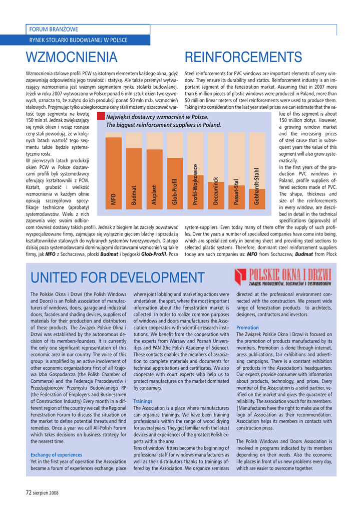 FORUM BRANŻOWE RYNEK STOLARKI BUDOWLANEJ W POLSCE WZMOCNIENIA REINFORCEMENTS Gebhardt-Stahl Passat-Stal Deceuninck Profil-Wojkowice Glob-Profil Aluplast Budmat MFO Wzmocnienia stalowe profili PCW są istotnym elementem każdego okna, gdyż Steel reinforcements for PVC windows are important elements of every winzapewniają odpowiednią jego trwałość i statykę. Ale także przemysł wytwa- dow. They ensure its durability and statics. Reinforcement industry is an imrzający wzmocnienia jest ważnym segmentem rynku stolarki budowlanej. portant segment of the fenestration market. Assuming that in 2007 more Jeżeli w roku 2007 wytworzono w Polsce ponad 6 mln sztuk okien tworzywo- than 6 million pieces of plastic windows were produced in Poland, more than wych, oznacza to, że zużyto do ich produkcji ponad 50 mln m.b. wzmocnień 50 million linear meters of steel reinforcements were used to produce them. stalowych. Przyjmując tylko ubiegłoroczne ceny stali możemy oszacować war- Taking into consideration the last year steel prices we can estimate that the vatość tego segmentu na kwotę lue of this segment is about Najwięksi dostawcy wzmocnień w Polsce. 150 mln zł. Jednak zwiększający 150 million zlotys. However, The biggest reinforcement suppliers in Poland. się rynek okien i wciąż rosnące a growing window market ceny stali powodują, że w kolejand the increasing prices nych latach wartość tego segof steel cause that in subsementu także będzie systemaquent years the value of this tycznie rosła. segment will also grow systeW pierwszych latach produkcji matically. okien PCW w Polsce dostawIn the first years of the procami profili byli systemodawcy duction PVC windows in oferujący kształtowniki z PCW. Poland, profile suppliers ofKształt, grubość i wielkość fered sections made of PVC. wzmocnienia w każdym oknie The shape, thickness and opisują szczegółowo specysize of the reinforcements fikacje techniczne (aprobaty) in every window, are descrisystemodawców. Wielu z nich bed in detail in the technical zapewnia więc swoim odbiorspecifications (approvals) of com również dostawy takich profili. Jednak z biegiem lat zaczęły powstawać system-suppliers. Even today many of them offer the supply of such profiwyspecjalizowane firmy, zajmujące się wyłącznie gięciem blachy i sprzedażą les. Over the years a number of specialized companies have come into being, kształtowników stalowych do wybranych systemów tworzywowych. Dlatego which are specialized only in bending sheet and providing steel sections to dzisiaj poza systemodawcami dominującymi dostawcami wzmocnień są takie selected plastic systems. Therefore, dominant steel reinforcement suppliers firmy, jak MFO z Sochaczewa, płocki Budmat i bydgoski Glob-Profil. Poza today are such companies as: MFO from Sochaczew, Budmat from Płock UNITED FOR DEVELOPMENT The Polskie Okna i Drzwi (the Polish Windows and Doors) is an Polish association of manufacturers of windows, doors, garage and industrial doors, facades and shading devices, suppliers of materials for their production and distributors of these products. The Związek Polskie Okna i Drzwi was established by the autonomous decision of its members-founders. It is currently the only one significant representation of this economic area in our country. The voice of this group is amplified by an active involvement of other economic organizations first of all Krajowa Izba Gospodarcza (the Polish Chamber of Commerce) and the Federacja Pracodawców i Przedsiębiorców Przemysłu Budowlanego RP (the Federation of Employers and Businessmen of Construction Industry) Every month in a different region of the country we call the Regional Fenestration Forum to discuss the situation on the market to define potential threats and find remedies. Once a year we call All-Polish Forum which takes decisions on business strategy for the nearest time. Exchange of experiences Yet in the first year of operation the Association became a forum of experiences exchange, place 72 sierpień 2008 where joint lobbing and marketing actions were undertaken, the spot, where the most important information about the fenestration market is collected. In order to realize common purposes of windows and doors manufacturers the Association cooperates with scientific-research institutions. We benefit from the cooperation with the experts from Warsaw and Poznań Universities and PAN (the Polish Academy of Science). These contacts enables the members of association to complete materials and documents for technical approbations and certificates. We also cooperate with court experts who help us to protect manufactures on the market dominated by consumers. Trainings The Association is a place where manufacturers can organize trainings. We have been training professionals within the range of wood drying for several years. They get familiar with the latest devices and experiences of the greatest Polish experts within the area. Tens of window fitters become the beginning of professional staff for windows manufacturers as well as their distributors thanks to trainings offered by the Association. We organize seminars directed at the professional environment connected with the construction. We present wide range of fenestration products to architects, designers, contractors and investors. Promotion The Związek Polskie Okna i Drzwi is focused on the promotion of products manufactured by its members. Promotion is done through internet, press publications, fair exhibitions and advertising campaigns. There is a constant exhibition of products in the Association’s headquarters. Our experts provide consumer with information about products, technology, and prices. Every member of the Association is a solid partner, verified on the market and gives the guarantee of reliability. The association vouch for its members. |Manufactures have the right to make use of the logo of Association as their recommendation. Associati