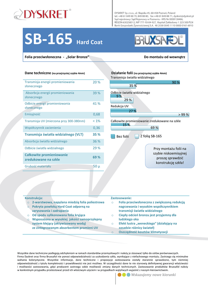 SB-165 Hard Coat Folia przeciwsłoneczna - „Solar Bronze” Do montażu od wewnątrz Dane techniczne (na przejrzystej szybie 4mm) Działanie folii (na przejrzystej szybie 4mm) Transmisja światła widzialnego Transmisja energii promieniowania słonecznego 20 % Absorbcja energii promieniowania słonecznego 39 % Odbicie energii promieniowania słonecznego 41 % Emisyjność 0,68 Transmisja UV (mierzona przy 300-380nm) < 1% Współczynnik zacienienia 0,36 Transmisja światła widzialnego (VLT) 35 % Absorbcja światła widzialnego 36 % Odbicie światła widzialnego 29 % Całkowite promieniowanie zredukowane na szkle 69 % Grubość materiału 50 µ Konstrukcja: o 2-warstwowa, napylana miedzią folia poliestrowa o Pokryta powłoką Hard Coat odporną na zarysowania i zadrapania o Od spodu sylikonowana folia kryjąca o Wyposażona w wysokiej jakości samoprzylepny system klejący (aktywizowany wodą) ze zintegrowanym absorbentem promieni UV 90 % 35 % Odbicie światła widzialnego 9% 29 % Redukcja UV 27 % > 99 % Całkowite promieniowanie zredukowane na szkle 15 % Bez folii 69 % Z folią SB-165 Przy montażu folii na szybie niskoemisyjnej proszę sprawdzić konstrukcję szkła! Zastosowanie: o Folia przeciwsłoneczna z zwiększoną redukcją nagrzewania i wysokim współczynnikiem transmisji światła widzialnego o Ciepły odcień bronzu jest przyjemny dla ludzkiego oka o Efekt lustra „weneckiego” (działający na zasadzie różnicy świateł) o Oszczędność kosztów klimatyzacji Wszystkie dane techniczne podlegają odchyleniom w ramach standardów przemysłowych i należy je stosować tylko do celów porównawczych. Firma Dyskret oraz firma Bruxsafol nie ponosi odpowiedzialności za uszkodzenia szkła, wynikające z niefachowego montażu. Zastrzega się minimalne wahania kolorystyczne. Wszystkie informacje, dane techniczne i propozycje zastosowania zostały starannie sprawdzone, tym niemniej odpowiedzialność z tytułu kompletności i prawidłowości nie jest możliwa. W szczególności dane te nie stanowią definitywnej gwarancji właściwości i możliwości zastosowania, gdyż producent zastrzega sobie możliwość zmiany danych technicznych. Zastosowanie produktów Bruxsafol należy w konkretnym przypadku przetestować przed ich właściwym użyciem i w przypadkach wątpliwych wyjaśnić z naszym kierownictwem.