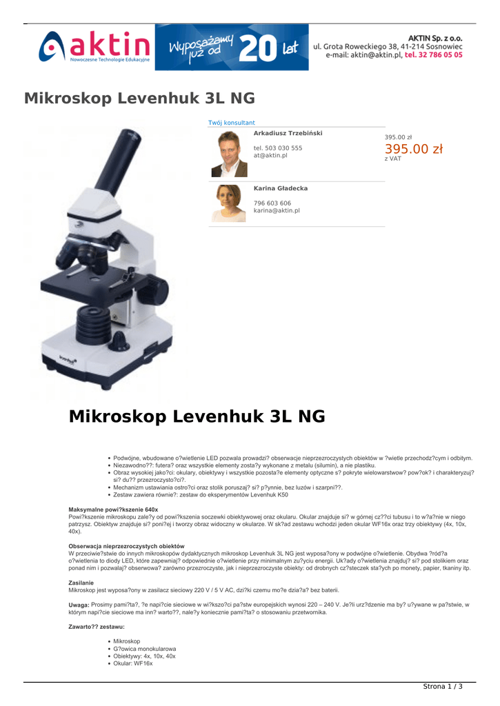 Mikroskop Levenhuk 3L NG Twój konsultant Arkadiusz Trzebiński tel. 503 030 555 [email protected] NOWOŚĆ W OFERCIE 395.00 zł 395.00 zł z VAT Karina Gładecka 796 603 606 [email protected] Mikroskop Levenhuk 3L NG Podwójne, wbudowane o?wietlenie LED pozwala prowadzi? obserwacje nieprzezroczystych obiektów w ?wietle przechodz?cym i odbitym. Niezawodno??: futera? oraz wszystkie elementy zosta?y wykonane z metalu (silumin), a nie plastiku. Obraz wysokiej jako?ci: okulary, obiektywy i wszystkie pozosta?e elementy optyczne s? pokryte wielowarstwow? pow?ok? i charakteryzuj? si? du?? przezroczysto?ci?. Mechanizm ustawiania ostro?ci oraz stolik poruszaj? si? p?ynnie, bez luzów i szarpni??. Zestaw zawiera równie?: zestaw do eksperymentów Levenhuk K50 Maksymalne powi?kszenie 640x Powi?kszenie mikroskopu zale?y od powi?kszenia soczewki obiektywowej oraz okularu. Okular znajduje si? w górnej cz??ci tubusu i to w?a?nie w niego patrzysz. Obiektyw znajduje si? poni?ej i tworzy obraz widoczny w okularze. W sk?ad zestawu wchodzi jeden okular WF16x oraz trzy obiektywy (4x, 10x, 40x). Obserwacja nieprzezroczystych obiektów W przeciwie?stwie do innych mikroskopów dydaktycznych mikroskop Levenhuk 3L NG jest wyposa?ony w podwójne o?wietlenie. Obydwa ?ród?a o?wietlenia to diody LED, które zapewniaj? odpowiednie o?wietlenie przy minimalnym zu?yciu energii. Uk?ady o?wietlenia znajduj? si? pod stolikiem oraz ponad nim i pozwalaj? obserwowa? zarówno przezroczyste, jak i nieprzezroczyste obiekty: od drobnych cz?steczek sta?ych po monety, papier, tkaniny itp. Zasilanie Mikroskop jest wyposa?ony w zasilacz sieciowy 220 V / 5 V AC, dzi?ki czemu mo?e dzia?a? bez baterii. Uwaga: Prosimy pami?ta?, ?e napi?cie sieciowe w wi?kszo?ci pa?stw europejskich wynosi 220 – 240 V. Je?li urz?dzenie ma by? u?ywane w pa?stwie, w którym napi?cie sieciowe ma inn? warto??, nale?y koniecznie pami?ta? o stosowaniu przetwornika. Zawarto?? zestawu: Mikroskop G?owica monokularowa Obiektywy: 4x, 10x, 40x Okular: WF16x Strona 1 / 3 Lusterko Obrotowa diafragma Podwójne wbudowane o?wietlenie LED Zasilacz sieciowy 3 baterie AA Poradnik „Niezwyk?y mikroskop. Badanie mikrokosmosu” P?seta Wyl?garnia s?onaczków Mikrotom (narz?dzie s?u??ce do odcinania plasterków o grubo?ci mniejszej ni? milimetr, które zostan? wykorzystane jako preparat) Fiolka z dro?d?ami Fiolka ze smo?? wykorzystywan? do przygotowywania próbek Fiolka z sol? morsk? Fiolka ze s?onaczkami (organizm morski wykorzystywany jako pokarm dla ryb) Szkie?ka (5 sztuk) 5 próbek: odnó?e muchy domowej, cebula, ?odyga bawe?ny, preparat z pnia drzewa, preparat z sosny Os?on? Przeciwpy?ow? Instrukcja obs?ugi i karta gwarancyjna Niektóre elementy, które mo?esz obejrze? pod mikroskopem: Te i wiele innych preparatów mo?esz znale?? w zestawach gotowych preparatów Levenhuk. Mikroskop Levenhuk 3L NG jest kompatybilny z aparatami cyfrowymi Levenhuk C NG (dost?pnymi osobno). Aparaty Levenhuk C NG instaluje si? w tubusie okularu, w miejsce okularu. G?owica Materia? uk?adu optycznego Powi?kszenie, x Okulary Soczewki obiektywowe Rewolwer Stolik, mm Zakres ruchu stolika, z u?yciem mechanizmu ustawiania ostro?ci, mm O?wietlenie Zasilanie Masa, kg Mikroskop Levenhuk 2L NG Głowica monokularowa Głowica obrotowa Okulary WF16х Obiektywy 4х, 10х, 40х Soczewka Barlowa nie Maksymalne powiększenie, x 640 Stolik 90x90, z zaciskami Zakres ruchu stolika, z użyciem 0 do 10 mechanizmu ustawiania ostrości, mm Regulacja jasności tak Futerał nie Osłonę przeciwpyłową nie Oświetlenie górne zamocowane na stałe Dolne oświetlenie zamocowane na stałe Zasilanie oświetlenia zasilacz AC, baterie Korpus silumin Tubus okularu metalowy Zestaw do eksperymentów nie Levenhuk K50 Poradnik „Niezwykły nie mikroskop. Badanie mikrokosmosu” Pęseta nie Wylęgarnia słonaczków nie Mikrotom nie Fiolka z drożdżami nie Fiolka ze smołą nie Fiolka z solą morską nie Fiolka ze słonaczkami nie 5 próbek: odnóże muchy nie domowej, cebula, łodyga bawełny, preparat z pnia drzewa, preparat z sosny Szkiełka (5 sztuk) nie monokularowa szk?o 64-640 WF16x 4x, 10x, 40x 3 obiektywy 90x90 0 do 10 led 220 V / 5 V, 50 Hz AC (zasilacz) 2 Tabela porównawcza mikroskopów Mikroskop Levenhuk 3L NG monokularowa obrotowa WF16х 4х, 10х, 40х nie 640 90x90, z zaciskami 0 do 10 Mikroskop Levenhuk 40L NG monokularowa obrotowa WF10x, WF16x 4х, 10х, 40х 2x 1280 90x90, z zaciskami 0 do 15 M m o W 4 2 1 9 0 tak nie tak zamocowane na stałe zamocowane na stałe zasilacz AC, baterie silumin metalowy tak tak tak nie zdejmowany zamocowane na stałe zasilacz AC, baterie metalowy metalowy nie t t t z z z m m t tak nie t tak tak tak tak tak tak tak tak nie nie nie nie nie nie nie nie t t t t t t t t tak nie t Strona 2 / 3 Strona 3 / 3 Powered by TCPDF (www.tcpdf.org)