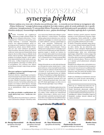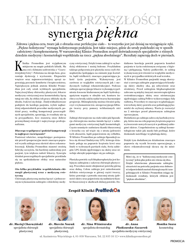 KLINIKA PRZYSZŁOŚCI synergia piękna Zdrowa i piękna cera, twarz jak z obrazka oraz perfekcyjne ciało - to wszystko jest już dzisiaj na wyciągnięcie ręki. „Piękno holistyczne” wymaga holistycznego podejścia. Jest takie miejsce, gdzie do urody podchodzi się w sposób całościowy i komplementarny. W warszawskiej Klinice Promedion zespół doświadczonych specjalistów z różnych dziedzin medycyny i kosmetologii współdziała na rzecz „piękna absolutnego”. Rezultaty zapierają dech w piersiach. K linika Promedion jest wyjątkowym miejscem na mapie polskich klinik. Ma ona coś z klimatu uzdrowiska z “Czarodziejskiej Góry”. Położona na skraju lasu, gwarantuje dyskrecję i wyciszenie. Eleganckie wnętrze oraz najnowocześniejszy sprzęt zapewniają poczucie komfortu i bezpieczeństwa. Największym jednak atutem Kliniki Promedion jest cały sztab wybitnych specjalistów. Najwyższej klasy chirurdzy plastyczni, lekarze medycyny estetycznej oraz kosmetolodzy łączą tutaj swe siły, by efekty ich pracy zbliżały się do ideału. I tak też się dzieje. Zindywidualizowane podejście do każdego pacjenta, wybór najbardziej odpowiednich procedur medycznych, podział pracy, według kompetencji poszczególnych specjalistów, sprawiają, że rezultaty nie są tu przypadkowe, lecz stanowią owoc dobrze przemyślanej strategii i najwyższego profesjonalizmu. Dlaczego współpraca i podział kompetencji to najlepsze rozwiązanie? Ponieważ właściwe, uzupełniające postepowanie przed i pooperacyjne może znacząco poprawić wynik zabiegu oraz skrócić okres rekonwalescencji. Klinika Promedion stanowi swoistą fabrykę szczęścia. Im bardziej zadowolony jest pacjent, tym większa radość lekarzy. Synergia działań poszczególnych specjalistów przekłada się na spektakularne efekty oraz naturalne piękno. Oto kilka przykładów współdziałania chirurgii plastycznej wraz z medycyną estetyczną Chirurgię plastyczną można łączyć z jednoczesnym wykonaniem zabiegów z dziedziny medy- cyny estetycznej. Dzięki temu zabiegi te są bardziej efektowne i mniej bolesne. Przykładem takiego połączenia jest plastyka nosa czyli rhinoplastyka (polegająca na zmianie jego kształtu, bądź wielkości), znacząco poprawiająca jakość życia pacjentów. Wykonywany jest zarówno ze względów estetycznych jak i medycznych (zabiegi rekonstrukcyjne). Podczas zabiegu operacyjnego lekarze wykonują wypełnienia kwasem hialuronowym bądź hydroksyapatytem wapnia w obrębie ust, konturu żuchwy czy brody, tak by nadać twarzy harmonijne proporcje. Rhinoplastykę można również połączyć z wykonaniem tzw. nieoperacyjnego liftingu twarzy przy pomocy wchłanianych nici PDO. Zabiegi chirurgiczne na ciało takie jak liposukcja chirurgiczna można śmiało łączyć z zabiegami medycyny estetycznej bądź kosmetologii. Często usunięcie nadmiaru tkanki tłuszczowej z brzucha czy ud wiąże się z utrata jędrności tych obszarów, bądź pojawieniem się cellulitu. W Klinice Promedion po zabiegu liposukcji zaleca się drenaż limfatyczny LPG, którego działanie polega na poprawie krążenia krwi oraz limfy w wybranych partiach ciała. Seria zabiegów LPG działa ujędrniająco na skórę oraz niweluje obrzęki pojawiające się po zabiegu. Plastyka powiek czyli blepharoplastyka jest kolejnym zabiegiem z zakresu chirurgii plastycznej. Procedura może obejmować powiekę górną oraz dolną. Celem zabiegu jest zniwelowanie defektu estetycznego w górnej części twarzy, który powstaje z powodu znacznej utraty jędrności skóry oraz pojawienia się nadmiaru tkanki tłuszczowej w okolicach dolnej powieki. Do- datkowo korekcja powiek poprawia komfort pacjenta w życiu codziennym związany z higieną i pielęgnacją. Należy podkreślić, że zabieg wykonywany jest również ze względów medycznych w przypadku niektórych wad wzroku. W Klinice Promedion pacjentki mogą skorzystać z szeregu zabiegów poprawiających kondycję skóry okolicy oka, jej odżywienie oraz strukturę. Przed zabiegiem blepharoplastyki zalecane są między innymi: mezoterapia igłowa restrukturyzująca skórę oraz nieinwazyjny ujędrniający zabieg Pelleve wykorzystujący falę radiową. Procedury te znacząco wygładzają powierzchnię skóry powiek oraz pobudzają jej komórki do szybszej odnowy. Warto je rozważyć na 2 miesiące przed planowanym zabiegiem operacyjnym. Dodatkowo po zabiegu zaleca się karboksyterapię, która ma na celu poprawę krążenia poprzez wytworzenie nowych naczyń w poddanej zabiegowi skórze. Uzupełnieniem są zabiegi kosmetologiczne takie jak maski lub peelingi, które doskonale nawilżają i wygładzają skórę. Dzięki tym dodatkowym działaniom znacząco poprawia się wynik leczenia operacyjnego, a okres rekonwalescencji skraca się do minimum. Mówi się, że w “holistycznej medycynie estetycznej” jeden plus jeden nie równa się dwa. Dzięki właściwemu planowaniu zabiegów, otwartości na potrzeby pacjenta oraz doborowi odpowiednich metod chirurgicznych i uzupełniających w Klinice Promedion osiąga się doskonałe rezultaty, których efektem jest “piękno absolutne”. Zespół Kliniki dr. Maciej Charaziński specjalista chirurgii plastycznej dr. Marcin Nowak specjalista chirurgii plastycznej, dr. Nina Wiśniewska specjalista dermatolog dr. Anna Platkowska-Szczerek specjalista medycyny estetycznej Monika Sawa kosmetolog ul. Kazimierza Wóycickiego 4, 01-938 Warszawa, Tel. 22 835 16 12 • www.klinikapromedion.pl PROMOCJA
