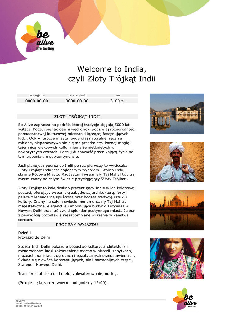 Welcome to India, czyli Złoty Trójkąt Indii data wyjazdu data przyjazdu cena 0000-00-00 0000-00-00 3100 zł ZŁOTY TRÓJKĄT INDII Be Alive zaprasza na podróż, której tradycje sięgają 5000 lat wstecz. Poczuj się jak dawni wędrowcy, podziwiaj różnorodność ponadczasowej kulturowej mieszanki łączącej fascynujących ludzi. Odkryj urocze miasta, podziwiaj naturalne, ręcznie robione, nieporównywalnie piękne przedmioty. Poznaj magię i tajemnicę wiekowych kultur niemalże nietkniętych w nowożytnych czasach. Poczuj duchowość przenikającą życie na tym wspaniałym subkontynencie. Jeśli planujesz podróż do Indii po raz pierwszy to wycieczka Złoty Trójkąt Indii jest najlepszym wyborem. Stolica Indii, sławne Różowe Miasto, Radżastan i wspaniały Taj Mahal tworzą razem znany na całym świecie przyciągający 'Złoty Trójkąt'. Złoty Trójkąt to kalejdoskop prezentujący Indie w ich kolorowej postaci, oferujący wspaniałą zabytkową architekturę, forty i pałace z legendarną spuścizną oraz bogatą tradycję sztuki i kultury. Znany na całym świecie monumentalny Taj Mahal, majestatyczne, eleganckie i imponujące budynki Lutyensa w Nowym Delhi oraz królewski splendor pustynnego miasta Jaipur z pewnością pozostawią niezapomniane wrażenia w Państwa sercach. PROGRAM WYJAZDU Dzień 1 Przyjazd do Delhi Stolica Indii Delhi pokazuje bogactwo kultury, architektury i różnorodności ludzi zakorzenione mocno w historii, zabytkach, muzeach, galeriach, ogrodach i egzotycznych przedstawieniach. Składa się z dwóch kontrastujących, ale i harmonijnych części, Starego i Nowego Delhi. Transfer z lotniska do hotelu, zakwaterowanie, nocleg. (Pokoje będą zarezerwowane od godziny 12:00). BE ALIVE e-mail: [email protected] telefon: 0048 694 692 572 Dzień 2 Delhi - Agra (205 km) Przed południem zwiedzanie Starego Delhi. W Starym Delhi przejedziemy obok Czerwonego Fortu (Red fort), imponującej fortecy z XVII-tego wieku zbudowanej na czerwonych piaskach i otoczonej przez ogromny 33 metrowy graniczny mur. Naprzeciwko Czerwonego Fortu znajduje się Jama Masjid (Meczet Piątkowy) zbudowany z czerwonego piaskowca i białego marmuru w 1656 roku. Jest to największy meczet Indii, gdzie może się modlić ponad 20,000 ludzi. Odwiedzimy Muzeum Gandhi Smriti gdzie Mahatma Gandhi spędził ostatnie 144 dni swojego życia. Te ciche i spokojne miejsce pokazuje różne aspekty życia Mahatmy, jego pomysły, zasady i wartości. Po południu pojedziemy do Agry, miasta Mogołów (islamscy władcy północnych Indii XVI-XIXw.), gdzie można obejrzeć piękne zabytki, majestatyczne budowle oraz słynne wyroby sztuki i rzemiosła. Po przyjeździe do Agra zameldowanie w hotelu. Nocleg w hotelu. Dzień 3 Agra Rankiem odwiedzimy Taj Mahal, piękną budowlę z białego marmuru wzniesioną przez Shah Jahana ku pamięci jego ukochanej żony Mumtaj Mahal. Budowa trwała dwadzieścia dwa lata, a pracowało przy niej dwadzieścia tysięcy robotników. Piękno Taj Mahal oczarowuje i odzwierciedla cudowną architekturę okresu Mogołów. Odwiedzimy też Fort Agra - wybudowany przez władcę Akbara na zachodnim brzegu rzeki Yamuna i przyozdobiony pałacami oraz ogrodami przez Jehangira. Fort Agra dominuje dziś nad centrum miasta. Ma on kształt półksiężyca, a jego wysokie na 20 metrów i długie na 2,4 km zewnętrzne mury to labirynt budynków tworzący małe miasto w dużym mieście. Czas wolny w pozostałej części dnia. Nocleg w hotelu. Dzień 4 Agra - Fatehpur Sikri - Abhaneri - Jaipur (250 km) Rano wyruszymy do Jaipur po drodze odwiedzając Fatehpur Sikri i Abhaneri. Fatehpur Sikri to piękne opuszczone średniowieczne miasto zbudowane przez Wielkiego Akbara w XVI-tym wieku jako BE ALIVE e-mail: [email protected] telefon: 0048 694 692 572 stolica. Zostało ono jednak porzucone przez Mogołów z powodu braku wody. Gdy Akbar wyjechał w 1585 roku miasto nigdy nie odzyskało swojego znaczenia i stało się dobrze zachowanym, najwspanialszym 'miastem -widmem'. Abhaneri znane jest z zadziwiających "schodkowych studni" (Step-wells). Jest to unikatowy wynalazek miejscowej ludności służący zbieraniu deszczówki. Chand Baori jest najpopularniejszą, a także jedną z największych i najbardziej głębokich schodkowych studni Indii. Ta ogromna studnia znajduje się przed świątynią Harshat Mata. Harshat Mata wzniesiono w X-tym wieku, w jej pozostałościach wciąż można zobaczyć bogactwo architektonicznych i rzeźbiarskich stylów dawnych Indii. Po przyjeździe do Jaipur zameldujemy się w hotelu. Jaipur zostało wzniesione przez maharadżę Jai Singha II (1693-1743) i pomalowane na różowo przez maharadżę Man Singha II¸ gdy książę Walii (później król Edward VII) odwiedził Jaipur w 1876. Królewska spuścizna Jaipuru żyje w jego architekturze i kulturze. Różowe miasto symbolizuje gościnność, która dominowała w kulturze Rajput. Nocleg w hotelu. Dzień 5 Jaipur Po śniadaniu udamy się na przejażdżkę na słoniu lub jeepem do Fortu Amber. Fort Amber usytuowany jest na wzniesieniu około jedenaście kilometrów na północ od Jaipur. Amber była stolicą Kuchwaha Rajputs od 1037 do 1728 roku. Man Singh I wybudował ją w stylu, który mógłby rywalizować z wielkością i bogactwem Mogołów. To miasto-pałac jest chronione przez wyniosłe zewnętrzne mury; kolejne mury biegną kilometrami wzdłuż wzgórz otaczających pałac. Po południu wybierzemy się na wycieczkę po mieście Jaipur. Proponujemy zatrzymać się na zrobienie kilku zdjęć w Pałacu Wiatrów (Hawa Mahal), wybudowanego z różowego i czerwonego piaskowca, pięknie wyrzeźbionego z białymi motywami i krawędziami. Odwiedzimy Pałac Miejski (City Palace), połączenie klasycznej architektury Rajasthani i Mughal. Pałac Miejski to duży kompleks zawierający dziedzińce, ogrody i budynki. Znajduje się w nim Chandra Mahal, świątynia Shri Govind Dev oraz pałacowe muzeum. Zwiedzimy również zna