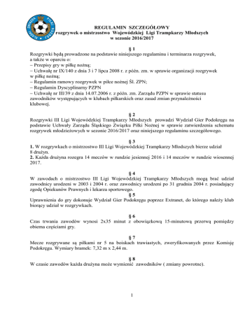 REGULAMIN SZCZEGÓŁOWY rozgrywek o mistrzostwo Wojewódzkiej Ligi Trampkarzy Młodszych w sezonie 2016/2017 §1 Rozgrywki będą prowadzone na podstawie niniejszego regulaminu i terminarza rozgrywek, a także w oparciu o: Przepisy gry w piłkę nożną; Uchwałę nr IX/140 z dnia 3 i 7 lipca 2008 r. z późn. zm. w sprawie organizacji rozgrywek w piłkę nożną; Regulamin ramowy rozgrywek w piłce nożnej Śl. ZPN; Regulamin Dyscyplinarny PZPN Uchwałę nr III/39 z dnia 14.07.2006 r. z późn. zm. Zarządu PZPN w sprawie statusu zawodników występujących w klubach piłkarskich oraz zasad zmian przynależności klubowej. §2 Rozgrywki III Ligi Wojewódzkiej Trampkarzy Młodszych prowadzi Wydział Gier Podokręgu na podstawie Uchwały Zarządu Śląskiego Związku Piłki Nożnej w sprawie zatwierdzenia schematu rozgrywek młodzieżowych w sezonie 2016/2017 oraz niniejszego regulaminu szczegółowego. §3 1. W rozgrywkach o mistrzostwo III Ligi Wojewódzkiej Trampkarzy Młodszych bierze udział 8 drużyn. 2. Każda drużyna rozegra 14 meczów w rundzie jesiennej 2016 i 14 meczów w rundzie wiosennej 2017. §4 W zawodach o mistrzostwo III Ligi Wojewódzkiej Trampkarzy Młodszych mogą brać udział zawodnicy urodzeni w 2003 i 2004 r. oraz zawodnicy urodzeni po 31 grudnia 2004 r. posiadający zgodę Opiekunów Prawnych i lekarza sportowego. §5 Uprawnienia do gry dokonuje Wydział Gier Podokręgu poprzez Extranet, do którego należy klub biorący udział w rozgrywkach. §6 Czas trwania zawodów wynosi 2x35 minut z obowiązkową 15-minutową przerwą pomiędzy obiema częściami gry. §7 Mecze rozgrywane są piłkami nr 5 na boiskach trawiastych, zweryfikowanych przez Komisję Podokręgu. Wymiary bramek: 7,32 m x 2,44 m. §8 W czasie zawodów każda drużyna może wymienić zawodników ( zmiany powrotne). 1 §9 Dopuszcza się możliwość dokumentowania tożsamości zawodnika kserokopią legitymacji szkolnej, potwierdzonej przez WG właściwego Podokręgu. § 10 Zawodnicy wpisani do sprawozdania z zawodów muszą posiadać aktualne karty badań lekarskich. Karta badania lekarskiego jest ważna na okres na jaki wystawi ją lekarz, nie dłużej jednak niż przez okres sześciu miesięcy licząc od daty badania. § 11 1. Zawody muszą być rozegrane zgodnie z terminarzem rozgrywek, który określa datę i godzinę spotkania. W wyznaczonych terminach gospodarz ma prawo do zmiany dnia rozgrywania zawodów (sobota na niedzielę i odwrotnie) oraz wyznaczenia godziny ich rozpoczęcia w przedziale czasowym pomiędzy godziną 10:00 a 18:00 uwzględniając warunki pogodowe i czasowe. 2. Gospodarz zawodów o wszelkich zmianach w terminarzu zobowiązany jest do powiadomienia na piśmie (list polecony, faks lub e-mail zwrotnie potwierdzony) najpóźniej na 14 dni przed zawodami: a) drużynę gości; b) Wydział Gier Podokręgu prowadzącego rozgrywki. c) Kolegium Sędziów Podokręgu. 3. W przypadku wystąpienia o zmianę innych terminów rozgrywek podanych w oficjalnym terminarzu rozgrywek zainteresowany klub musi uzyskać pisemną zgodę przeciwnej drużyny na proponowane zmiany. 4. Zapisy w punktach 1 i 2 mają zastosowanie do dwóch ostatnich terminów rozgrywek podanych w oficjalnym terminarzu rozgrywek, za zgodą Podokręgu prowadzącego rozgrywki. § 12 1. Obsady sędziowskiej dokonuje Kolegium Sędziów Podokręgu, na terenie którego odbywają się zawody. 2. Rozgrywki drużyn III Ligi Wojewódzkiej Trampkarzy Młodszych sędziuje 1 sędzia. WG Podokręgu prowadzącego rozgrywki może na mecze czołówki tabeli wyznaczyć 3 sędziów. 3. Sędziowie prowadzący zawody zobowiązani są do wprowadzenia do ekstranetu wyniku meczu poprzez wysłanie wiadomości SMS na otrzymany z ekstranetu numer w ciągu 30 minut po jego zakończeniu oraz wprowadzenia sprawozdania z zawodów w ciągu 24 godzin od zakończenia spotkania. Niedopełnienie ww. formalności pociąga za sobą konsekwencje dyscyplinarne, określone przez Wydział Dyscypliny. § 13 Obowiązuje Regulamin Dyscyplinarny PZPN. Stosuje się czerwone kartki oraz kary czasowe 2 minutowe, 3 kara 2 minutowa zawodnika powoduje jego wykluczenie z gry. § 14 1. Drużyny, które w rozgrywkach rundy jesiennej oraz rundy wiosennej sezonu 2016/2017 zajmą pierwsze miejsce awansują do II Ligi Wojewódzkiej Trampkarzy Młodszych. W przypadku rezygnacji zespołu awans uzyska drużyna, która zajęła drugie miejsce. 2. W rundzie wiosennej 2017 zespoły rozpoczynają rozgrywki z zerowym dorobkiem punktowym i każda z drużyn rozegra 14 meczów według nowego terminarza. 2 3. Po zakończeniu obu rund sportowych sezonu 2016/2017 do II Ligi Wojewódzkiej Trampkarzy Młodszych nie może awansować zespół, w której uczestniczy w rozgrywkach drużyna tego klubu. 4. Drużyny, które w rundzie jesiennej oraz rundzie wiosennej w sezonie sportowym 2016/2017 zajmą siódme i ósme miejsca spadną do rozgrywek własnego Podokręgu. 5. W przypadku spadku drużyny klubu z II Ligi Wojewódzkiej Trampkarzy Młodszych, zespół tego klubu występujący w III Lidze Wojewódzkiej Trampkarzy Młodszych bez względu na zajęte miejsce zostanie przeniesiony do rozgrywek własnego Podokręgu. § 15 Kluby uczestniczące w rozgrywkach obowiązane są wnieść w terminie do 31 sierpnia 2016 r. opłatę za uczestnictwo w rozgrywkach (wpisowe) na rzecz własnego Podokręgu w wysokości 100,00 złotych od drużyny. § 16 Niniejszy regulamin Zatwierdzono na posiedzeniu Prezydium w dniu 8 sierpnia 2016r. 3