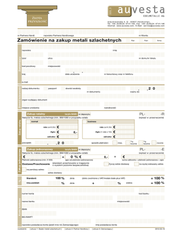 Złota przyszłość nr Partnera Handl. Industriestraße 4, D - 83607 Holzkirchen, Tel. +49 - (0) 80 24 - 47 41-144, Fax. +49 - (0) 80 24 - 47 41-146 Internet: www.auvesta.com, E-Mail: [email protected] nazwisko Partnera Handlowego nr Klienta Zamówienie na zakup metali szlachetnych Zamawiający nazwisko Pan Pani firma imię tytuł ulica nr domu/nr lokalu kod pocztowy miejscowość . kraj data urodzenia . nr kierunkowy oraz nr telefonu Dowód tożsamości e-mail rodzaj dokumentu: paszport nr dokumentu ważny do organ wydający dokument miejsce urodzenia narodowość Zakup ratalny PL- taryfa BA09 nr depozytu: Zakup ratalny Nabycie fiz. metalu szlachetnego (min. 999/1000 w przypadku sztab) normal rata (od € 25): Agio: Zakup jednorazowy początek: € € € rata (od € 25): 0,- Agio (= rata x 12): zaliczka: .2 0 . Zakup jednorazowy € € € sposób płatności: 1/4 rocznie mies. + € Płatność jednorazowa (min. € 500) Dostawa/Przechowanie 1/2 rocznie PL- taryfa BA09 nr depozytu: Nabycie fiz. metalu szlachetnego (min. 999/1000 w przypadku sztab) rocznie -E (wpisać w: przeznaczenie) 0 %€ agio od płatności jednorazowej (standard: przechowanie w magazynie o wysokim poziomie bezpieczeństwa) 0,- € = suma całkowita = płatność jednorazowa + agio Życzę sobie dostawę na wyżej wskazany adres na poniższy adres: adres dostawy Standard: % -R (wpisać w: przeznaczenie) business zaliczka: inny podział: 100 % złota % złota = 100 % = 100 % (złoto zwolnione z VAT/metale białe plus VAT) + % srebra numer konta Konto bankowe .2 0 . dowód osobisty kod banku nazwa banku miejscowość IBAN BIC/SWIFT nazwisko posiadacza konta (jeżeli inne niż Zamawiającego) rozdzielnik: [ arkusz 1: Dealer metali szlachetnych ] [ arkusz 2: Partner Handlowy ] imię posiadacza konta [ arkusz 3: Zamawiający ] 2012-03-16 Konto Przelewy trafią pod wskazane konto (Auvesta Edelmetalle AG, nr ident. podatk. 139/120/00154, nr w rejestrze handlowym HRB177768): PL (Złoty): AUVESTA Edelmetalle AG, Alior Bank, nr konta: 71249000050000453030723554, IBAN PL71249000050000453030723554, BIC ALBPPLPW PL (Euro): AUVESTA Edelmetalle AG, Alior Bank, nr konta: 58249000050000460095712289, IBAN PL58249000050000460095712289, BIC ALBPPLPW DE: AUVESTA Edelmetalle AG, Commerzbank, KTO 040 227 6200, BLZ 700 800 00, IBAN DE66700800000402276200, BIC DRESDEFF700 Oświadczenia Zamawiającego: Zamawiający 1. Potwierdzam wyraźnie, że przeczytałem i sprawdziłem znajdujące się na odwrocie Ogólne Warunki Handlowe. Zrozumiałem niniejsze Ogólne Warunki Handlowe i w związku z tym stanowią one podstawę do zawarcia niżej wymienionej/wymienionych czynności prawnej/ prawnych. 2. Spółce Müller Rechtsanwaltsgesellschaft mbH z siedzibą w Monachium (Niemcy) oferuję w dalszym ciągu zawarcie dołączonej oraz znanej mi umowy dot. kontroli wykorzystanych środków. Zobowiązuję się związać z tą ofertą na okres dwóch tygodni i rezygnuję z dostępu do oświadczenia przyjęcia przez Kontrolera ds. wykorzystanych środków. Najistotniejszą treścią umowy dot. kontroli wykorzystanych środków jest sprawdzenie, czy za wpłacone przeze mnie kwoty pieniężne nabyto zamówione przeze mnie oraz zarządzane i przechowane dla mnie metale szlachetne. W tym celu Kontroler ds. wykorzystanych środków będzie sprawdzał każdorazowy zakup metali szlachetnych przynajmniej raz na kwartał, ze skutkiem na koniec kwartału, i dbał o to, aby zakupiony przeze mnie metal szlachetny, o ile sobie tego życzę, został dla mnie przechowany. Dalsze szczegóły wynikają z załączonej umowy dot. kontroli wykorzystanych środków, której to treść jest mi w pełni znana. 3. Przyjąłem do wiadomości i zgadzam się z tym, iż ani Auvesta Edelmetalle AG ani firmy pośredniczące w sprzedaży nie oferują usług doradczych. Świadczenia tych przedsiębiorstw ograniczają się do pośredniczenia w transakcjach towarowych. 4. Działam we własnym imieniu w imieniu następującej osoby: nazwisko imię adres miejscowość data . .2 0 X podpis Zamawiającego Pouczenie dotyczące wycofania Pouczenie dotyczące wycofania Prawo wycofania Swoje oświadczenia dot. umowy mogą Państwo wycofać bez podania przyczyny w formie pisemnej (np. pismem, telefaksem, emailem) w terminie 14 dni. Termin ten rozpoczyna się w momencie otrzymania niniejszego pouczenia w formie pisemnej, jednakże nie wcześniej, niż w momencie udostępnienia Państwu aktu umowy lub pisemnego wniosku albo kopii aktu umowy lub wniosku oraz przed zawarciem umowy. Do dotrzymania terminu wystarczy punktualne wysłanie wycofania. Wycofanie należy skierować do: AUVESTA Edelmetalle AG, Industriestraße 4, D - 83607 Holzkirchen telefon: +49 - (0) 80 24 - 47 41-144, telefaks: +49 - (0) 80 24 - 47 41-146, e-mail: [email protected] Skutki wycofania W przypadku skutecznego wycofania należy przekazać z powrotem wzajemnie otrzymane świadczenia oraz wzgl. zwrócić uzyskane korzyści (np. odsetki). Jeżeli zwrot otrzymanych świadczeń nie jest możliwy w całości lub częściowo albo zwrot możliwy jest jedynie w stanie pogorszonym, wówczas zobowiązani są Państwo do wniesienia rekompensaty o tej samej wartości. Może to prowadzić do tego, iż będą Państwo zobowiązani do wypełnienia zobowiązania do płatności zgodnie z umową aż do czasu wycofania. Zobowiązanie do zwrotu płatności powinny zostać uregulowane w przeciągu 30 dni. Termin ten rozpoczyna się dla Państwa w momencie wysłania oświadczenia wycofania, dla nas w momencie jego odbioru. Uwagi szczególne Państwa prawo wycofania wygasa przedwcześnie, gdy na Państwa wyraźne życzenie umowa została przez obie Strony wypełniona w całości, zanim skorzystali Państwo z prawa wycofania. Koniec pouczenia dot. wycofania Zapoznałem się: Partner Handlowy miejscowość data . .2 0 X podpis Zamawiającego Oświadczenia Partnera Handlowego: Potwierdzam, iż przekazałem Zamawiającemu kopię niniejszego formularza 