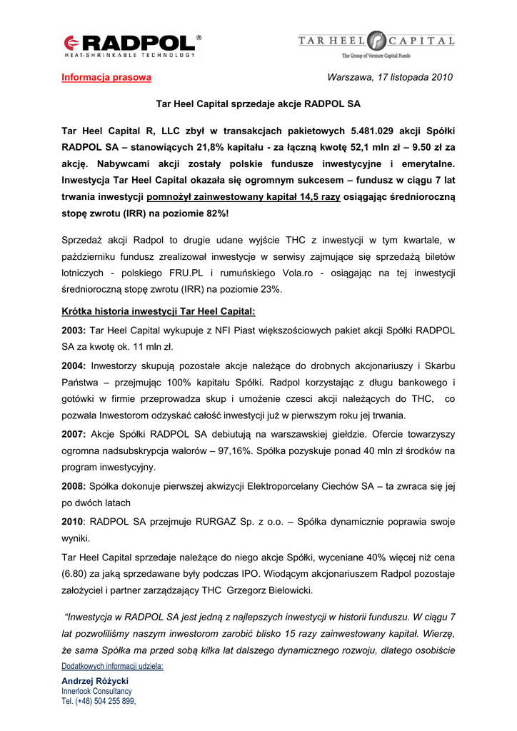 Informacja prasowa Warszawa, 17 listopada 2010 Tar Heel Capital sprzedaje akcje RADPOL SA Tar Heel Capital R, LLC zbył w transakcjach pakietowych 5.481.029 akcji Spółki RADPOL SA – stanowiących 21,8% kapitału - za łączną kwotę 52,1 mln zł – 9.50 zł za akcję. Nabywcami akcji zostały polskie fundusze inwestycyjne i emerytalne. Inwestycja Tar Heel Capital okazała się ogromnym sukcesem – fundusz w ciągu 7 lat trwania inwestycji pomnożył zainwestowany kapitał 14,5 razy osiągając średnioroczną stopę zwrotu (IRR) na poziomie 82%! Sprzedaż akcji Radpol to drugie udane wyjście THC z inwestycji w tym kwartale, w październiku fundusz zrealizował inwestycje w serwisy zajmujące się sprzedażą biletów lotniczych - polskiego FRU.PL i rumuńskiego Vola.ro - osiągając na tej inwestycji średnioroczną stopę zwrotu (IRR) na poziomie 23%. Krótka historia inwestycji Tar Heel Capital: 2003: Tar Heel Capital wykupuje z NFI Piast większościowych pakiet akcji Spółki RADPOL SA za kwotę ok. 11 mln zł. 2004: Inwestorzy skupują pozostałe akcje należące do drobnych akcjonariuszy i Skarbu Państwa – przejmując 100% kapitału Spółki. Radpol korzystając z długu bankowego i gotówki w firmie przeprowadza skup i umożenie czesci akcji należących do THC, co pozwala Inwestorom odzyskać całość inwestycji już w pierwszym roku jej trwania. 2007: Akcje Spółki RADPOL SA debiutują na warszawskiej giełdzie. Ofercie towarzyszy ogromna nadsubskrypcja walorów – 97,16%. Spółka pozyskuje ponad 40 mln zł środków na program inwestycyjny. 2008: Spółka dokonuje pierwszej akwizycji Elektroporcelany Ciechów SA – ta zwraca się jej po dwóch latach 2010: RADPOL SA przejmuje RURGAZ Sp. z o.o. – Spółka dynamicznie poprawia swoje wyniki. Tar Heel Capital sprzedaje należące do niego akcje Spółki, wyceniane 40% więcej niż cena (6.80) za jaką sprzedawane były podczas IPO. Wiodącym akcjonariuszem Radpol pozostaje założyciel i partner zarządzający THC Grzegorz Bielowicki. “Inwestycja w RADPOL SA jest jedną z najlepszych inwestycji w historii funduszu. W ciągu 7 lat pozwoliliśmy naszym inwestorom zarobić blisko 15 razy zainwestowany kapitał. Wierzę, że sama Spółka ma przed sobą kilka lat dalszego dynamicznego rozwoju, dlatego osobiście Dodatkowych informacji udziela: Andrzej Różycki Innerlook Consultancy Tel. (+48) 504 255 899, postanowiłem pozostać jej akcjonariuszem wierząc, że to nadal świetna lokata kapitału zapewniająca stabilny i bezpieczny wzrost wartości.” – powiedział Grzegorz Bielowicki, Partner Zarządzający Tar Heel Capital. RADPOL SA notuje w 2010 roku rekordowe wyniki finansowe. Po trzech kwartałach Spółka osiągnęła 82 mln zł przychodów ze sprzedaży oraz 9 mln zł zysku netto – podwajając wynik z analogicznego okresu roku ubiegłego. Przychody Spółki w czasie inwestycji THC wzrosły 5,7krotnie, EBITDA 5,2krotnie, a zysk netto blisko 10krotnie – wyniki za 2010 rok są wynikami annualizowanymi na podstawie wyników Spółki za III kwartał. Nie stanowią prognozy wyniku, a jedynie wynik pomnożenia wyników za III kwartał przez 12/9. Dodatkowych informacji udziela: Andrzej Różycki Innerlook Consultancy Tel. (+48) 504 255 899, Informacje o firmie: Tar Heel Capital zarządza funduszami typu Private Equity. Tar Heel Capital inwestuje w przedsiębiorstwa, umożliwiając im dalszy dynamiczny rozwój, a w dalszej perspektywie znalezienie inwestora branżowego lub debiut giełdowy. Uwaga Funduszu skupia się w szczególności na firmach o dużych możliwościach ekspansji oraz na przedsięwzięciach związanych z niepowtarzalną technologią i unikalną wiedzą. Wśród inwestycji Tar Heel Capital znajdziemy m.in. notowaną na giełdzie Grupę Kapitałową FAM SA, operatora logistycznego Apreo Logistics SA, spółka zajmująca się przetwarzaniem odpadów z elektrowni na potrzeby budownictwa Greenbet Polska SA. Partnerem Zarządzającym Funduszu i jego założycielem jest Grzegorz Bielowicki. www.tarheelcap.com Dodatkowych informacji udziela: Andrzej Różycki Innerlook Consultancy Tel. (+48) 504 255 899,