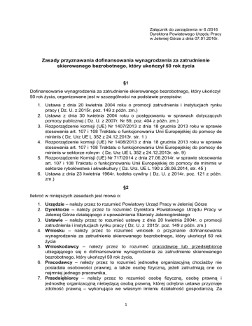 Załącznik do zarządzenia nr 6 /2016 Dyrektora Powiatowego Urzędu Pracy w Jeleniej Górze z dnia 07.01.2016r. Zasady przyznawania dofinansowania wynagrodzenia za zatrudnienie skierowanego bezrobotnego, który ukończył 50 rok życia §1 Dofinansowanie wynagrodzenia za zatrudnienie skierowanego bezrobotnego, który ukończył 50 rok życia, organizowane jest w szczególności na podstawie przepisów: 1. Ustawa z dnia 20 kwietnia 2004 roku o promocji zatrudnienia i instytucjach rynku pracy ( Dz. U. z 2015r. poz. 149 z późn. zm.) 2. Ustawa z dnia 30 kwietnia 2004 roku o postępowaniu w sprawach dotyczących pomocy publicznej ( Dz. U. z 2007r. Nr 59, poz. 404 z późn. zm.) 3. Rozporządzenie komisji (UE) Nr 1407/2013 z dnia 18 grudnia 2013 roku w sprawie stosowania art. 107 i 108 Traktatu o funkcjonowaniu Unii Europejskiej do pomocy de minimis ( Dz. Urz UE L 352 z 24.12.2013r. str. 1 ) 4. Rozporządzenie komisji (UE) Nr 1408/2013 z dnia 18 grudnia 2013 roku w sprawie stosowania art. 107 i 108 Traktatu o funkcjonowaniu Unii Europejskiej do pomocy de minimis w sektorze rolnym ( Dz. Urz UE L 352 z 24.12.2013r. str. 9) 5. Rozporządzenie Komisji (UE) Nr 717/2014 z dnia 27.06.2014r. w sprawie stosowania art. 107 i 108 Traktatu o funkcjonowaniu Unii Europejskiej do pomocy de minimis w sektorze rybołówstwa i akwakultury ( Dz. Urz. UE L 190 z 28.06.2014, str. 45 ) 6. Ustawa z dnia 23 kwietnia 1964r. kodeks cywilny ( Dz. U. z 2014r. poz. 121 z późn. zm.) §2 Ilekroć w niniejszych zasadach jest mowa o: 1. Urzędzie – należy przez to rozumieć Powiatowy Urząd Pracy w Jeleniej Górze 2. Dyrektorze – należy przez to rozumieć Dyrektora Powiatowego Urzędu Pracy w Jeleniej Górze działającego z upoważnienia Starosty Jeleniogórskiego 3. Ustawie – należy przez to rozumieć ustawę z dnia 20 kwietnia 2004r. o promocji zatrudnienia i instytucjach rynku pracy ( Dz. U. z 2015r. poz. 149 z późn. zm.) 4. Wniosku – należy przez to rozumieć wniosek o przyznanie dofinansowania wynagrodzenia za zatrudnienie skierowanego bezrobotnego, który ukończył 50 rok życia 5. Wnioskodawcy – należy przez to rozumieć pracodawcę lub przedsiębiorcę ubiegającego się o dofinansowanie wynagrodzenia za zatrudnienie skierowanego bezrobotnego, który ukończył 50 rok życia, 6. Pracodawcy – należy przez to rozumieć jednostkę organizacyjną chociażby nie posiadała osobowości prawnej, a także osobę fizyczną, jeżeli zatrudniają one co najmniej jednego pracownika, 7. Przedsiębiorcy – należy przez to rozumieć osobę fizyczną, osobę prawną i jednostkę organizacyjną niebędącą osobą prawną, której odrębna ustawa przyznaje zdolność prawną – wykonująca we własnym imieniu działalność gospodarczą. Za 1 przedsiębiorców uznaje się także wspólników spółki cywilnej w zakresie wykonywanej przez nich działalności gospodarczej. 8. Zatrudnieniu – należy przez to rozumieć wykonywanie pracy na podstawie stosunku pracy, stosunku służbowego oraz umowy o pracę nakładczą, 9. Umowie – należy przez to rozumieć umowę zawartą pomiędzy Wnioskodawcą a Powiatem Jeleniogórskim reprezentowanym przez Starostę Jeleniogórskiego z upoważnienia którego działa Dyrektor Powiatowego Urzędu Pracy w Jeleniej Górze. §3 Warunki przyznawania dofinansowania 1. Dofinansowanie przyznaje się Wnioskodawcy, w szczególności jeżeli: 1) prowadzi działalność przez okres co najmniej 6 miesięcy ( do okresu prowadzenia działalności nie wlicza się okresu jej zawieszenia), 2) nie jest w stanie likwidacji lub upadłości, nie toczy się w stosunku do niego postępowanie upadłościowe i likwidacyjne oraz nie został złożony wniosek o otwarcie postępowania likwidacyjnego i upadłościowego, 3) nie zalega z wypłacaniem w terminie wynagrodzeń pracownikom oraz opłacaniem w terminie składek na ubezpieczenia społeczne, zdrowotne, Fundusz Pracy, FGŚ oraz innych danin publicznych, 4) nie posiada nieuregulowanych w terminie zobowiązań cywilnoprawnych, 5) w okresie 6 miesięcy przed złożeniem wniosku nie zmniejszył zatrudnienie z przyczyn dotyczących zakładu pracy, 6) w okresie 365 dni przed dniem złożenia wniosku nie był karany lub skazany prawomocnym wyrokiem za naruszenie przepisów prawa pracy oraz nie jest objęty postępowaniem dotyczącym naruszenia przepisów prawa pracy, 7) zobowiązuje się do dalszego zatrudnienia skierowanego bezrobotnego po upływie okresu przysługiwania dofinansowania wynagrodzenia przez okres: 6 miesięcy , w przypadku bezrobotnych którzy ukończyli 50 lat, a nie ukończyli 60 lat 12 miesięcy w przypadku bezrobotnych, którzy ukończyli 60 lat. 2. Podstawą ubiegania się o dofinansowanie jest złożenie w Urzędzie kompletnego, prawidłowo wypełnionego wniosku wraz z wymaganymi załącznikami, w terminie naboru ogłoszonym przez Urząd. Wzór wniosku stanowi załącznik nr 1 do niniejszych zasad. Wnioski złożone na nieobowiązującym druku nie będą podlegały rozpatrzeniu. 3. Kserokopie dokumentów załączonych do wniosku winny być potwierdzone za zgodność z oryginałem przez osobę uprawnioną do reprezentowania wnioskodawcy. 4. W sytuacji, gdy złożony wniosek nie będzie kompletny i prawidłowo sporządzony Wnioskodawca zostanie powiadomiony pisemnie o możliwości jego uzupełnienia w wyznaczonym przez Urząd terminie. Nieuzupełnienie wniosku w wyznaczonym terminie będzie równoznaczne z jego negatywnym rozpatrzeniem. 5. Urząd może żądać innych dokumentów niż wskazane w druku wniosku, niezbędnych do jego rozpatrzenia. 6. Wniosek podlega rozpatrzeniu w terminie 30 dni od daty złożenia kompletnego i prawidłowo wypełnionego wniosku. O sposobie rozpatrzenia wniosku Urząd informuje Wnioskodawcę pisemnie. 7. W przypadku pozytywnego rozpatrzenia wniosku Dyrektor zawiera z Wnioskodawcą umowę o dofinansowanie wynagrodzenia za zatrudnienie skierowanego bezrobotnego, który ukończył 50 rok życia. 2 8. 