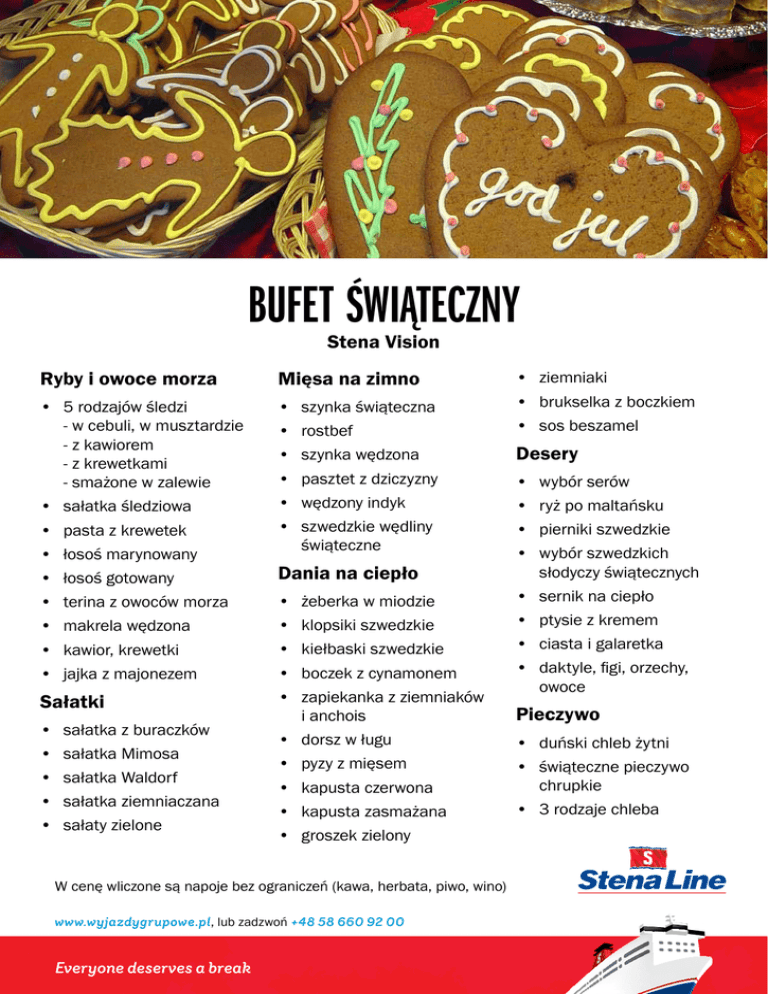 BUFET ŚWIĄTECZNY Stena Vision Ryby i owoce morza Mięsa na zimno • 5 rodzajów śledzi - w cebuli, w musztardzie - z kawiorem - z krewetkami - smażone w zalewie • sałatka śledziowa • pasta z krewetek • łosoś marynowany • łosoś gotowany • terina z owoców morza • makrela wędzona • kawior, krewetki • jajka z majonezem • • • • • • Sałatki • • • • • sałatka z buraczków sałatka Mimosa sałatka Waldorf sałatka ziemniaczana sałaty zielone szynka świąteczna rostbef szynka wędzona pasztet z dziczyzny wędzony indyk szwedzkie wędliny świąteczne Dania na ciepło • • • • • • • • • • żeberka w miodzie klopsiki szwedzkie kiełbaski szwedzkie boczek z cynamonem zapiekanka z ziemniaków i anchois dorsz w ługu pyzy z mięsem kapusta czerwona kapusta zasmażana groszek zielony • ziemniaki • brukselka z boczkiem • sos beszamel Desery • • • • • • • • wybór serów ryż po maltańsku pierniki szwedzkie wybór szwedzkich słodyczy świątecznych sernik na ciepło ptysie z kremem ciasta i galaretka daktyle, figi, orzechy, owoce Pieczywo • duński chleb żytni • świąteczne pieczywo chrupkie • 3 rodzaje chleba W cenę wliczone są napoje bez ograniczeń (kawa, herbata, piwo, wino) www.wyjazdygrupowe.pl, lub zadzwoń +48 58 660 92 00 Everyone deserves a break 20