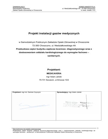 ZAMAWIAJĄCY: Samodzielny Publiczny Zakład Opieki Zdrowotnej w Choszcznie ADRES INWESTYCJI: ul. Niedziałkowskiego 4A , 72-300 Choszczno nr ewid. działki: 515 Projekt instalacji gazów medycznych w Samodzielnym Publicznym Zakładzie Opieki Zdrowotnej w Choszcznie 72-300 Choszczno, ul. Niedziałkowskiego 4A Przebudowa części budynku zaplecza leczniczo- diagnostycznego wraz z dostosowaniem oddziału kardiologicznego do wymogów fachowo – sanitarnych. Projektant: MEDICAVERA mgr Adam Jański 70-731 Szczecin, ul.Smocza 10/2 Projektant: mgr inŜ. Damian Czyczyro Sprawdzający: mgr Adam Jański Opis techniczny do projektu wykonawczego Przebudowa części budynku zaplecza leczniczo-diagnostycznego wraz z dostosowaniem oddziału kardiologicznego do wymogów fachowo– sanitarnych w Samodzielnym Publicznym Zakładzie Opieki Zdrowotnej w Choszcznie. 1 ZAMAWIAJĄCY: Samodzielny Publiczny Zakład Opieki Zdrowotnej w Choszcznie 1. ADRES INWESTYCJI: ul. Niedziałkowskiego 4A , 72-300 Choszczno nr ewid. działki: 515 SPIS TREŚCI 1. SPIS TREŚCI ................................................................................................. 2 2. WYMAGANIA OGÓLNE............................................................................. 3 2.1. Definicje: ................................................................................................. 3 2.2. Podstawa opracowania ............................................................................ 7 2.3. Przedmiot opracowania ........................................................................... 8 2.4. Lokalizacja obiektu.................................................................................. 8 2.5. Wymagania prawne ................................................................................. 8 2.6. Uprawnienia............................................................................................. 9 3. WYMAGANIA KONSTRUKCYJNO – BUDOWLANE .......................... 10 3.1. Ciśnienie rozprowadzania w instalacji .................................................. 10 3.2. Parametry przepływu w punktach poboru............................................. 10 3.3. Inwentaryzacja punktów poboru ........................................................... 11 3.4. Źródła zasilania gazami ......................................................................... 11 3.5. Współczynniki jednoczesności i przepływy obliczeniowe ................... 11 3.6. Rurociągi................................................................................................ 12 3.7. Wytyczne montaŜowe dla rurociągów .................................................. 16 3.8. MontaŜ strefowych zaworów odcinających .......................................... 17 3.9. Sygnalizacja alarmowa .......................................................................... 20 3.10. Oznakowanie rurociągu ..................................................................... 23 3.11. Badania końcowe, instrukcje obsługi, odbiory (atestacja). ............... 23 4. Wartości nieuregulowane niniejszym projektem. ........................................ 28 Opis techniczny do projektu wykonawczego Przebudowa części budynku zaplecza leczniczo-diagnostycznego wraz z dostosowaniem oddziału kardiologicznego do wymogów fachowo– sanitarnych w Samodzielnym Publicznym Zakładzie Opieki Zdrowotnej w Choszcznie. 2 ZAMAWIAJĄCY: Samodzielny Publiczny Zakład Opieki Zdrowotnej w Choszcznie ADRES INWESTYCJI: ul. Niedziałkowskiego 4A , 72-300 Choszczno nr ewid. działki: 515 2. WYMAGANIA OGÓLNE 2.1. Definicje: 2.1.1. awaryjne źródło zasilania źródło zasilania przeznaczone do połączenia z przyłączem awaryjnym 2.1.2. dwustopniowy, rurociągowy system rozprowadzający rurociągowy system rozprowadzający, który ze źródła zasilania jest pierwotnie zasilany gazem o ciśnieniu wyŜszym niŜ nominalne ciśnienie rozprowadzania i to wyŜsze ciśnienie jest następnie obniŜane do nominalnego ciśnienia rozprowadzania za pomocą dodatkowych sieciowych reduktorów ciśnienia. 2.1.3. gaz medyczny gaz lub mieszanina gazów przeznaczona do podawania pacjentom dla celów anestetycznych, terapeutycznych, diagnostycznych lub profilaktycznych 2.1.4. główne źródło zasilania część systemu zasilającego, która zaopatruje rozprowadzający system rurociągowy 2.1.5. ciśnieniowy zawór nadmiarowy urządzenie przeznaczone do zmniejszenia nadmiernego ciśnienia do wcześniej ustalonej wartości 2.1.6. jednostopniowy, rozprowadzający system rurociągowy rozprowadzający system rurociągowy, w którym gaz jest rozprowadzany z systemu zasilającego pod nominalnym ciśnieniem rozprowadzania 2.1.7. konserwacyjne źródło zasilania źródło zasilania przeznaczone do zasilania systemu podczas jego konserwacji 2.1.8. maksymalne ciśnienie rozprowadzania ciśnienie gazu, zmierzone za dowolnym punktem poboru, gdy system rurociągowy pracuje w warunkach zerowego przepływu Opis techniczny do projektu wykonawczego Przebudowa części budynku zaplecza leczniczo-diagnostycznego wraz z dostosowaniem oddziału kardiologicznego do wymogów fachowo– sanitarnych w Samodzielnym Publicznym Zakładzie Opieki Zdrowotnej w Choszcznie. 3 ZAMAWIAJĄCY: Samodzielny Publiczny Zakład Opieki Zdrowotnej w Choszcznie ADRES INWESTYCJI: ul. Niedziałkowskiego 4A , 72-300 Choszczno nr ewid. działki: 515 2.1.9. minimalne ciśnienie rozprowadzania najniŜsze ciśnienie gazu, zmierzone za dowolnym punktem poboru, gdy system rurociągowy pracuje w warunkach przepływu obliczeniowego 2.1.10. nominalne ciśnienie rozprowadzania ciśnienie, jakie system rurociągowy do gazów medycznych ma zapewnić w punktach poboru 2.1.11. nominalne ciśnienie systemu zasilającego ciśnienie, jakie system zasilający ma zapewnić na wlocie sieciowych reduktorów ciśnienia 2.1.12. odbiór końcowy sprawdzanie działania systemu w celu zweryfikowania, Ŝe uzgodniona specyfikacja systemu została spełniona i