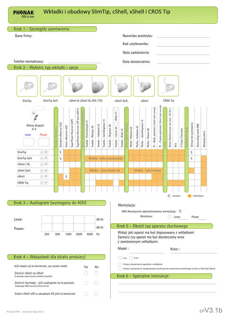 Wkładki i obudowy SlimTip, cShell, xShell i CROS Tip Krok 1 - Szczegóły zamówienia Dane firmy: Nazwisko protetyka: Phonak C Kod użytkownika: Data zamówienia: Telefon kontaktowy: Data dostarczenia: Krok 2 - Wybierz typ wkładki i opcje SlimTip L P S SlimTip Soft L P S cShell / XL L P cShell Soft L P xShell L P CROS Tip L P Obudowa pełna Ekstra długi kanał (XR) Uchwyt do wyjmowania C-Stop / Cerustop S Miękka - tylko przezroczysta S Miękka - tylko różowa Miękka - tylko różowa 26 S S Krok 3 – Audiogram (wymagany do AOV) standard Lewe: dB HL Prawe: dB HL 500 1000 2000 4000 Hz Określona: Krok 4 – Wskazówki dla działu produkcji Zmienić xShell na cShell (z powodu ograniczonej wielkości kanału)) Tak Lewe Prawe Wskaż jaki aparat ma być dopasowany z wkładkami Zaznacz czy aparat być dostarczony Step 5 ma – Custom EarPieceswraz Order z zamówionymi wkładkami. 1 szt. Nie S Krok 5 – Określ typ aparatu słuchowego Model : Jeśli okaże się to konieczne, czy serwis może: niedostępne Wentylacja: AOV Akustycznie optymalizowana wentylacja: 250 Dodatkowe opcje HF3 Smart Guard (niedost. dla słuch. SP/ SP+ ) Pł. - Czarna przezrocz. (cShell tylko twarda) Flitry Pł. - Bezb. przezrocz. (cShell tylko twarda) Płytka – Brown 28 Płytka – Jasnobrązowa 14 Płytka – Kakaowa 22 Płytka – Różowa 26 Kolor płytki czołowej Twarda – Biała 19 Twarda – Czerw 36 CROS Tip xShell /Nieb 37 cShell Soft Twarda – Brązowa 28 Twarda – Jasnobrązowa 14 Twarda – Kakaowa 22 Twarda – Różowa 26 Twarda - Przezroczysta 21 Kolor obudowy (miękka/twarda) SuperPower Receiver xSP plus (xSP+) SuperPower Receiver (xSP) Prawe Power xReceiver (xP) Lewe cShell & cShell XL (HS / FS) Standard xReceiver (xS) Wskaż długość 0-3 Rodzaj słuchawki SlimTip Soft SlimTip Kolor : 2 szt. Proszę o dostarczenie aparatów z wkładkami Proszę o dostarczenie standardowych słuchawek do zamówienia określonego w kroku 2 (SlimTip/ xShell) Krok 6 – Specialne instrukcje: Zmienić słuchwkę - jeśli audiogram na to pozwala (włączając 6dB rezerwę wzmocnienia) Zrobić cShell xSP w obudowie HS jeśli to konieczne Phonak CPS - formularz lipiec 2012 V3.1b EP Wkładki i obudowy SlimTip, cShell, xShell i CROS Tip Dodatkowe informacje Przewodnik wyboru wkładki Wielkość ubytku słuchu Natychmiastowe dopasowanie Lekkie do średnich Standard xReceiver Opcjonalny rodzaj indywidualnej wkładki Power xReceiver SuperPower xReceiver SuperPower plus Receiver Nakładki Nakładki otwarta Najwyższy komfort i trwałość Indywidualne wkładki Średnie do ciężkich zamknięta zamknięta power cShell/ cShell miękka SlimTip/ SlimTip miękka Również z ekstra długim kanałem twarda lub miękka obudowa cShell/ cShell miękka xShell twarda lub miękka obudowa Rozwiązanie modułowe cShell z słuchawką SP/ SP plus Wymagana dodatkowa moc tylko twarda obudowa Matryca kompatybilności aparatów słuchowych Aparaty z technologią słuchawki kanałowej Aparaty z dźwiękowodami Możliwe Niemożliwe xS Standard xReceiver xP Power xReceiver xSP SuperPower Receiver Wkładki indywidualne xSP plus Uwaga: SuperPower plus Receiver SlimTip/ Slim Tip Miękka cShell Twarda cShell Miękka xShell Audéo S & Audéo MINI/ SMART/ YES Naida S CRT micro BTE/ BTE Kompatybilne słuchawki Audéo S Audéo xS xS, xP, xSP xS, xP xP xS xS xS, xP xS xP xSP+ xS, xP xS xP xP SlimTube/ Power SlimTube xP Wszystkie wkładki indywidualne z AOV będą dostarczane ze specjalnym kodem - Coupling Code, który musi być wprowadzony w Target/iPFG, aby uaktywnić i wykorzystać cechy AOV (Akustycznie Optymalizowana Wentylacja) w procesie dopasowania. Phonak CPS - formularz lipiec 2012 V3.1b EP