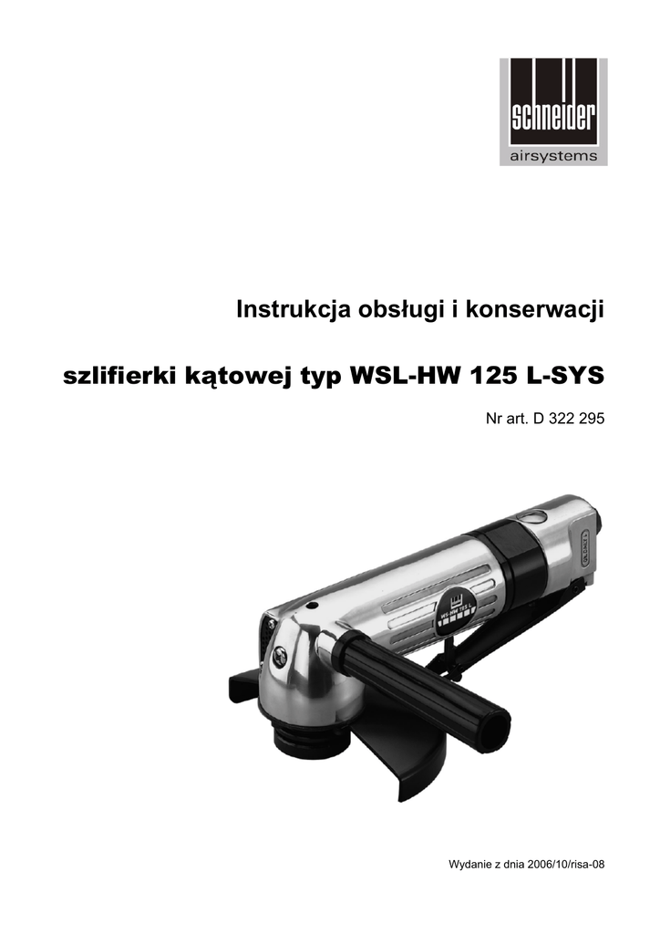 Instrukcja obsługi i konserwacji szlifierki kątowej typ WSL-HW 125 L-SYS Nr art. D 322 295 Wydanie z dnia 2006/10/risa-08 Bardzo dziękujemy za zaufanie, jakim obdarzyli Państwo nas i nasze produkty. Prosimy przeczytać najpierw dokładnie niniejszą instrukcję obsługi i konserwacji, zanim przystąpią Państwo do pracy ze szlifierką kątową. Poniższa instrukcja zawiera ważne wskazówki, konieczne dla zapewnienia bezpiecznej pracy bez zakłóceń. Dlatego też instrukcja ta zawsze powinna być dołączona do szlifierki. Ważne wskazówki Zalecamy: kontroli, regulacji oraz konserwacji szlifierki kątowej powinna dokonywać zawsze ta sama osoba lub delegowani przez nią przedstawiciele, a ponadto prace te powinny być dokumentowane w książce konserwacji. W przypadku pytań prosimy o podawanie numeru seryjnego, numer artykułu oraz oznaczenia szlifierki. Posługiwanie się instrukcją Dla zapewnienia przejrzystości niniejszej instrukcji oraz szybkiej orientacji, ważne oraz praktyczne wskazówki opatrzone zostały symbolami. Symbole te umieszczone są obok fragmentów tekstu (odnoszą się do tekstu), ilustracji (odnoszą się do danej ilustracji) lub na początku strony (odnoszą się do treści całej strony). Jeśli szlifierka kątowa eksploatowana jest poza terenem Niemiec, w kwestii jej eksploatacji mogą obowiązywać inne przepisy ustaw i rozporządzeń niż wymienione w niniejszej instrukcji obsługi. Uwaga: symbole te należy traktować z najwyższą uwagą! Znaczenie symboli Przeczytać instrukcję obsługi! Użytkownik zobowiązany jest do przestrzegania instrukcji obsługi oraz do poinstruowania wszystkich użytkowników szlifierki na temat zasad jej eksploatacji zgodnie z niniejszą instrukcją obsługi. Uwaga! Tym symbolem oznakowane są ważne opisy, informacje o niebezpiecznych warunkach, zagrożeniach lub wskazówki dotyczące bezpieczeństwa. Jakie czynności i warunki są absolutnie konieczne: Podczas pracy ze szlifierką kątową używać specjalnych środków ochronnych, zwłaszcza nauszników przeciwhałasowych, siatki na włosy, okularów ochronnych, rękawic roboczych i maski oddechowej oraz, w zależności do rodzaju prac szlifierskich, maski ochronnej na twarz, skórzanego fartucha i obuwia ochronnego. Przestrzegać wskazówek dotyczących bezpieczeństwa! _____________________ 2 Schneider Druckluft Spis treści 1. Dane techniczne ........................................................................ 3 2. Zakres dostawy ..........................................................................3 3. Ilustracja szlifierki kątowej.......................................................... 4 4. Użytkowanie zgodnie z przeznaczeniem ................................... 4 4.1 Właściwości ......................................................................... 4 5. Wskazówki dotyczące bezpieczeństwa ..................................... 5 6. Uruchamianie .............................................................................6 7. Konserwacja .............................................................................. 7 8. Usuwanie nieprawidłowości ....................................................... 7 9. Warunki gwarancji...................................................................... 8 10. Wyposażenie............................................................................ 8 11. Rysunek aksonometryczny i lista części zamiennych ……….. 9 11.1 Rysunek aksonometryczny szlifierki kątowej typ WSL-HW 125 L........................................................... 9 11.2 Lista części zamiennych szlifierki kątowej typ WSL-HW 125 L........................................................... 10 12. Deklaracja zgodności z normami WE ...................................... 11 13. Adres........................................................................................ 12 1. Dane techniczne Moc: Prędkość obrotowa: Średnie zużycie powietrza: Maks. średnica krążka szlifierskiego: Gwint wrzeciona: Maks. dopuszczalne ciśnienie robocze: Poziom ciśnienia akustycznego LPA 1 m (w odległości 1 m) wg DIN 45 635 cz. 20: Moc akustyczna impulsowa LWA 1 wg DIN 45 635, cz. 20: Poziom wibracji DIN ISO 8662: Zalecana średnica przewodu (wewnętrzna) przy dł. = 10 m: Wymiary szer. x głęb. x wys.: Ciężar: 2. Zakres dostawy 0,75 11000 380 125 M14 6,3 89 kW obr/min l/min mm 96 dB (A) 8,9 9 m/s2 mm 250 x 85 x 205 1,8 mm kg bar dB (A) Wymagania jakościowe dla powietrza: Powietrze pozbawione kondensatu, oczyszczone, rozpylona mgła olejowa. Przez jednostkę konserwacyjną z reduktorem ciśnienia z naolejaczem mgłowym. Wydajność efektywna sprężarki: Sprężarka o wydajności wyjśc. 450 l/min (co odpowiada mocy silnika od ok. 3 kW). Nastawne parametry robocze: Nastawne ciśnienie robocze (ciśnienie przepływu) na reduktorze ciśnienia 6 bar. 1 szlifierka kątowa typ WSL-HW 125 L 1 Systainer 1 klucz szczękowy 1 klucz widełkowy 1 okulary ochronne 1 olej 1 karta gwarancyjna 1 instrukcja obsługi szlifierki kątowej typ WSL-HW 125 L-SYS _____________________ Schneider Druckluft 3 3. Ilustracja szlifierki kątowej 4. Użytkowanie zgodnie z przeznaczeniem Poz. 0030 0040 0270 0370 0550 Nr art. G 407 049 G 407 053 G 420 151 G 407 003 G 407 006 Opis Złączka redukcyjna 3/8”a x 1/4"i Spust kompl. Śruba M6 x 6,0 Osłona talerza szlifierskiego Boczna rękojeść Ilość 1 1 1 1 1 Szlifierka kątowa typ WSL-HW 125 L to poręczna, pneumatyczna szlifierko-przecinarka dla rzemiosła Idealnie nadaje się do szlifowania, tępienia krawędzi, odrdzewiania i cięcia różnych materiałów. 4.1 Właściwości Szlifierka kątowa jest niezwykle poręczna. Jej niewielki ciężar i kompaktowa budowa umożliwiają niemęczącą pracę. Dodatkowa boczna rękojeść (poz. 0550) pozwala na optymalne operowanie szlifierką. Osłona talerza szlifierskiego (poz. 0370) zapewnia użytkownikowi maksymalne bezpieczeństwo. Blokada bezpieczeństwa przy spuści