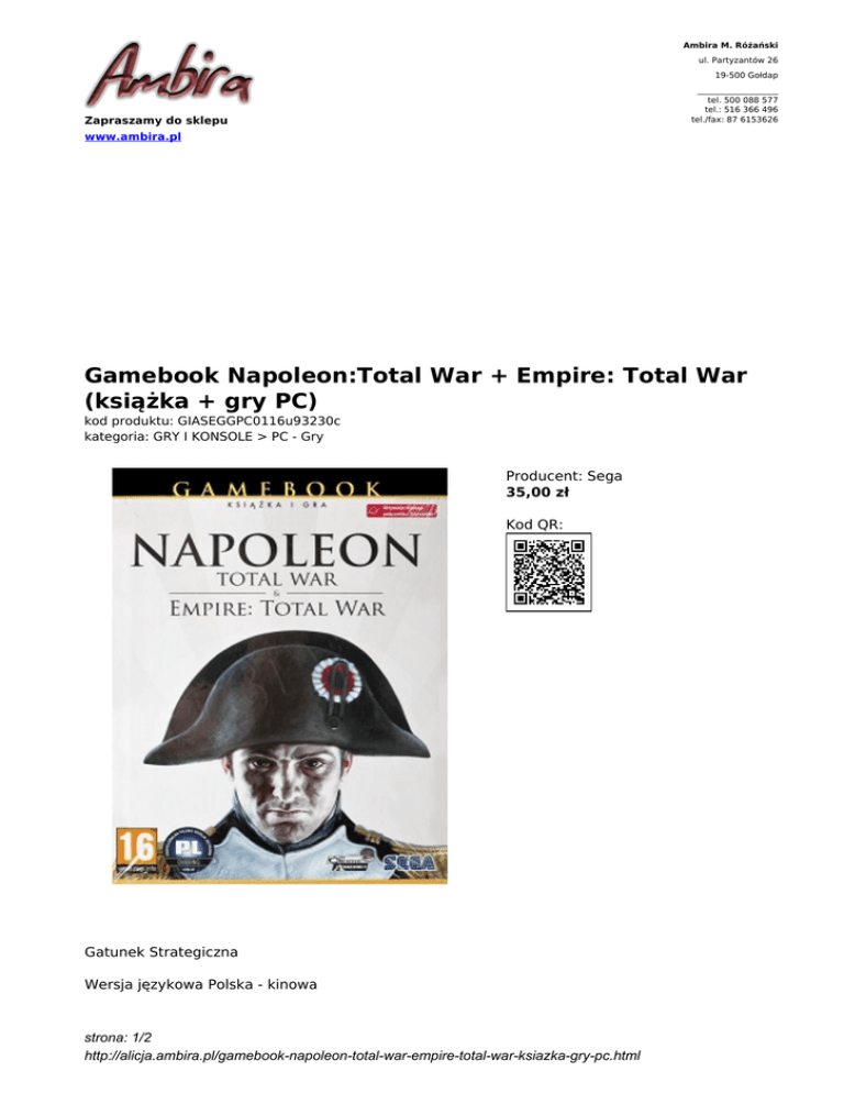 Ambira M. Różański ul. Partyzantów 26 19-500 Gołdap ___________________ tel. 500 088 577 tel.: 516 366 496 tel./fax: 87 6153626 Zapraszamy do sklepu www.ambira.pl Gamebook Napoleon:Total War + Empire: Total War (książka + gry PC) kod produktu: GIASEGGPC0116u93230c kategoria: GRY I KONSOLE > PC - Gry Producent: Sega 35,00 zł Kod QR: Gatunek Strategiczna Wersja językowa Polska - kinowa strona: 1/2 http://alicja.ambira.pl/gamebook-napoleon-total-war-empire-total-war-ksiazka-gry-pc.html Kategoria wiekowa od: 16lat Wymagania sprzętowe Aktywacja gry wymaga połączenia z Internetem. KINECT/MOVE nie współpracuje Nośnik Płyta DVD Informacje dodatkowe Produkt objęty stawką VAT 5%. www www.cdprojekt.pl strona: 2/2 http://alicja.ambira.pl/gamebook-napoleon-total-war-empire-total-war-ksiazka-gry-pc.html