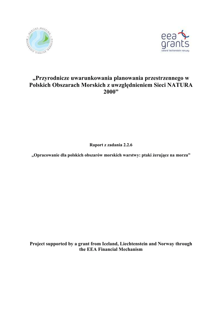 „Przyrodnicze uwarunkowania planowania przestrzennego w Polskich Obszarach Morskich z uwzględnieniem Sieci NATURA 2000” Raport z zadania 2.2.6 „Opracowanie dla polskich obszarów morskich warstwy: ptaki Ŝerujące na morzu” Project supported by a grant from Iceland, Liechtenstein and Norway through the EEA Financial Mechanism „Przyrodnicze uwarunkowania planowania przestrzennego w Polskich Obszarach Morskich z uwzględnieniem Sieci NATURA 2000” Główny wykonawca: Lech Stempniewicz Katedra Ekologii i Zoologii Kręgowców, Uniwersytet Gdański Gdańsk, marzec 2007 Na podstawie bezpośrednich obserwacji stworzono mapę liczebności zimujących ptaków (kaczek morskich). Dane zostały zebrane dla czterech gatunków: 1. 2. 3. 4. Lodówka Clangula hyemalis Edredon Somateria mollissima Uchla Melanitta fusca Markaczka Melanitta nigra Oddzielnie przedstawiono oznaczenia niepewne: 5. Melanitta sp. Dodatkowo przedstawiono łączne liczebności osobników wszystkich obserwowanych gatunków. Liczenia zostały przeprowadzone w trzech zdefiniowanych strefach. KaŜda ze stref podzielona była na sektory. I. Pierwsza obejmowała pas brzegu i morza szerokości jednego kilometra. Strefę tą podzielono na 33 sektory. II. Druga obejmowała przylegający do brzegu pas morza o szerokości dwunastu mil (wody terytorialne Polski). Obszar ten podzielono na 9 sektorów. III. Strefa trzecia obejmowała Ławicę Słupską i Ławicę Odrzaną. Obserwacje dotyczące pasa wybrzeŜa szerokości jednego km zostały przeprowadzone z lądu. Liczenia dotyczące pasa szerokości dwunastu mil i ławic zostały przeprowadzone z pokładu statku. Bezwzględne liczebności zostały przeliczone na zagęszczenie [os. * km-2] i podane dla kaŜdej ze stref. Uzyskane wyniki zostały przedstawione na mapach. Zagęszczenie danego gatunku przedstawiono za pomocą skali barwnej. Dodatkowo na kaŜdej z map umieszczono tabele z zagęszczeniami osobników [os. * km-2] danego gatunku w kaŜdym z sektorów jednej z trzech stref. Wsparcie udzielone przez Islandię, Liechtenstein i Norwegię poprzez dofinansowanie ze środków Mechanizmu Finansowego Europejskiego Obszaru Gospodarczego „Przyrodnicze uwarunkowania planowania przestrzennego w Polskich Obszarach Morskich z uwzględnieniem Sieci NATURA 2000” Dostarczone produkty Produkt Birds Rodzaj SHP Opis Shapefile typu poligon. Pola: Zone_No – numer sektora, Date – data pomiarów, CLAHYE – liczebność Clangula hyemalis, MELFUS – liczebność Melanitta fusca, MELNIG – liczebność Melanitta nigra, SOMMOL – liczebność Somateria mollissima, Melanitta – liczebność Melanitta sp., SpeciesSUM – liczebność sumaryczna, DensClahye – zagęszczenie Clangula hyemalis, DensMelfus – zagęszczenie Melanitta fusca, DensMelnin – zagęszczenie Melanitta nigra, DensSomm – zagęszczenie Somateria mollissima, DensMelani – zagęszczenie Melanitta sp., DensSUM – zagęszczenie sumaryczne Wsparcie udzielone przez Islandię, Liechtenstein i Norwegię poprzez dofinansowanie ze środków Mechanizmu Finansowego Europejskiego Obszaru Gospodarczego 2.2.6 Task report Study for Polish maritime areas – class: birds feeding at sea 55°30'N Clangula hyemalis 55°0'N Slupsk Bank 106 202 23 ! 24 ! 25 ! 22 ! Dębki Karwia Rozewie ! Białogóra Map prepared by: Lucyna Kryla, GIScience Laboratory 105 21 Lubiatowo 20 19 ! ! ! Czołpino 18 17 15 ! Rewa Rowy ! 108 Ustka 201 102 7 6 101 5 4 1 Świnoujście ! 3 2 14 103 ! Dziwnów ! 8 Mrzeżyno ! 9 Dźwirzyno 10 ! Kołobrzeg ! ! 11 Sarbinowo 12 ! 13 Jarosławiec 109 ! Sopot ! Darłówko Gdańsk ! Mikoszewo Dąbki 30 31 ! Jantar 32 ! Krynica Morska ! Kąty Rybackie ! Łazy Mielno Ustronie Morskie 54°0'N ! Pogorzelica Zone ! Pobierowo Wisełka ! Międzyzdroje 15°0'E ! Piaski 33 29 ! ! 14°30'E 54°30'N Gdynia ! ! Odra Bank Hel ! ! 16 27 Jurata ! ! 104 107 26 Kuźnica 28 Łeba 15°30'E 16°0'E 16°30'E 1 2 3 4 5 6 7 8 9 10 11 12 13 14 15 16 17 [ind* km -2] 0,00 0,16 2,78 2,19 1,35 1,77 3,24 3,46 10,98 3,73 1,38 1,51 0,09 0,00 0,00 3,34 2,96 17°0'E Zone 18 19 20 21 22 23 24 25 26 27 28 29 30 31 32 33 [ind* km -2] 13,53 11,42 1,99 0,75 12,98 4,11 7,08 19,13 17,35 19,51 1,56 13,01 2,32 0,16 1,47 9,93 Zone Zone 101 102 103 104 105 106 107 108 109 201 202 Legend [ind* km ] -2 [ind* km -2] 1,84 3,16 0,82 0,09 0,39 2,02 0,50 5,70 0,48 NoData 0 0-5 5 - 10 ´ 10 - 20 [ind* km -2] 11,20 3,32 0 17°30'E 18°0'E 18°30'E 19°0'E 5 10 53°30'N 20 km 19°30'E 20°0'E 2.2.6 Task report Study for Polish maritime areas – class: birds feeding at sea 55°30'N Somateria molissima 55°0'N Slupsk Bank 106 202 23 ! 24 ! 25 ! 22 ! Dębki Karwia Rozewie ! Białogóra Map prepared by: Lucyna Kryla, GIScience Laboratory 105 21 Lubiatowo 20 19 ! ! ! Czołpino 18 17 15 ! Rewa Rowy ! 108 Ustka 201 102 ! 8 7 Mrzeżyno 6 101 5 4 1 Świnoujście ! 3 2 ! 14 103 Dziwnów ! 9 Dźwirzyno 10 ! Kołobrzeg ! ! 11 Sarbinowo 12 ! 13 Jarosławiec 109 ! Sopot ! Darłówko Gdańsk ! Mikoszewo Dąbki 30 31 ! Jantar 32 ! Krynica Morska ! Kąty Rybackie ! Łazy Mielno Ustronie Morskie 54°0'N ! Pogorzelica Zone ! Pobierowo Wisełka ! Międzyzdroje 15°0'E ! Piaski 33 29 ! ! 14°30'E 54°30'N Gdynia ! ! Odra Bank Hel ! ! 16 27 Jurata ! ! 104 107 26 Kuźnica 28 Łeba 15°30'E 16°0'E 16°30'E 1 2 3 4 5 6 7 8 9 10 11 12 13 14 15 16 17 [ind* km -2] 0,00 0,00 8,46 3,81 0,51 0,07 0,00 0,00 0,00 0,00 0,14 0,17 0,00 0,09 0,00 0,12 0,09 17°0'E Zone 18 19 20 21 22 23 24 25 26 27 28 29 30 31 32 33 [ind* km -2] 0,00 0,00 0,05 0,00 0,00 0,00 0,00 0,13 0,04 4,32 0,00 0,61 0,00 0,00 0,00 0,00 Zone Zone 101 102 103 104 105 106 107 108 109 201 202 Legend [ind* km ] -2 [ind* km -2] 0,00 0,00 0,00 0,00 0,00 0,00 0,00 0,02 0,00 NoData 0 0-5 5 - 10 ´ [ind* km -2] 0,00 0,00 0 17°30'E 18°0'E 18°30'E 19°0'E 5 10 53°30'N 20 km 19°30'E 20°0'E 2.2.6 Task report Study for Polish maritime areas – class: birds feeding at sea 55°30'N Melanitta nigra 55°0'N Slupsk Bank 106 202 23 ! 24 ! 25 ! 22 ! Dęb