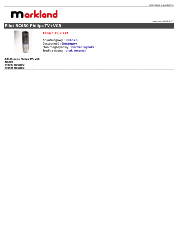 Informacje o produkcie Utworzono 03-03-2017 Pilot RC650 Philips TV+VCR Cena : 15,73 zł Nr katalogowy : 004578 Dostępność : Dostępny Stan magazynowy : bardzo wysoki Średnia ocena : brak recenzji -RT105 nowe Philips TV+VCR -NS200 -IR8397 RUWIDO -IR8405 RUWIDO
