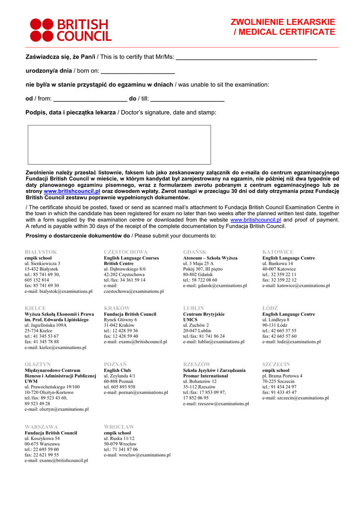 ZWOLNIENIE LEKARSKIE / MEDICAL CERTIFICATE Zaświadcza się, że Pan/i / This is to certify that Mr/Ms: __________________________________________ urodzony/a dnia / born on: ______________________ nie był/a w stanie przystąpić do egzaminu w dniach / was unable to sit the examination: od / from: ______________________ do / till: ______________________ Podpis, data i pieczątka lekarza / Doctor’s signature, date and stamp: Zwolnienie należy przesłać listownie, faksem lub jako zeskanowany załącznik do e-maila do centrum egzaminacyjnego Fundacji British Council w mieście, w którym kandydat był zarejestrowany na egzamin, nie później niż dwa tygodnie od daty planowanego egzaminu pisemnego, wraz z formularzem zwrotu pobranym z centrum egzaminacyjnego lub ze strony www.britishcouncil.pl oraz dowodem wpłaty. Zwrot nastąpi w przeciągu 30 dni od daty otrzymania przez Fundację British Council zestawu poprawnie wypełnionych dokumentów. / The certificate should be posted, faxed or send as scanned mail’s attachment to Fundacja British Council Examination Centre in the town in which the candidate has been registered for exam no later than two weeks after the planned written test date, together with a form supplied by the examination centre or downloaded from the website www.britishcouncil.pl and proof of payment. A refund is payable within 30 days of the receipt of the complete documentation by Fundacja British Council. Prosimy o dostarczenie dokumentów do / Please submit your documents to: BIAŁYSTOK CZĘSTOCHOWA empik school ul. Sienkiewicza 3 15-432 Białystok tel.: 85 741 69 30, 605 152 814 fax: 85 741 69 30 e-mail: [email protected] English Language Courses British Centre ul. Dąbrowskiego 8/6 42-202 Częstochowa tel./fax: 34 361 59 14 e-mail: [email protected] Ateneum – Szkoła Wyższa ul. 3 Maja 25 A Pokój 307, III piętro 80-802 Gdańsk tel.: 58 722 08 60 e-mail: [email protected] KIELCE KRAKÓW LUBLIN ŁÓDŹ Fundacja British Council Rynek Główny 6 31-042 Kraków tel.: 12 428 59 36 fax: 12 428 59 40 e-mail: [email protected] Centrum Brytyjskie UMCS ul. Zuchów 2 20-047 Lublin tel./fax: 81 741 86 24 e-mail: [email protected] English Language Centre ul. Lindleya 8 90-131 Łódz tel.: 42 665 57 55 fax: 42 665 57 60 e-mail: [email protected] POZNAŃ RZESZÓW SZCZECIN Wyższa Szkołą Ekonomii i Prawa im. Prof. Edwarda Lipińskiego ul. Jagiellońska 109A 25-734 Kielce tel.: 41 345 53 67 fax: 41 345 78 88 e-mail: [email protected] OLSZTYN Międzynarodowe Centrum Biznesu i Administracji Publicznej UWM ul. Prawocheńskiego 19/100 10-720 Olsztyn-Kortowo tel./fax: 89 523 43 60, 89 523 49 28 e-mail: [email protected] English Club ul. Zeylanda 4/1 60-808 Poznań tel. 605 893 938 e-mail: [email protected] WARSZAWA WROCŁAW Fundacja British Council ul. Koszykowa 54 00-675 Warszawa tel.: 22 695 59 00 fax: 22 621 99 55 e-mail: [email protected] empik school ul. Ruska 11/12 50-079 Wrocław tel.: 71 341 87 06 e-mail: [email protected] GDAŃSK Szkoła Języków i Zarządzania Promar International ul. Bohaterów 12 35-112 Rzeszów tel./fax: 17 853 09 97, 17 852 06 95 e-mail: [email protected] KATOWICE English Language Centre ul. Bankowa 14 40-007 Katowice tel.: 32 359 22 11 fax: 32 359 22 12 e-mail: [email protected] empik school pl. Brama Portowa 4 70-225 Szczecin tel.: 91 434 24 97 fax: 91 433 45 47 e-mail: [email protected]